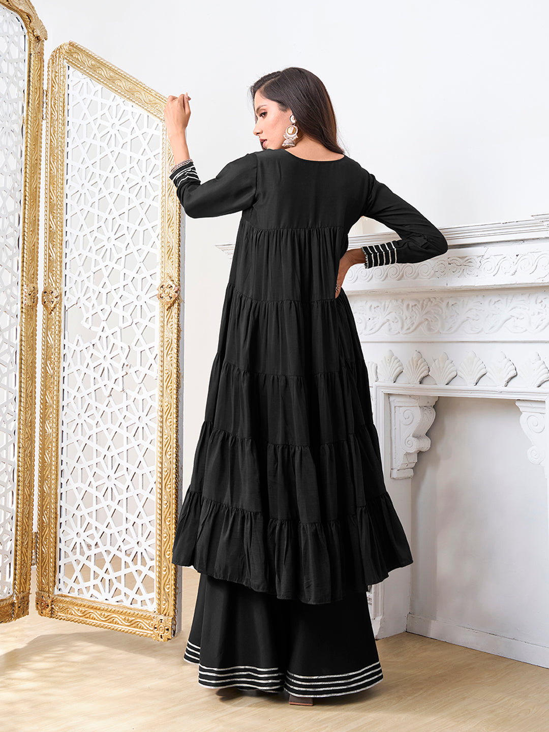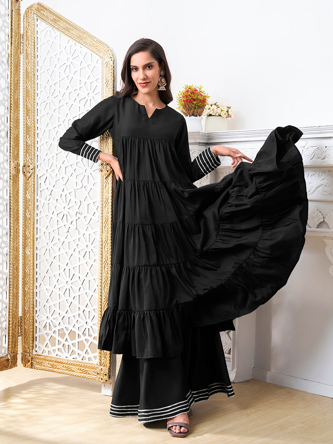 Black solid palazzo, has an elasticated waistband with slip-on closure