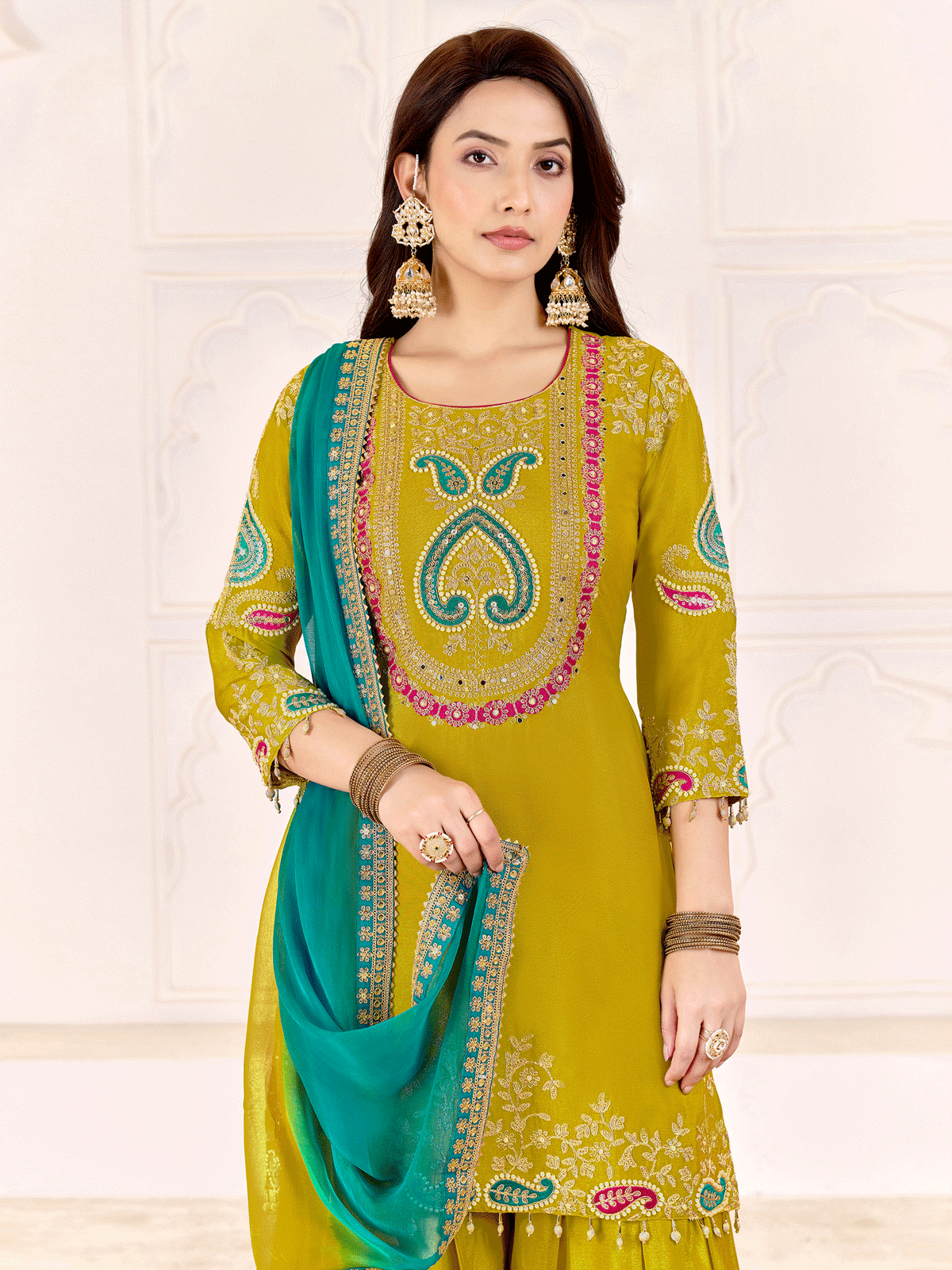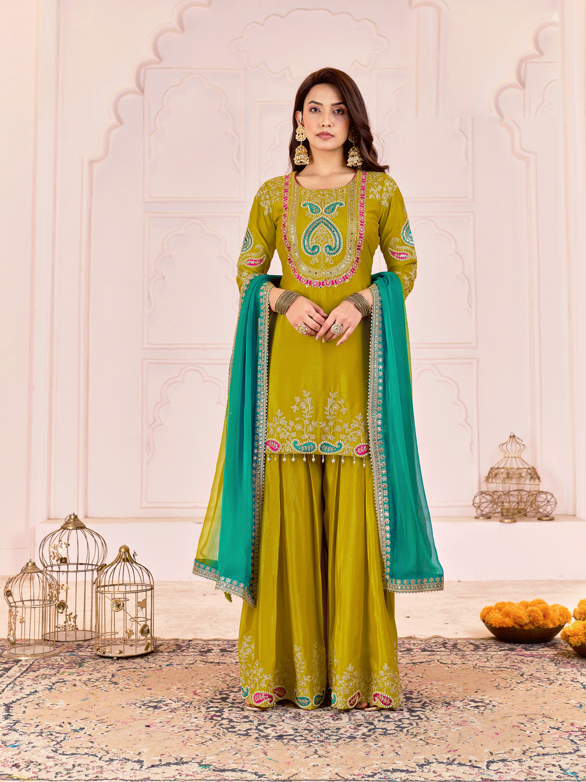 Embrace timeless sophistication with this Green Premium Chinnon Silk Palazzo Suit, expertly designed for your most significant celebrations. This ceremonial ensemble showcases meticulous craftsmanship through intricate dabka dori, sequin, and moti embellishments adorning the traditional top, while delicate jhumka lace graces the daman for added refinement. The collection comprises a luxurious chinnon silk palazzo bottom paired with a flowing pure viscose chiffon dupatta, finished with an elegant four-sided lace border. Ideal for weddings, festive occasions, and cultural gatherings, this versatile piece elevates your presence with its rich detailing and premium fabric composition. Accessorize thoughtfully to complete your distinguished look.