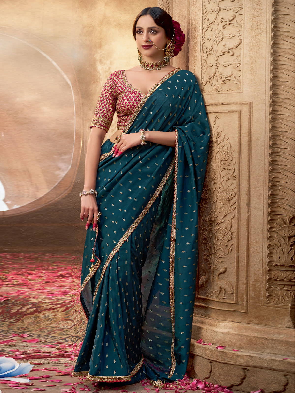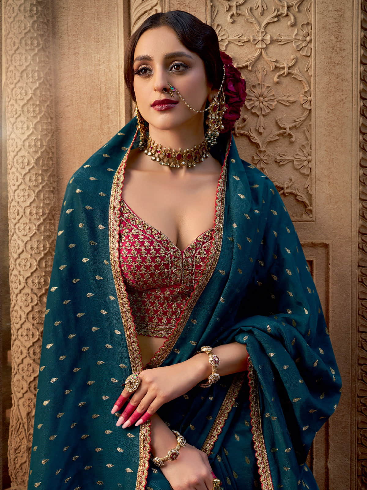 The Turquoise and Red Embroidered Viscose Saree combines traditional craftsmanship with contemporary style. Crafted from luxurious viscose crape, it offers graceful draping ideal for weddings and special events. Intricate zari brocade, multi resham thread, sequins, and latkan embellishments enhance the border and pallu, adding refined sophistication. The matching blouse features detailed cording zari embroidery on sleeves, front, and back, elevating the ensembleƒ??s elegance. Perfectly paired with statement earrings and a sleek hairstyle, this saree ensures a poised and distinguished appearance for any special occasion.