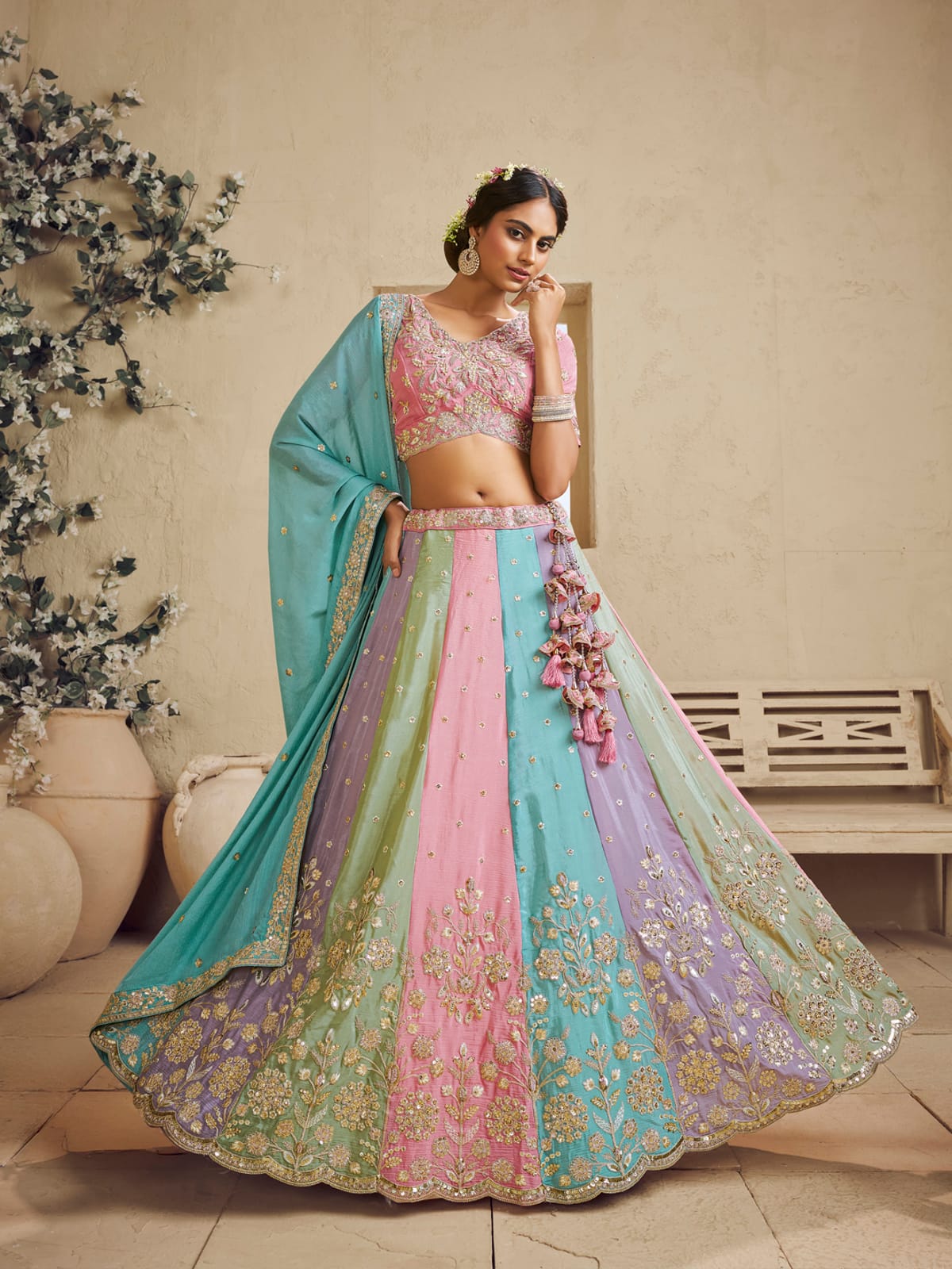 Lehenga:- Made of premium quality with multi colour kali and with Pure Georgette fabric. Full Flaire Semi-Stitched Lehenga With Sequinned and Coding work has a thread Embroidery work. Has a thread cutwork border on the hemline.