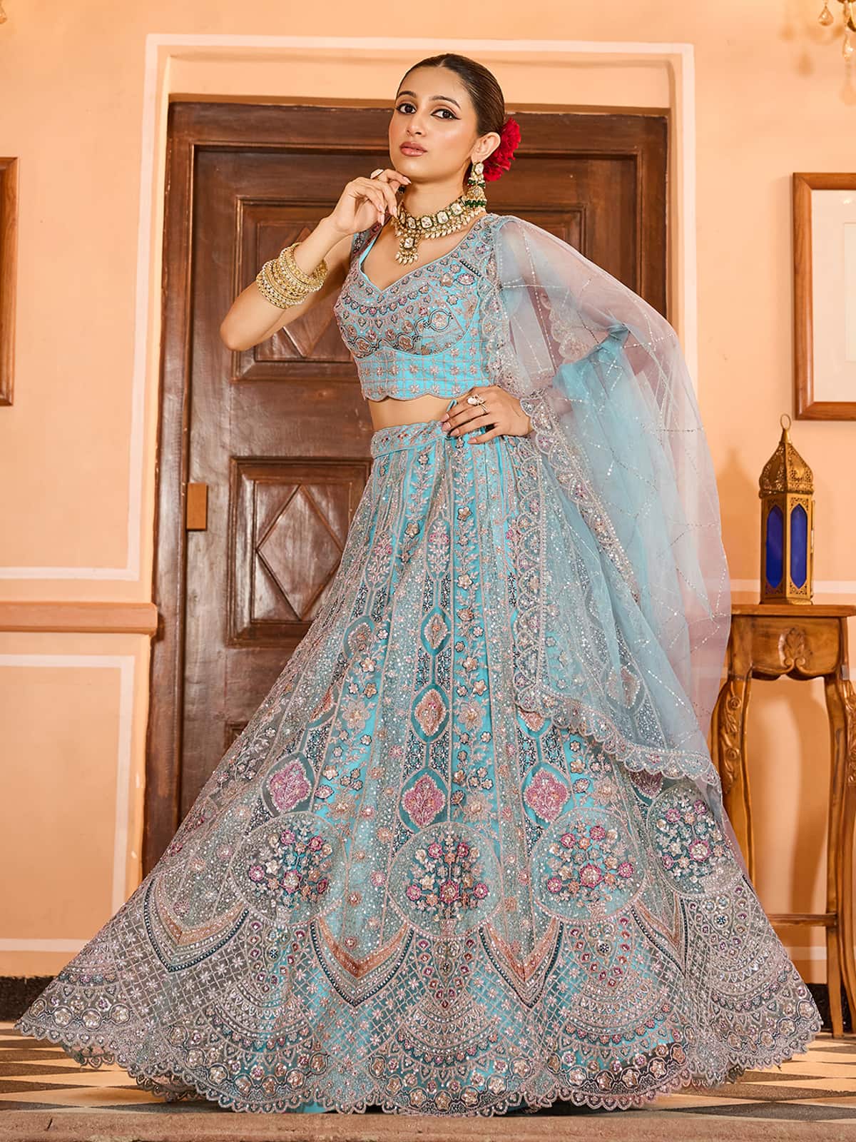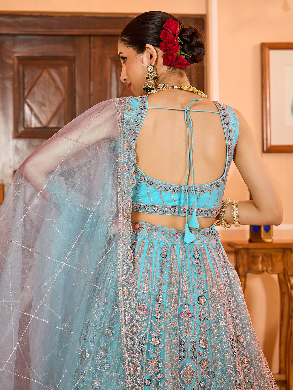 Crafted from premium turquoise blue net fabric, this semi-stitched lehenga showcases exquisite sequin and stone embellishments paired with intricate coding and thread work. The hemline features a refined thread cutwork border. The lehenga includes a single shantoon inner with an 18-inch Can Can and dual layers of buckram for structured volume, offering a generous 3.5-meter flair. The matching net dupatta displays elaborate coding, embroidery, and ornate cutwork detailing along its border. The unstitched blouse in turquoise net features a sweetheart neckline adorned with heavy sequins, coding, and thread embroidery, complete with an attached shantoon inner for comfort and support.