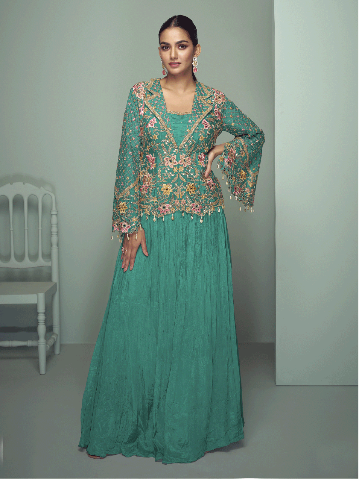 Elevate your festive wardrobe with this stunning Turquoise lehenga skirt style suit from Inddus, crafted from premium real chinnon silk. The exquisite design showcases intricate thread embroidery, lustrous zari work, and shimmering sequins that create sophisticated dimensionality and radiant appeal. Each embellishment is thoughtfully placed to enhance the rich Turquoise hue, delivering a refined aesthetic perfect for celebrations. The ensemble pairs seamlessly with a coordinating plain skirt-style bottom, ensuring effortless elegance and comfortable wear throughout your event.