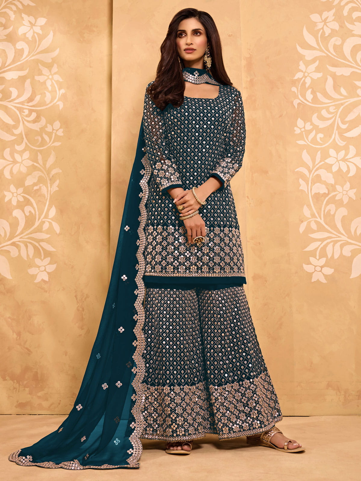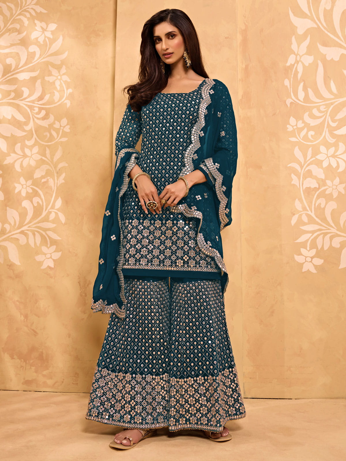 Unleash your ethnic style with our Turquoise Embroidered Georgette Sharara Suit. This Indian outfit features exquisite zari, stone and mirror work on a georgette top and sharara bottom, with a matching georgette dupatta. The santoon lining adds extra comfort. Elevate your look with golden earrings and stylish heels for a glamorous touch.