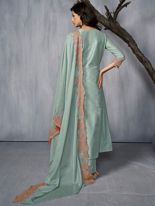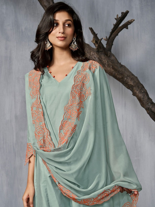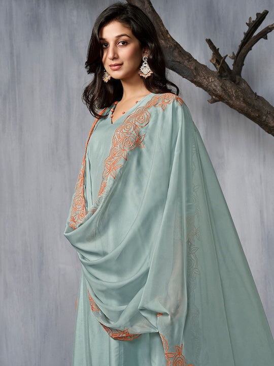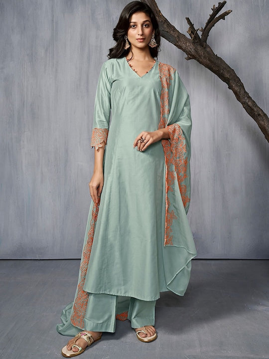 Look polished and charming in this V-neck, A-line Kurta featuring thread work detailing and flared hem. Crafted from pure silk machine weave fabric, it perfectly matches the trousers with a partially elasticated waistband and the dupatta for a timeless and elegant look.