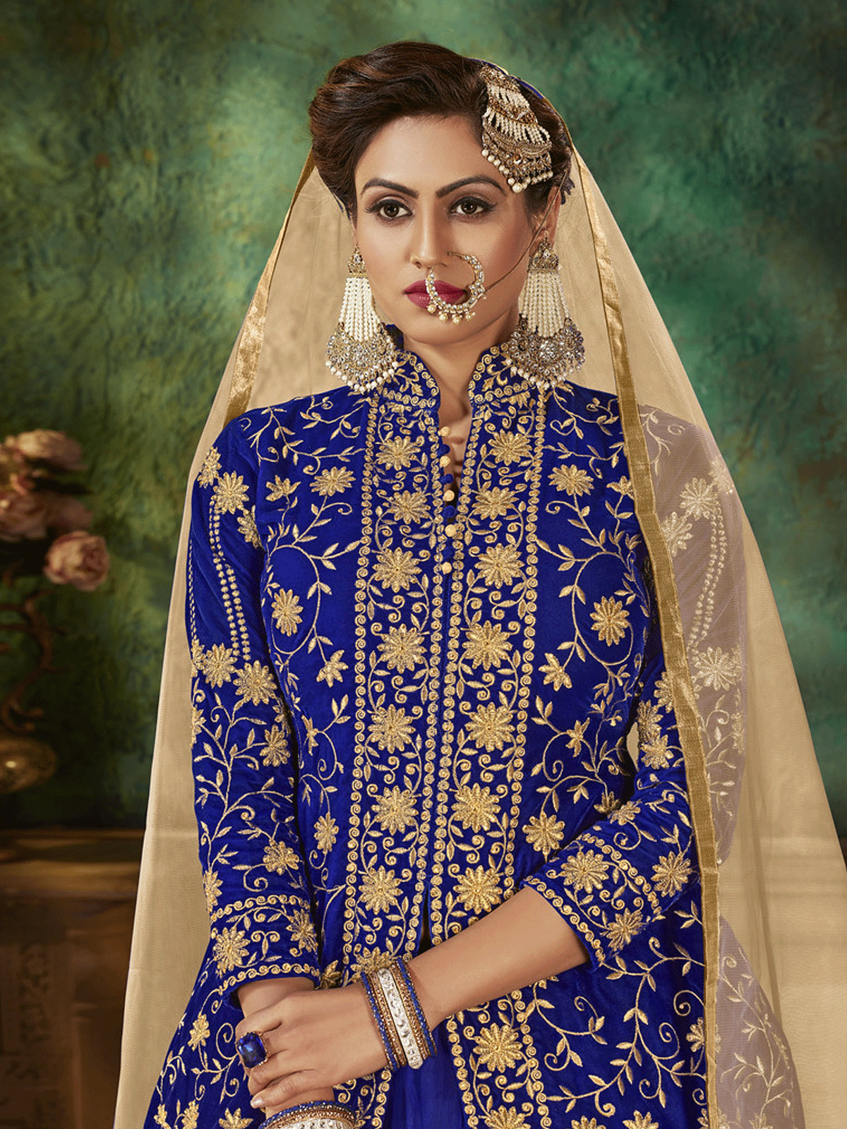 Elevate your ethnic wardrobe with this stunning velvet embroidered sharara suit set in regal royal blue. The intricately crafted top features luxurious velvet fabric adorned with exquisite designer embroidery and stone detailing that commands attention. Paired with a gracefully flowing net bottom and matching net dupatta, this ensemble delivers sophisticated elegance for weddings, celebrations, and special occasions. The contrasting textures create visual depth while maintaining refined proportions, making it an investment piece for the discerning wearer.