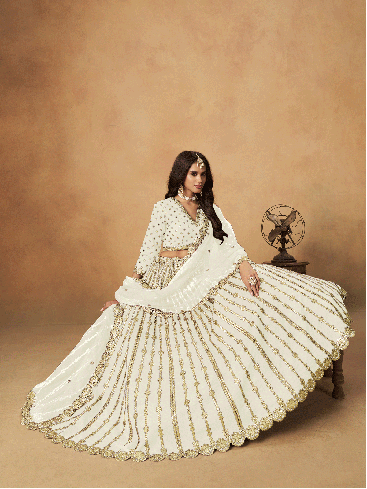 Elevate your bridal ensemble with this exquisite white lehenga choli from Inddus, crafted from premium art silk for a luxurious drape and refined finish. Adorned with intricate zari embroidery and traditional gota work, this piece radiates timeless elegance with golden accents that catch the light beautifully. The complete set includes a coordinating embroidered blouse and dupatta, ensuring a cohesive, polished look for your special day. Designed specifically for weddings and festive occasions, this white lehenga embodies grace and cultural sophistication. Pair with gold jewelry and statement accessories to complete your radiant bridal appearance.