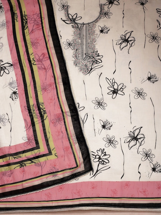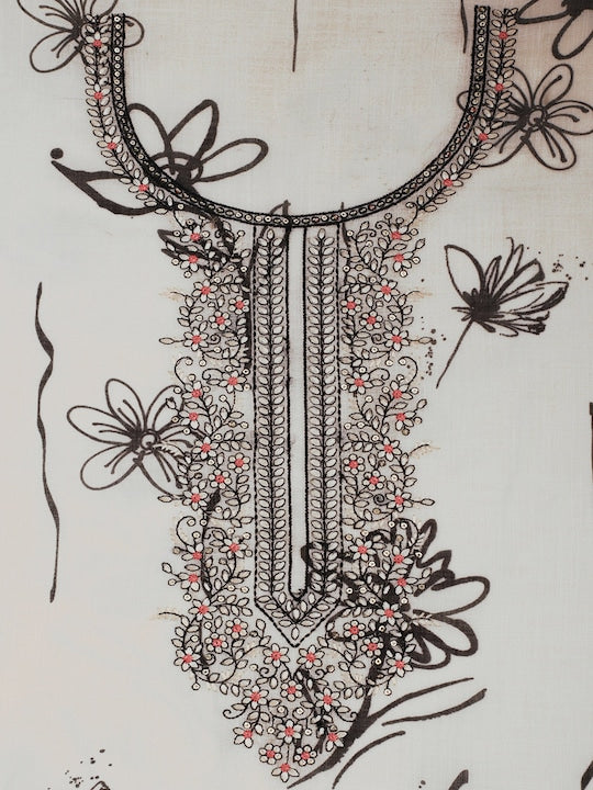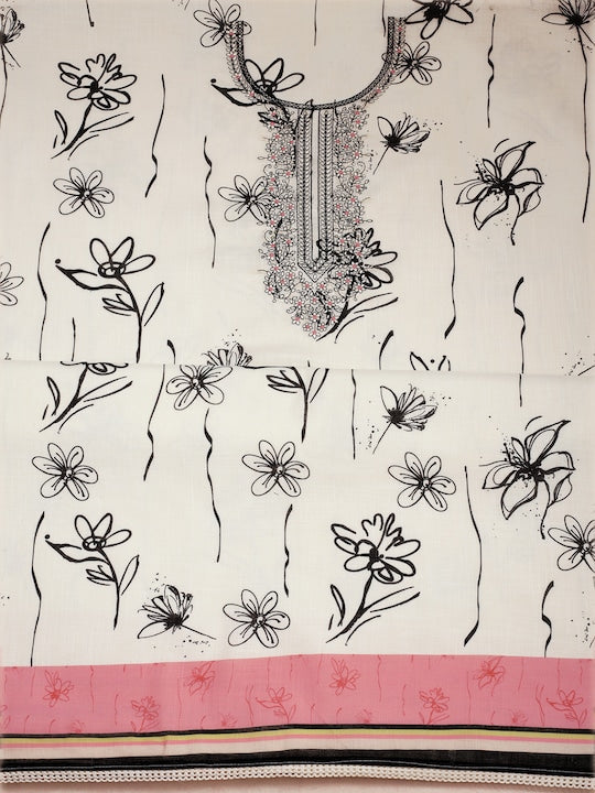 This white and black embroidered pure cotton unstitched dress material is perfect for creating a unique and stylish look. The intricately designed kurta fabric and solid bottom fabric offer endless possibilities for customization, while the printed dupatta with taping border adds a touch of elegance to any outfit. Please note that the product is unstitched.