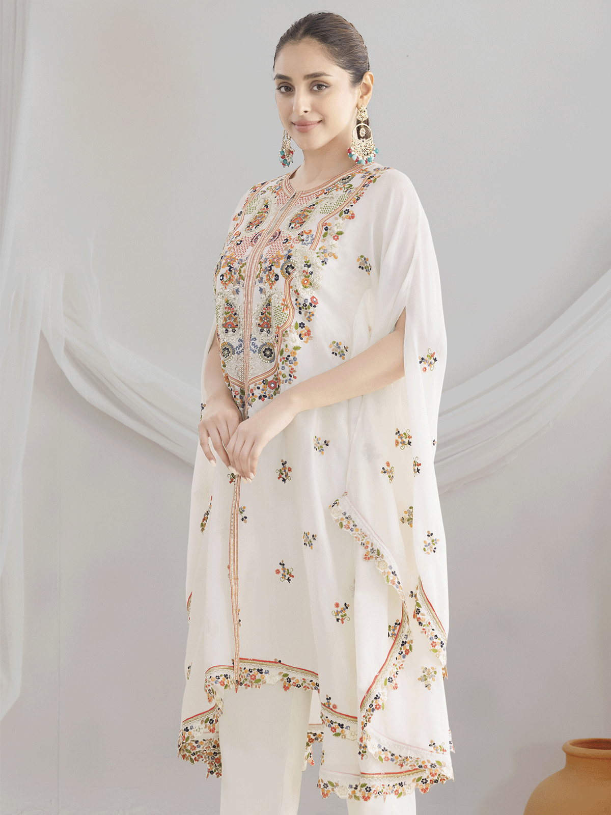 Elevate your festive wardrobe with this exquisite white kaftan style dress from Inddus, crafted from premium chinnon silk for unparalleled comfort and elegance. The pristine white canvas is adorned with intricate floral embroidery, traditional dabka dori detailing, and shimmering sequins that add sophisticated texture and visual depth. This contemporary silhouette seamlessly blends time-honored craftsmanship with modern sensibilities, featuring coordinated pant-style bottoms for a polished ensemble. Ideal for wedding celebrations and special occasions, this versatile piece radiates refined grace and cultural richness. Pair with statement jewelry and elegant accessories to complete your sophisticated look.
