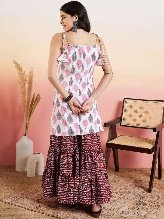 This white & pink ethnic motifs printed kurta with sharara is a must-have for any wardrobe. Made from pure cotton, it features a straight cut and shoulder straps for a comfortable and stylish fit. The vibrant ethnic motifs add a touch of traditional charm, while the slip-on closure and partially elasticated waistband make it easy to wear. Perfect for any occasion, this kurta with sharara is a versatile and stylish addition to your collection.