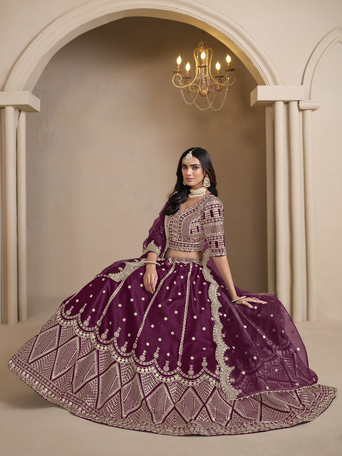 Elevate your festive style with our Inddus Wine Embroidered A Line Wedding Lehenga Choli. Intricate zari thread work and sparkling sequins create captivating patterns on luxurious art silk. This set includes a coordinated blouse and delicate net dupatta, perfect for wedding festivities. Traditional artistry meets contemporary sophistication.