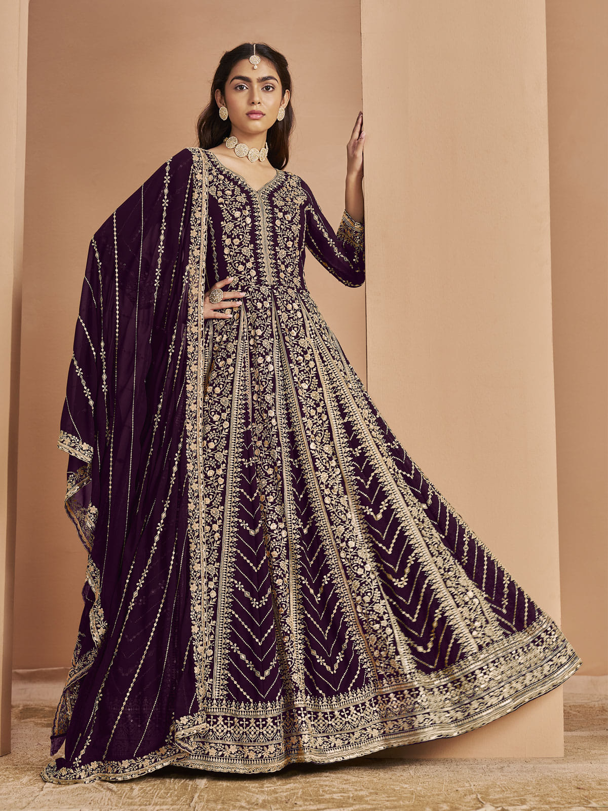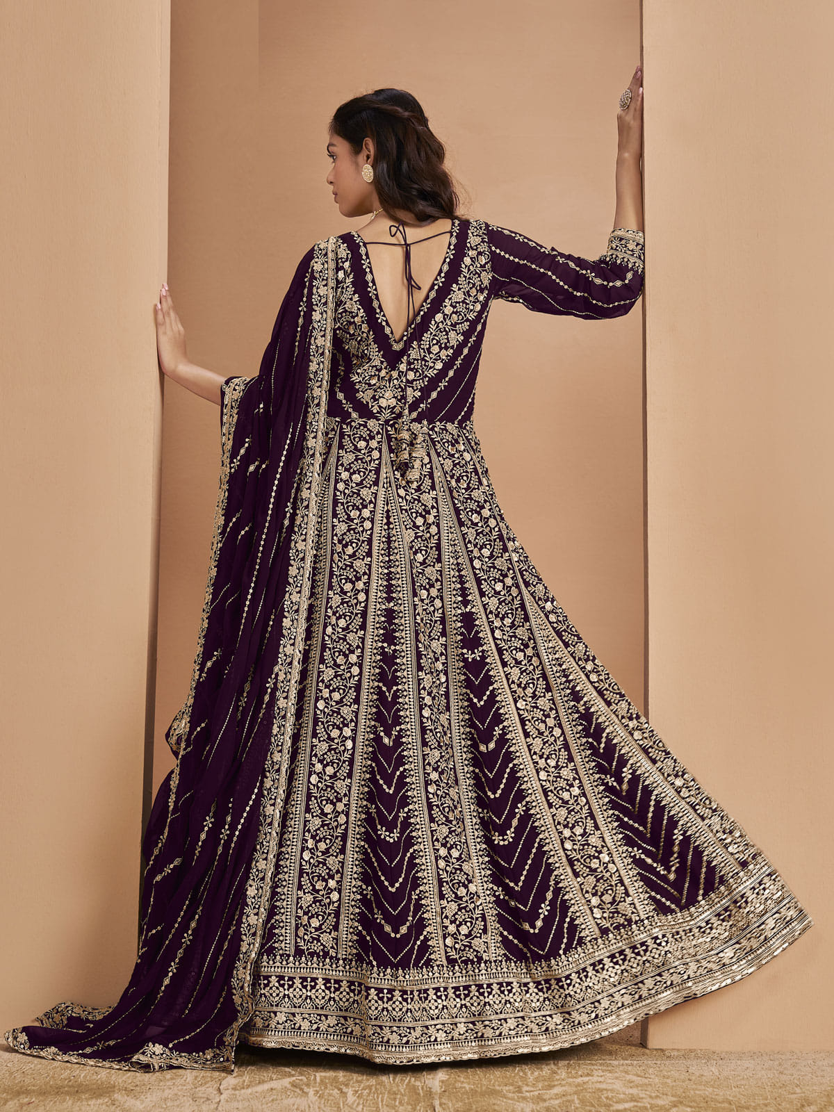 Elevate your ethnic elegance with Inddus' Heavy Embroidered Wine Georgette Wedding Anarkali Suit. Luxurious zari thread and sequin embroidery adorn the premium faux georgette fabric, creating a contemporary masterpiece. The flowing Anarkali silhouette, paired with santoon bottom and faux georgette dupatta, delivers sophistication for weddings and special events. Create a timeless and modern look with statement traditional jewelry.