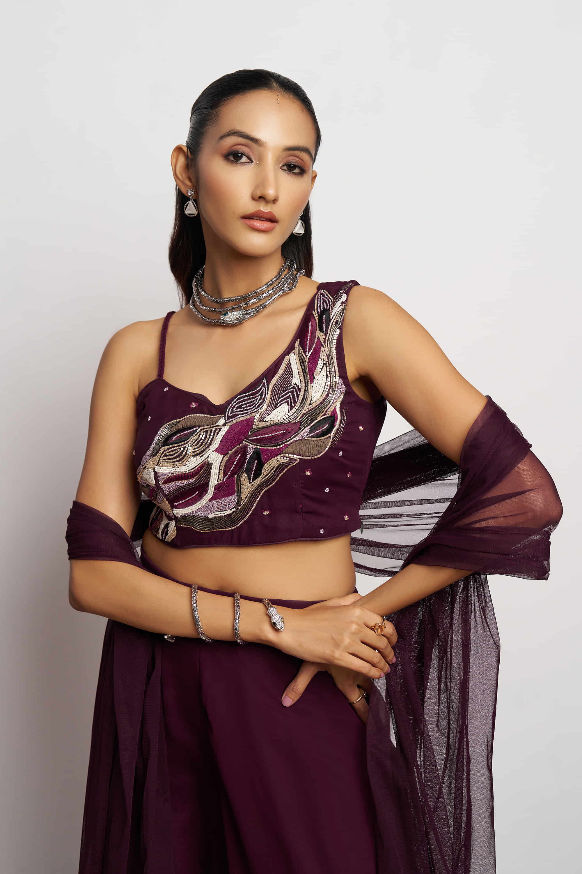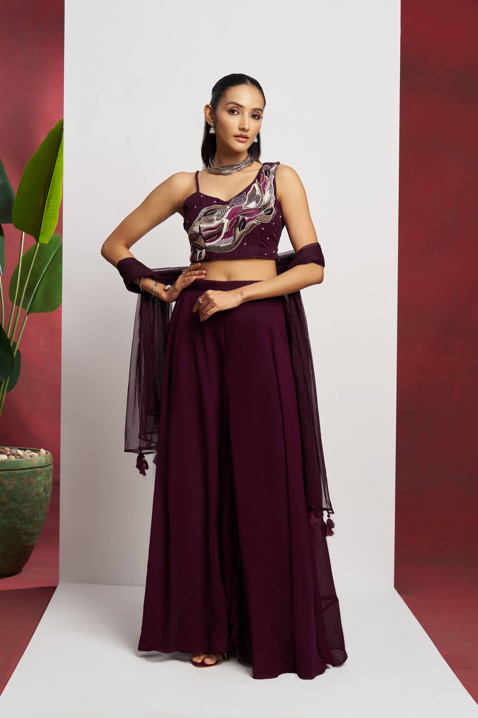 This Indo Western Wine Khatli Work Party Wear Sharara Suit by Inddus seamlessly blends traditional craftsmanship with contemporary style. Featuring intricate pure Khatli handwork on flowing georgette fabric, the ensemble includes a coordinated sharara bottom and a striking net dupatta designed in an innovative cape style. Ideal for festivals and parties, this suit highlights Indian artistry while embracing modern design, making it a standout choice for those seeking elegance with a fusion twist. Pair it with bold jewelry to complete a sophisticated, head-turning look.