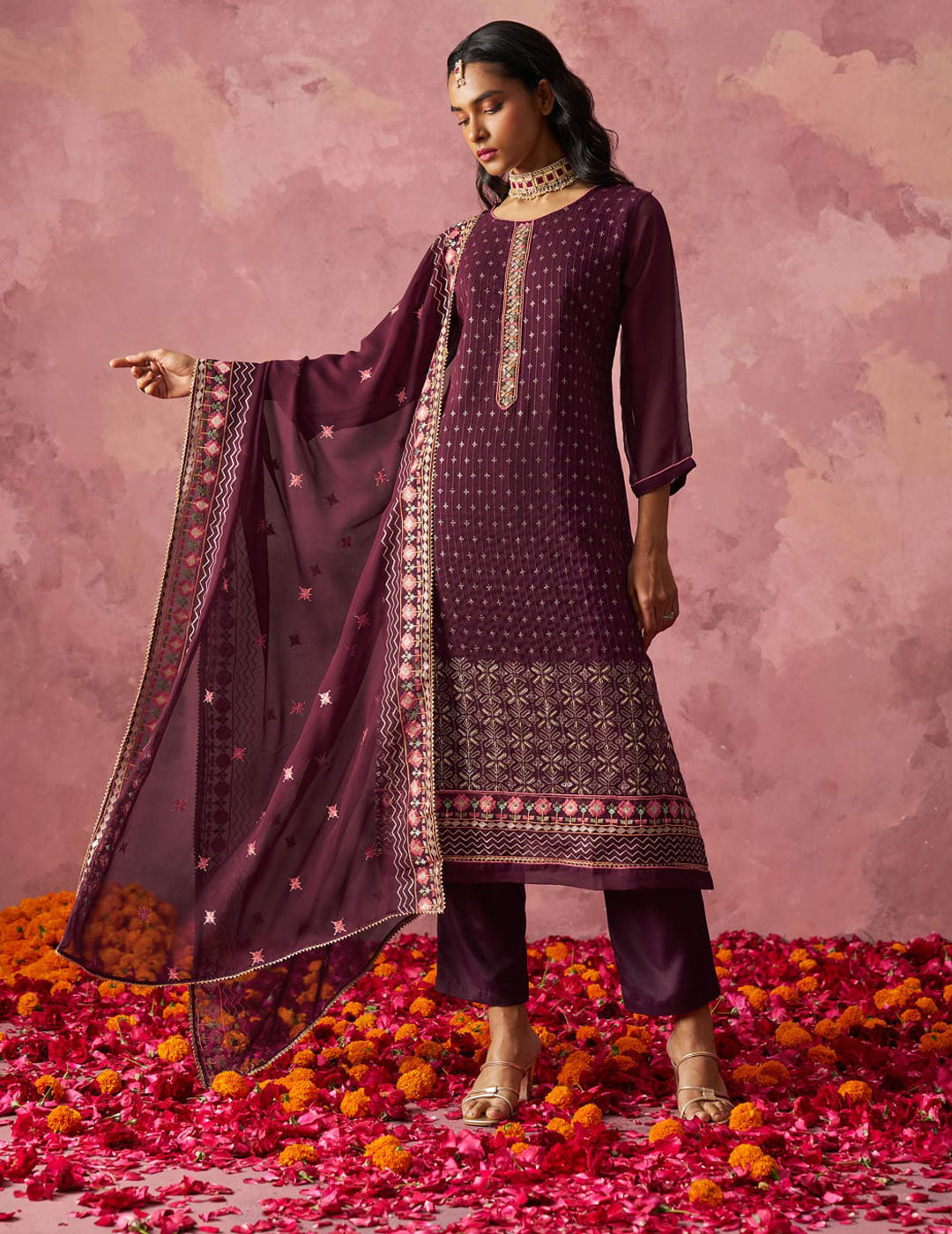 Experience pure elegance with our Wine Straight Embroidered Kurta Set. This A-line ensemble features delicate embroidery work for a timeless appeal. The accompanying pant style adds a modern twist, while the embroidered dupatta adds sophistication. Elevate your style with this stunning kurta set.