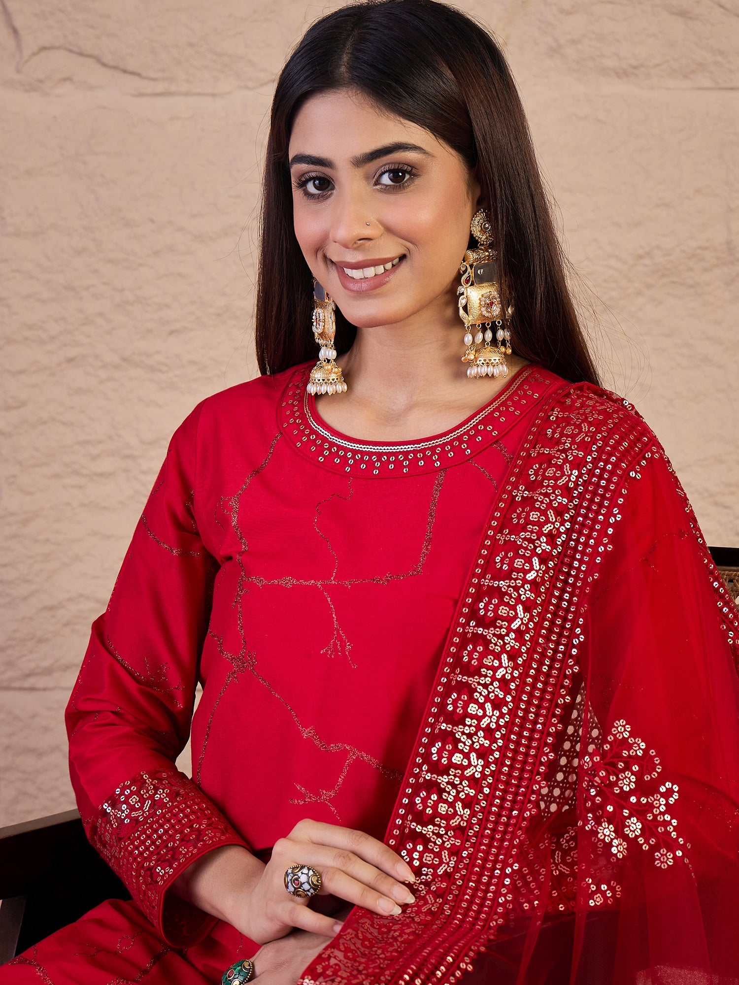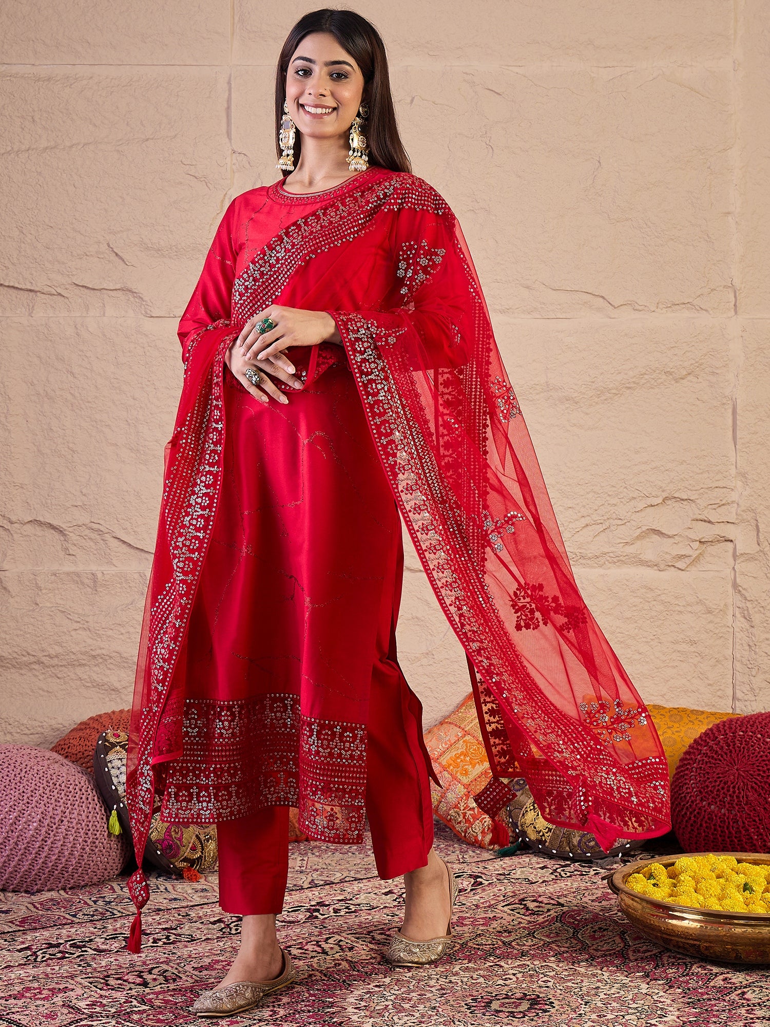 Red & Gold Printed Kurta with Trousers & Dupatta