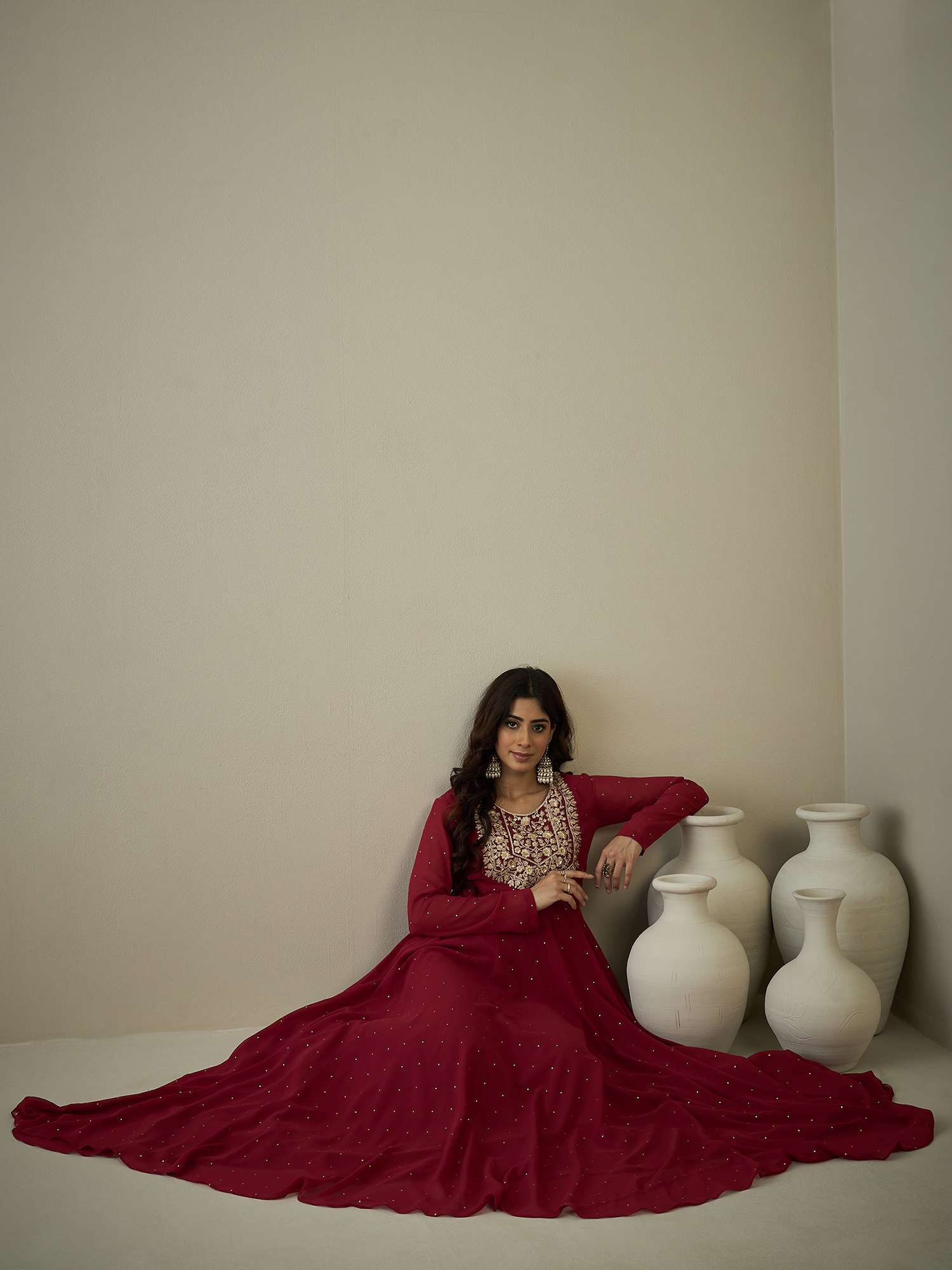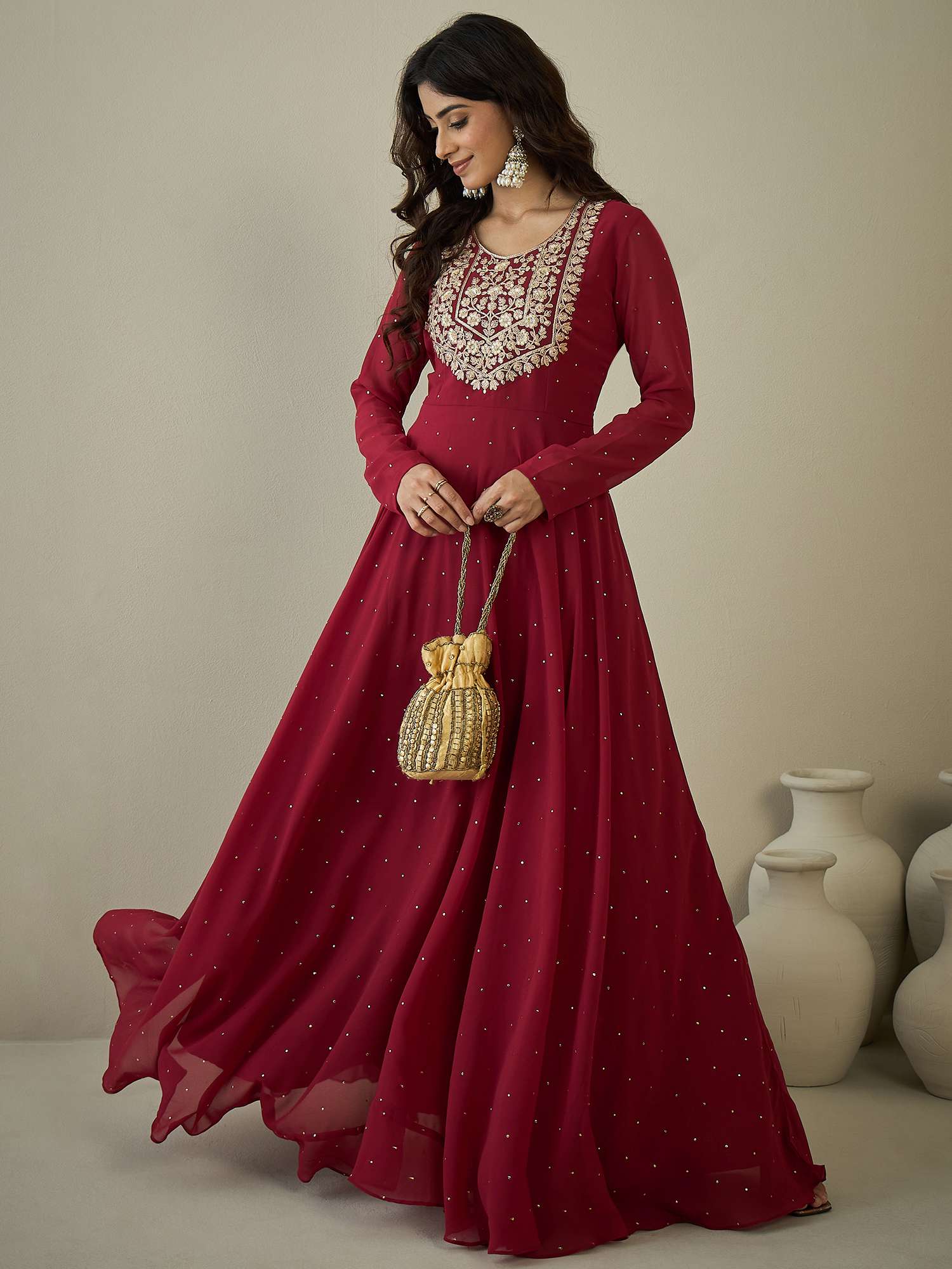 Expertly crafted with maroon ethnic dress and intricate embroidery, this A-line maxi dress is a must-have for any fashion-forward woman. With a flattering round-neck, full sleeves, and a flared hem, this dress will effortlessly elevate your style. Simply slip it on and tie up the back for a flawless look.