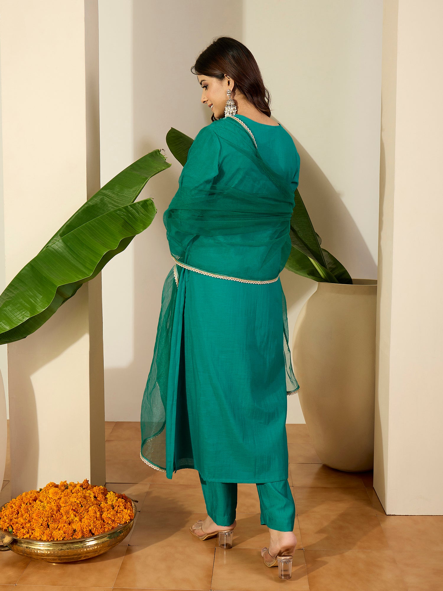 TOP: Chanderi Cotton, TOP INNER: Crepe, BOTTOM: Viscose Silk, DUPATTA: Net, Dry Clean