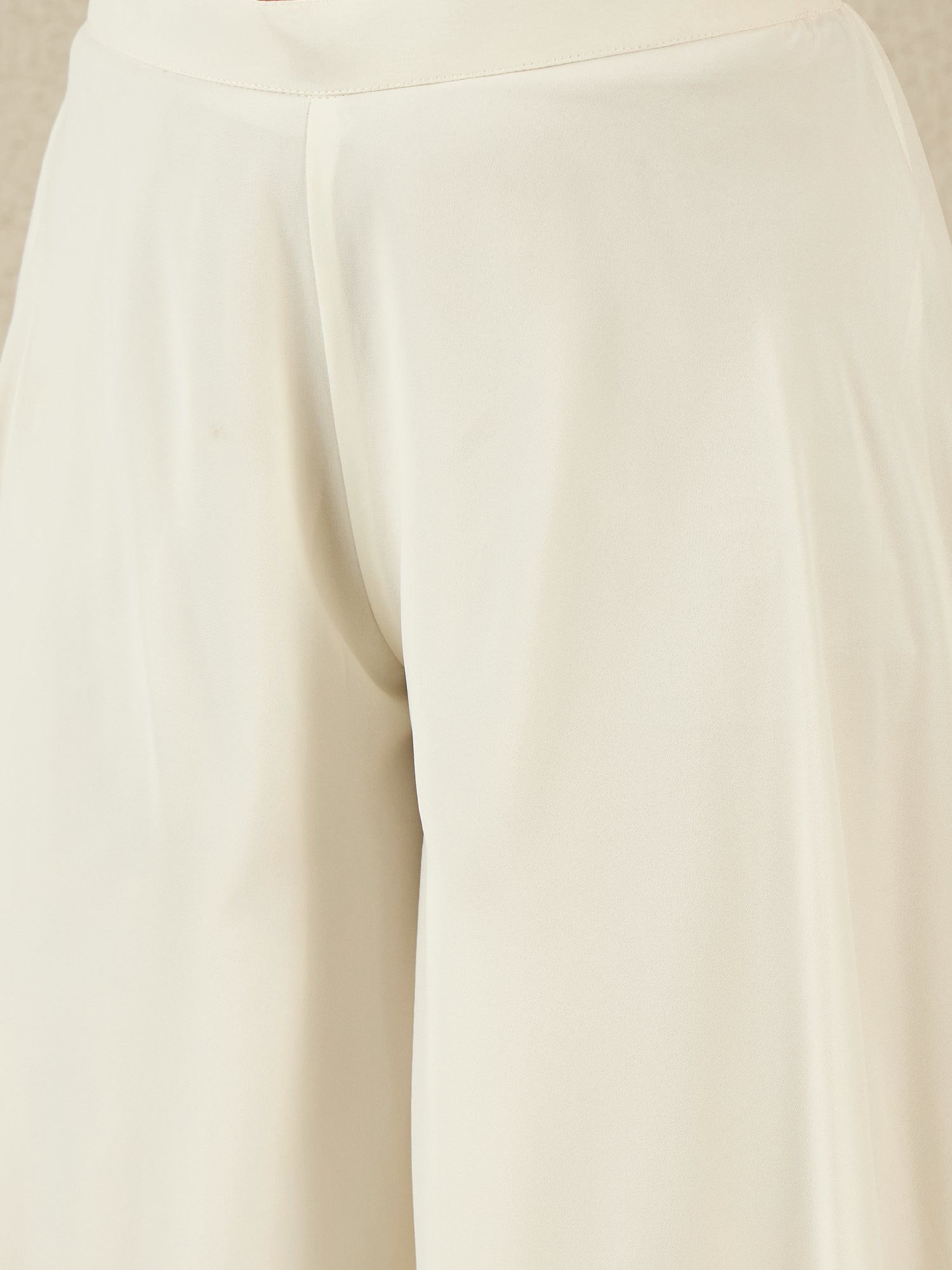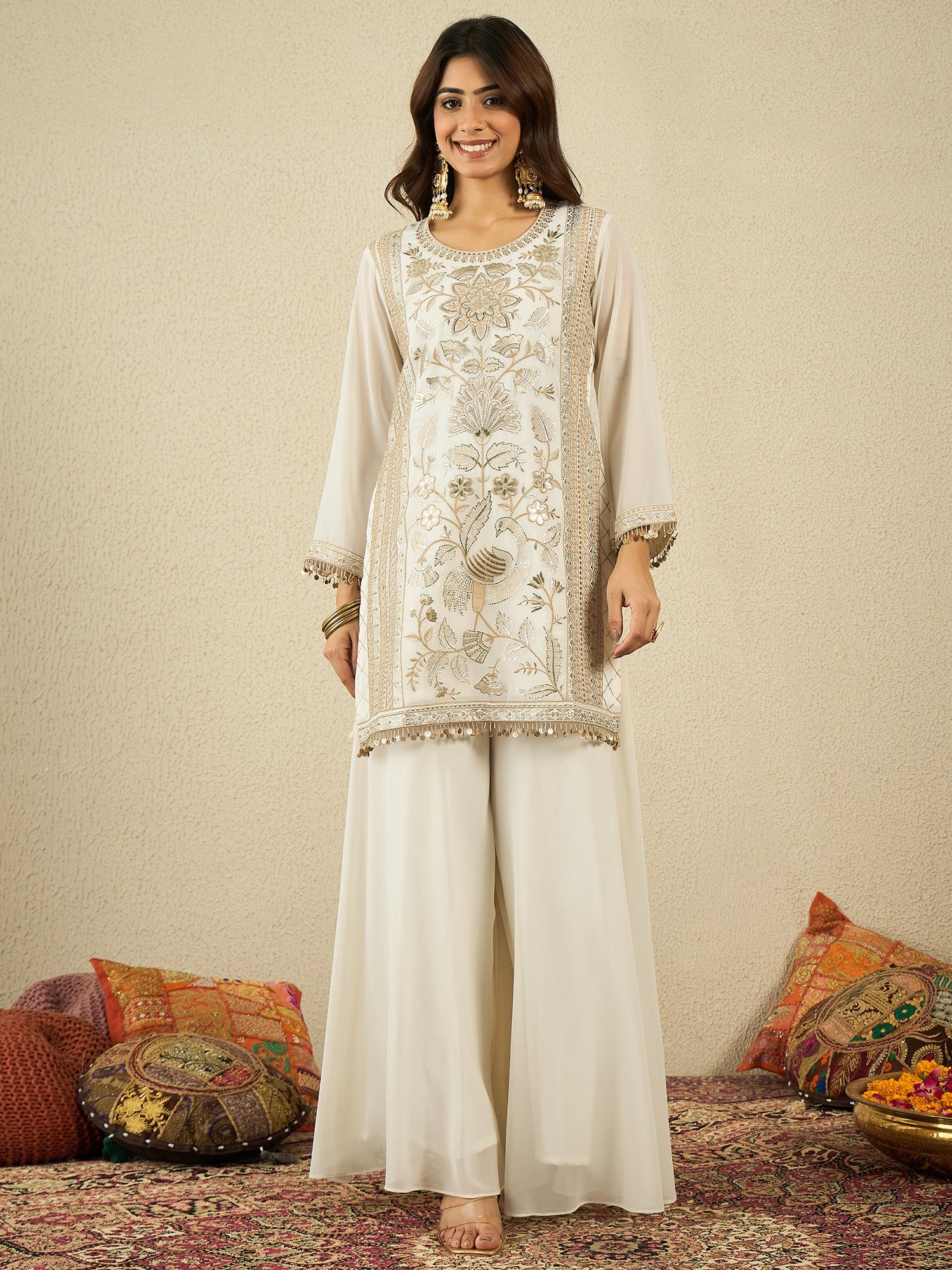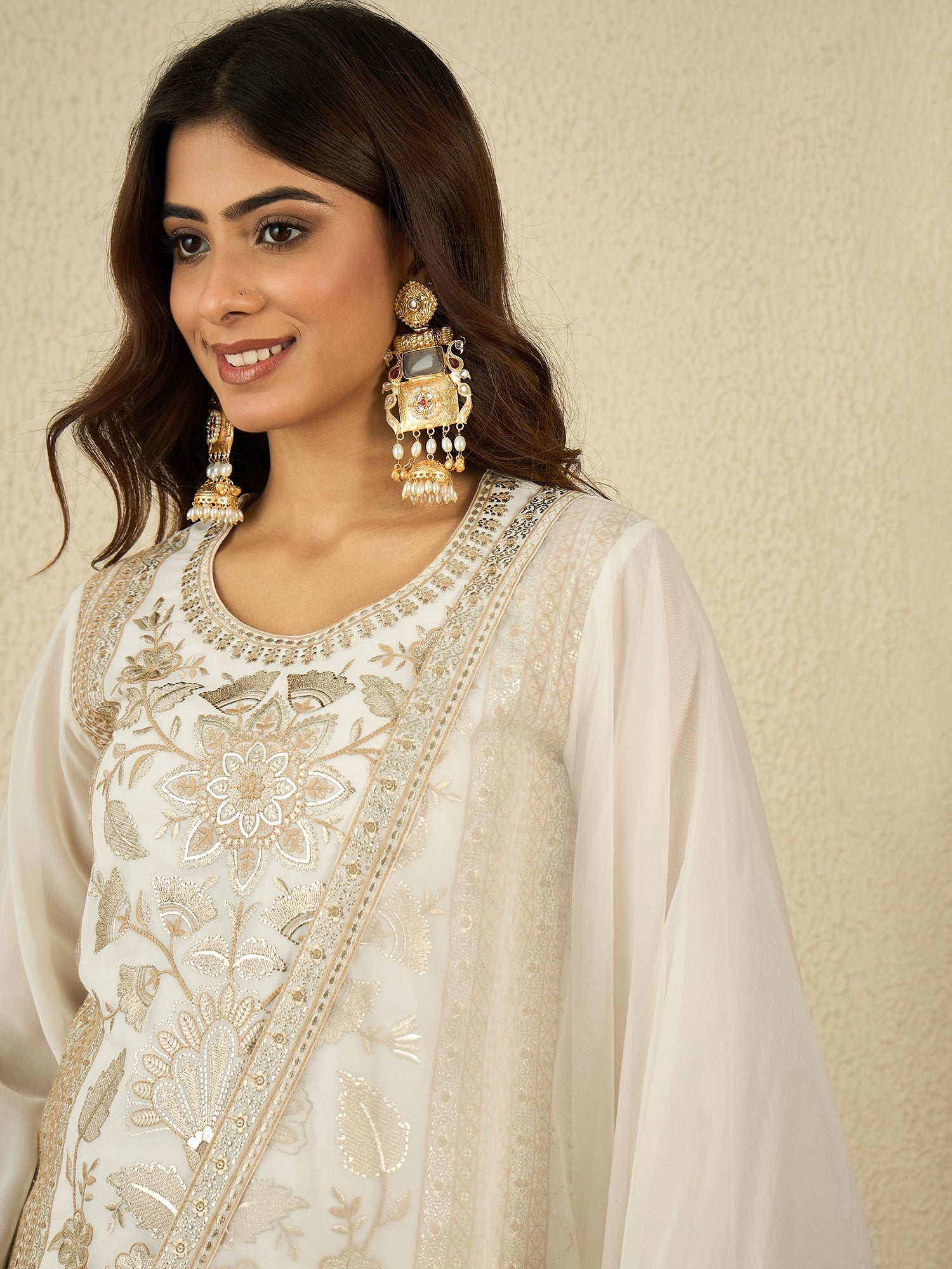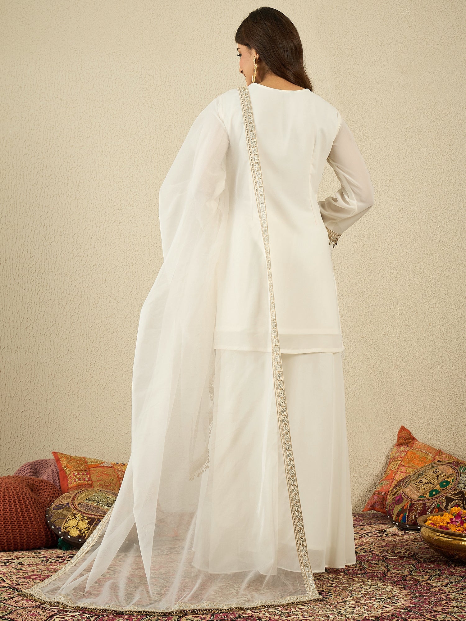 Off White & Gold Embroidered Kurta with Palazzo & Dupatta