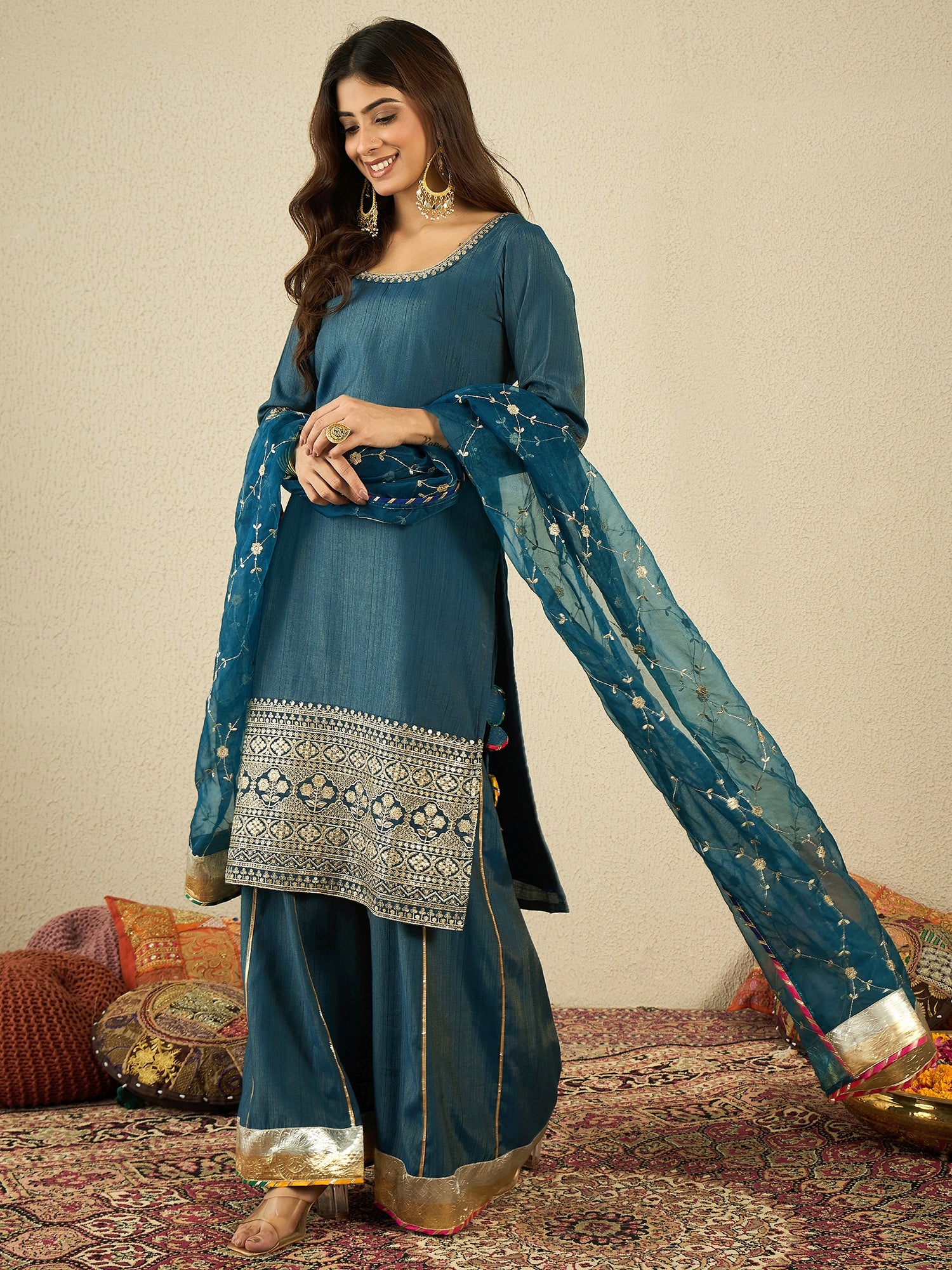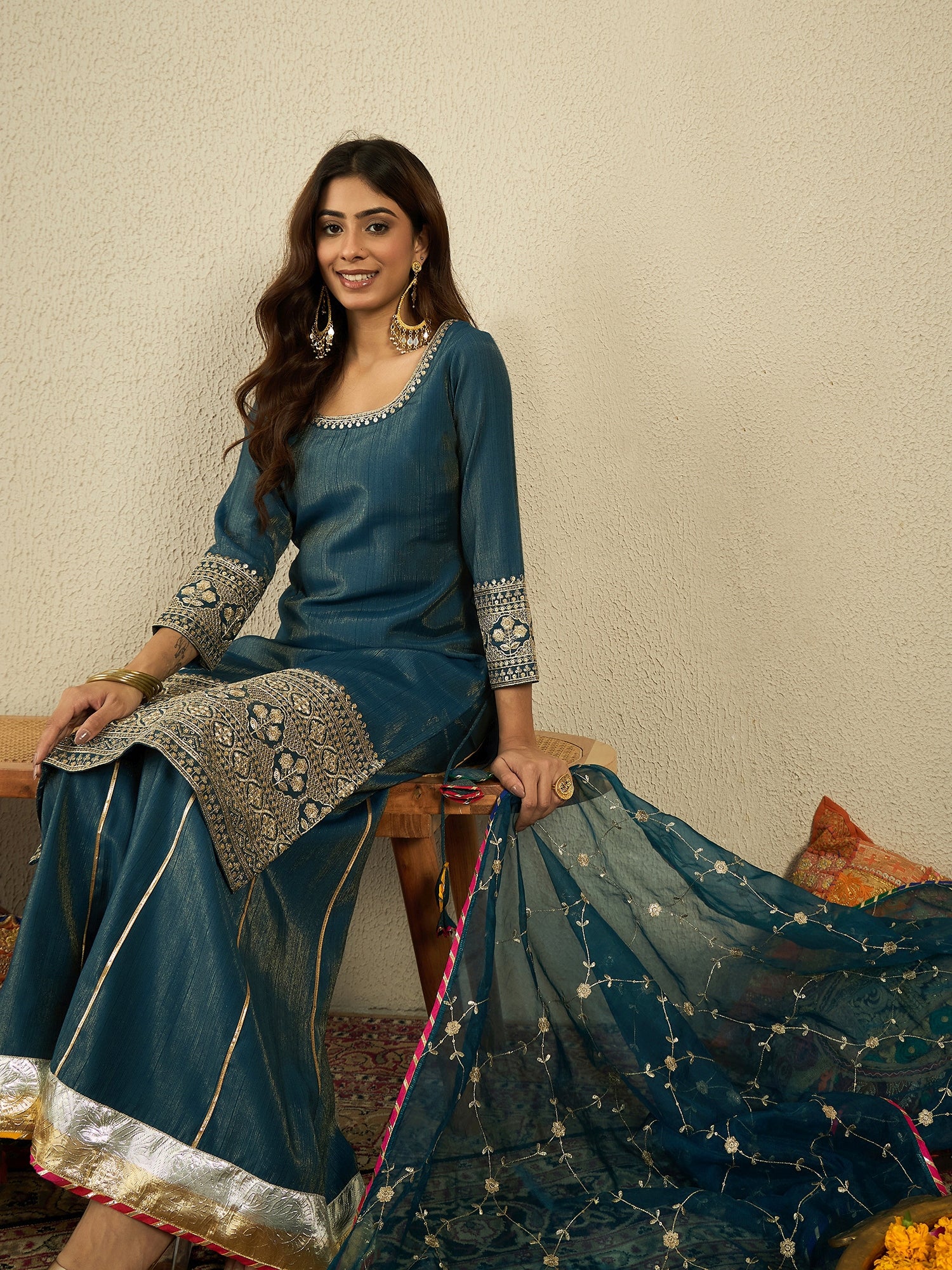 Teal & Gold Embroidered Kurta with Sharara & Dupatta