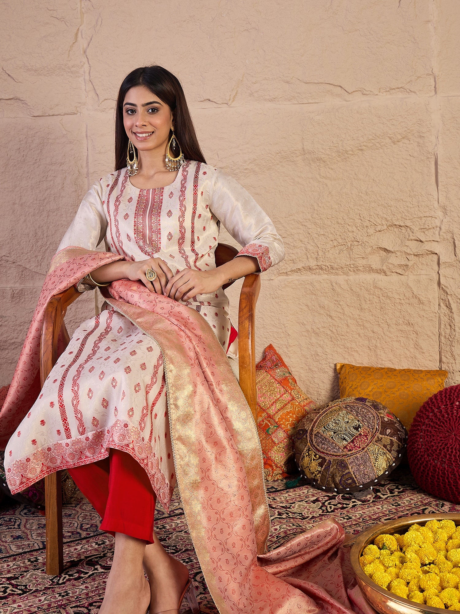 Off White & Pink Embroidered Kurta with Trouser & Dupatta