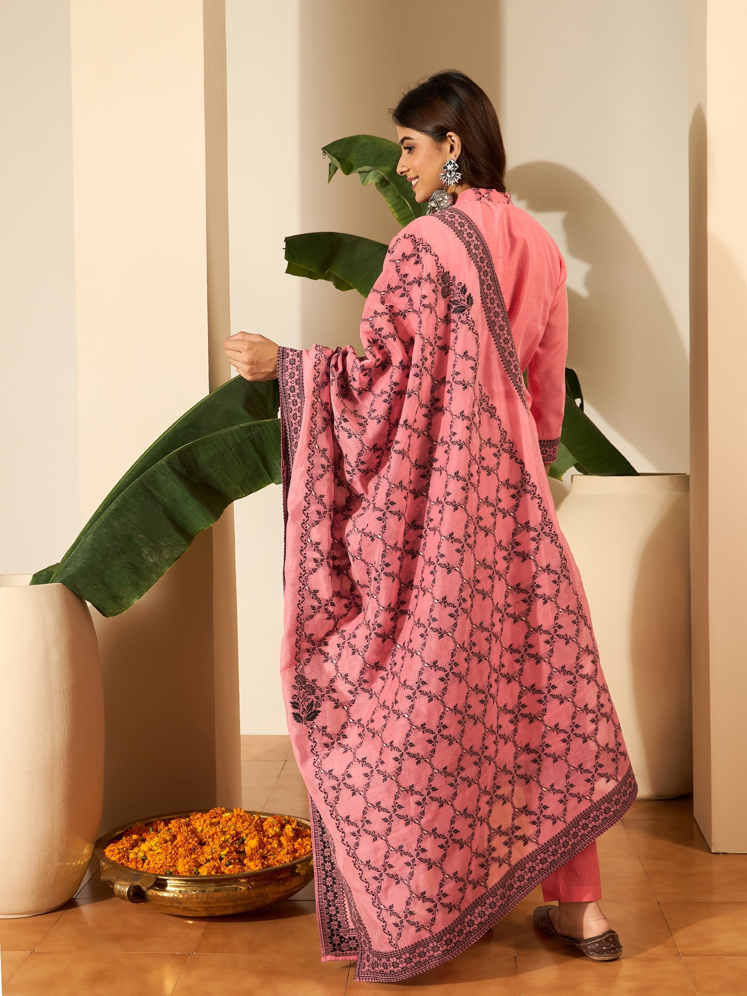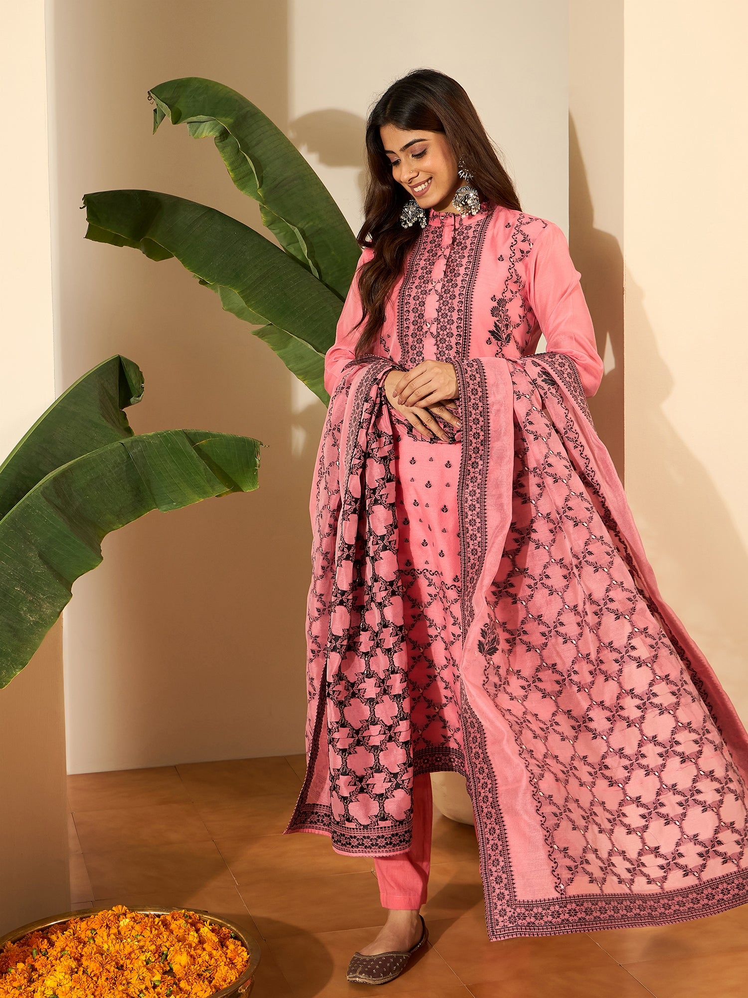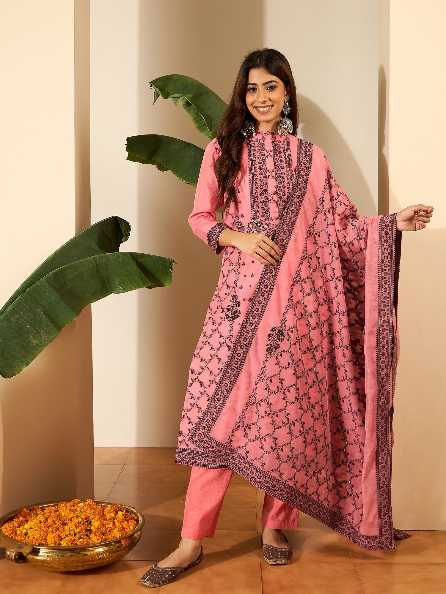 Pink & Black Embroidered Kurta with Trousers & Dupatta