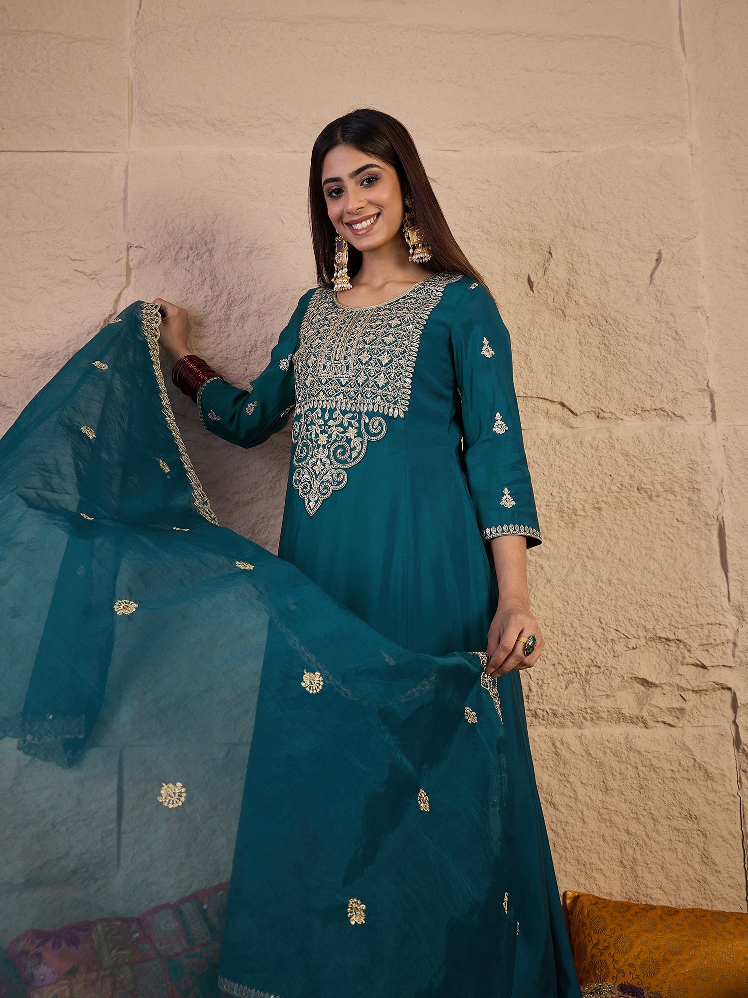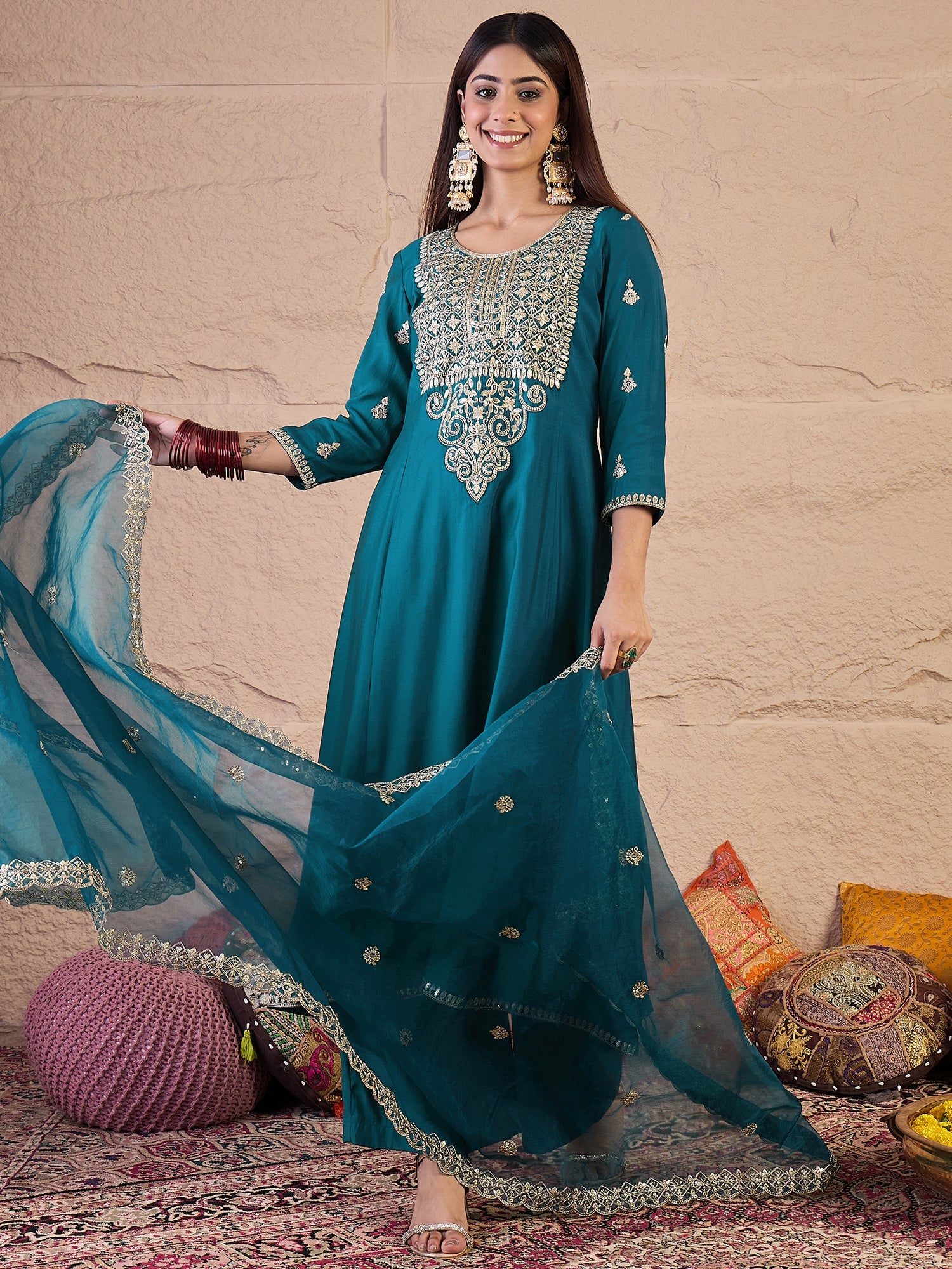 Teal Embroidered Kurta with Palazzos With Dupatta