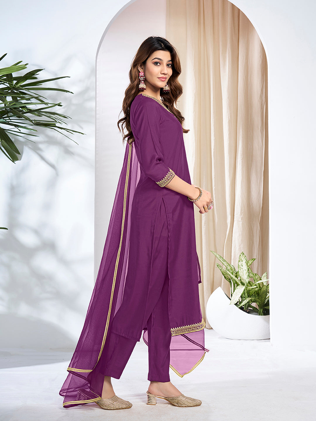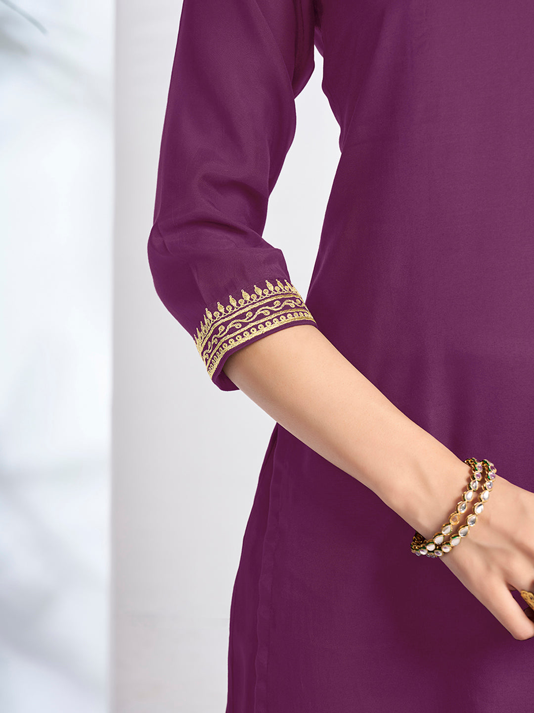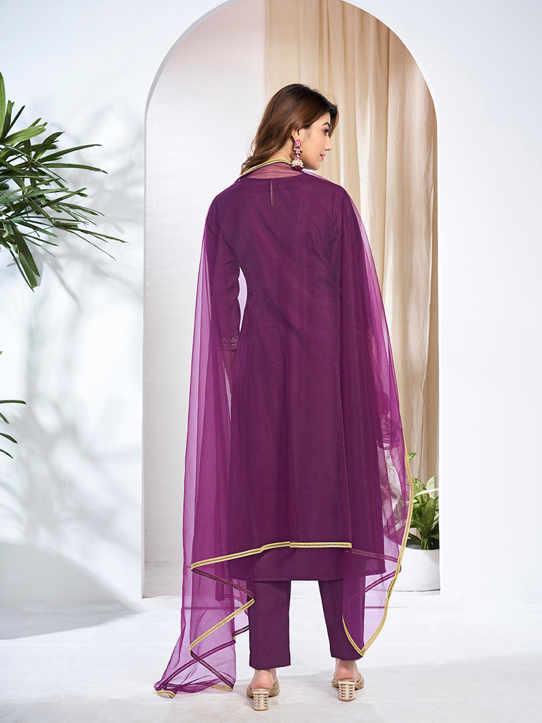 This purple embroidered kurta with trousers and dupatta is perfect for any occasion. The ethnic motifs embroidered in a straight shape and regular style adds a touch of elegance. The silk blend machine weave fabric offers both comfort and style. The partially elasticated waistband on the solid trousers makes for a perfect fit.