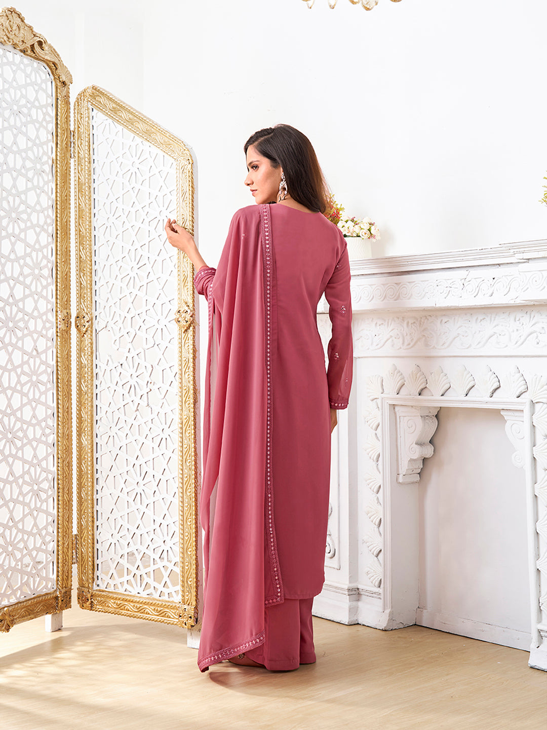 Discover the elegance and sophistication of our Pink Kurta with Palazzos and Dupatta set. The ethnic motifs are beautifully embroidered on a georgette fabric, while the sequinned details add a touch of sparkle. The Palazzos offer a comfortable fit with a partially elasticated waistband, completing this traditional yet stylish outfit.