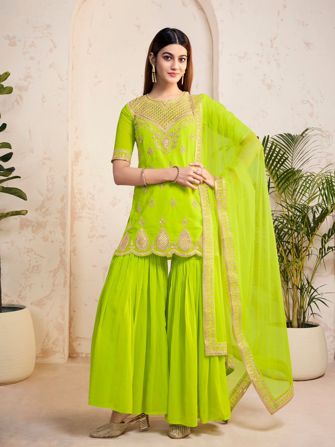 Expertly crafted with a delicate machine weave fabric, this lime green Kurta with Sharara is a must-have for any ethnic wear collection. The traditional ethnic motifs embroidered design, paired with the scalloped hem and sequinned detail, adds a touch of elegance. The comfortable Sharara, with its partially elasticated waistband and slip-on closure, completes the look for any special occasion.