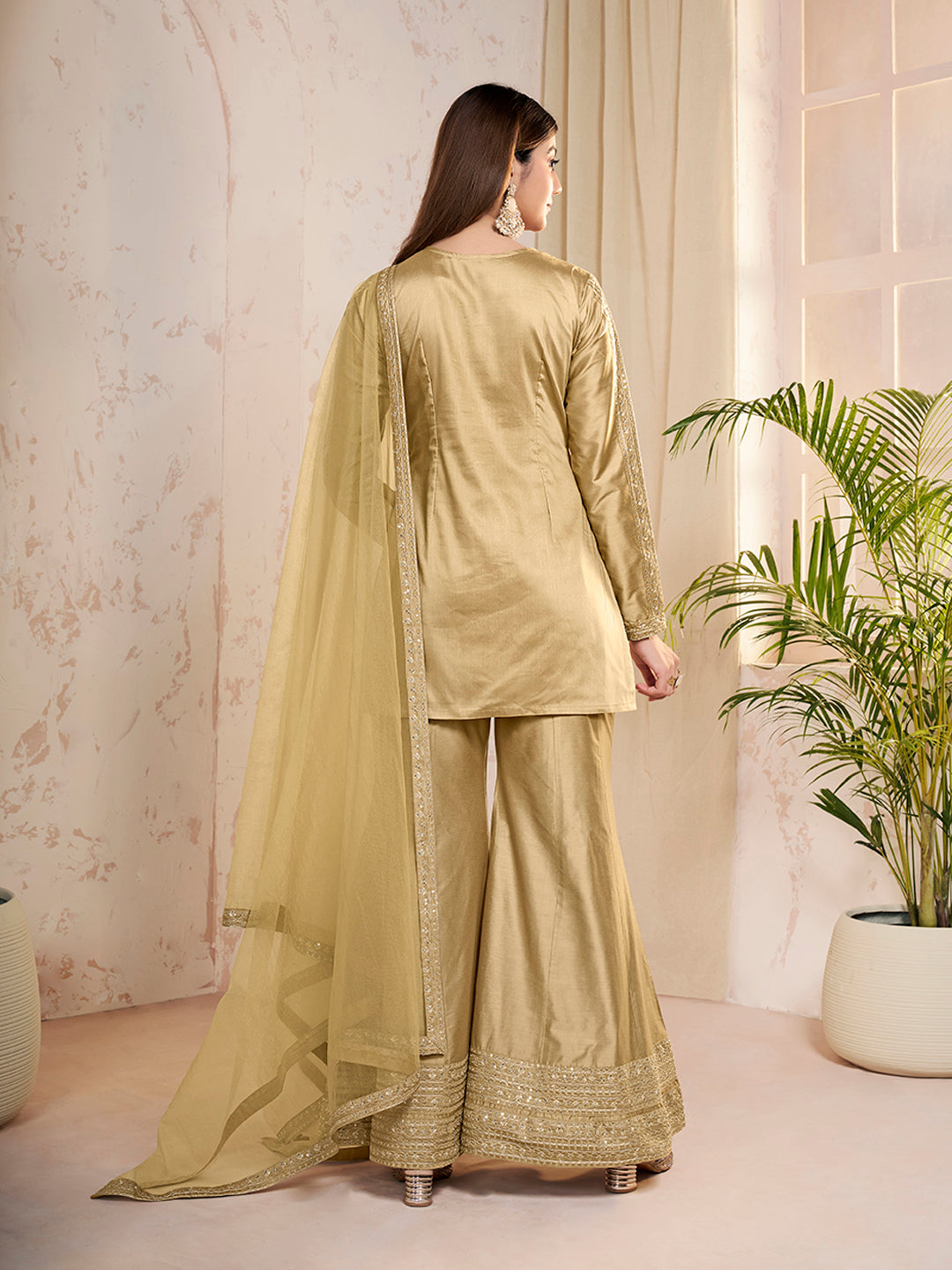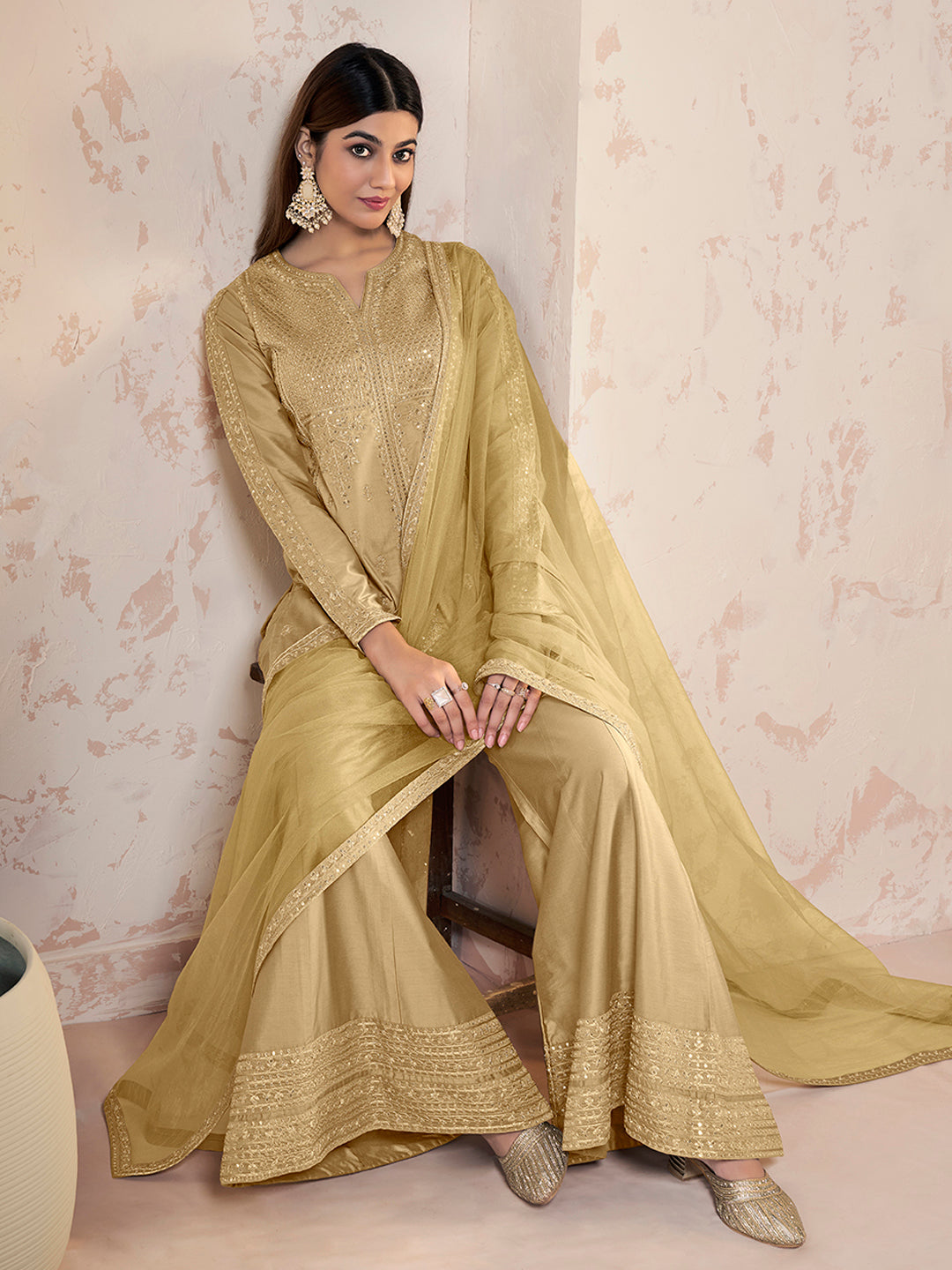 This beige embroidered Kurta with Sharara and dupatta features ethnic motifs and sequinned details for a stylish and elegant look. The silk blend fabric adds a touch of luxury while the partially elasticated waistband and slip-on closure ensure comfort and ease of wear. Perfect for any occasion.