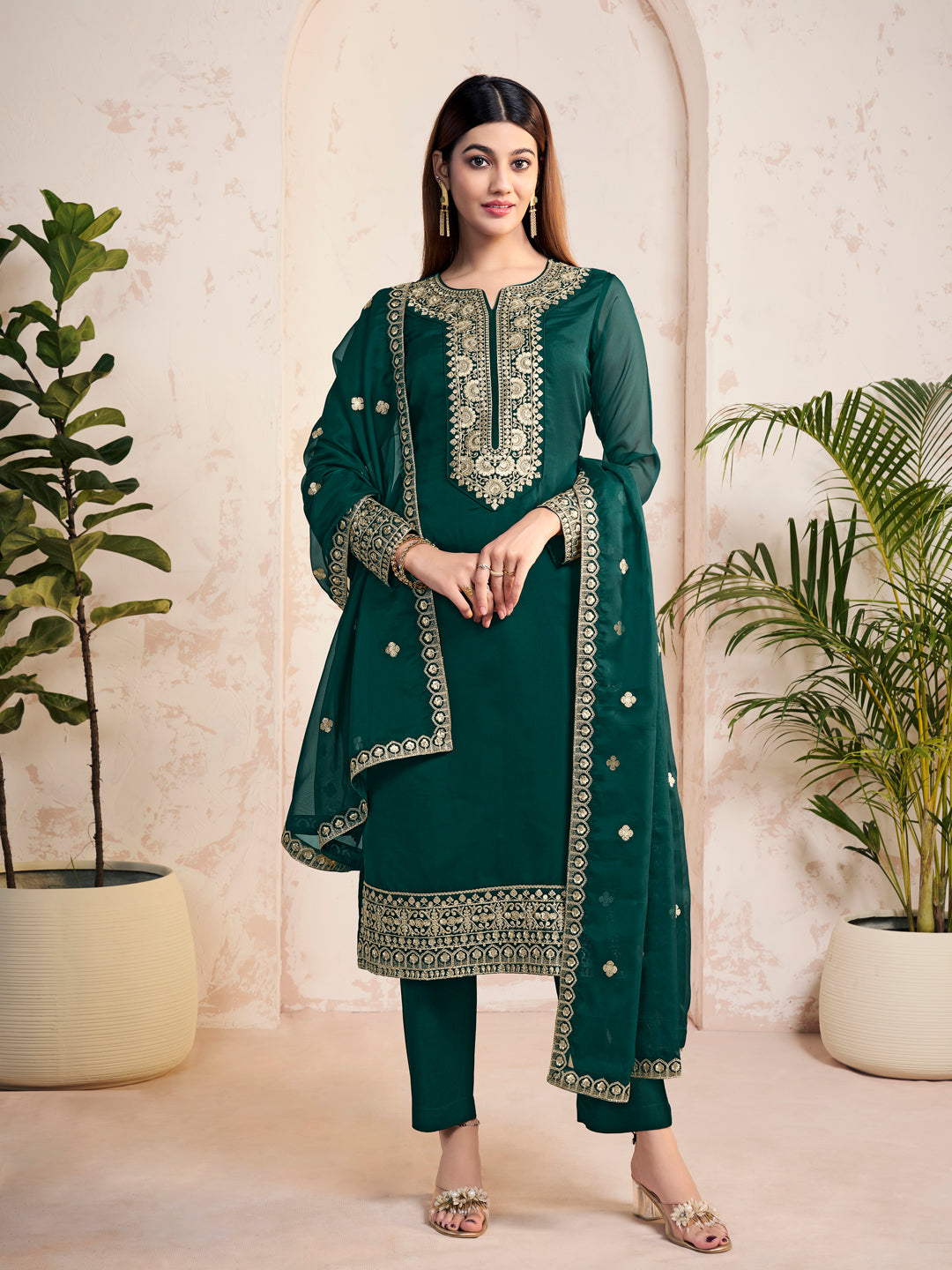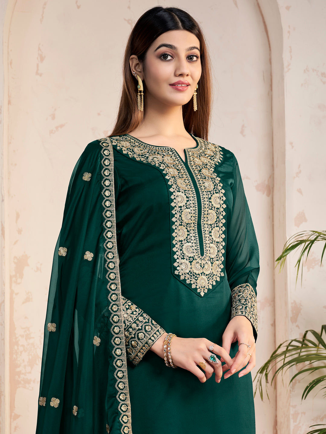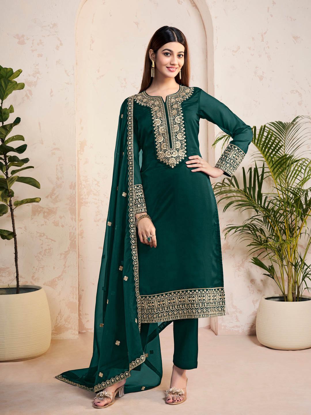 Add a touch of ethnic charm to your wardrobe with our teal embroidered kurta and trousers set. The kurta features beautifully embroidered ethnic motifs, a round neck, and long sleeves adorned with sequinned details. Made of a soft silk blend fabric, the calf-length kurta is paired with solid trousers that have a partially elasticated waistband for comfort and a slip-on closure. Complete your traditional look with the included dupatta.
