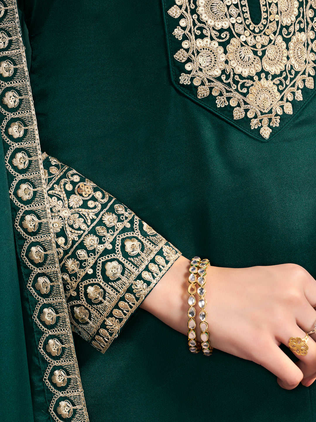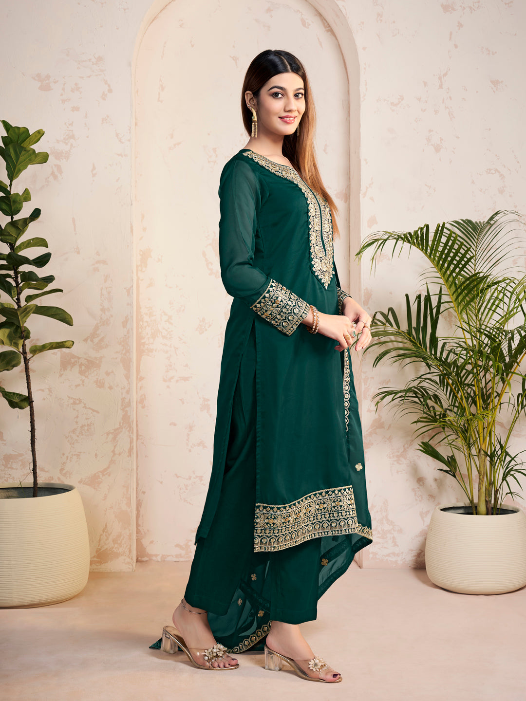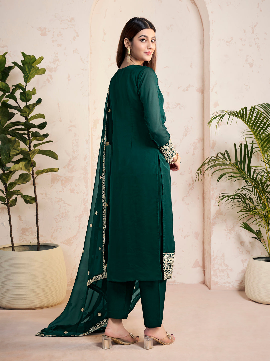 Add a touch of ethnic charm to your wardrobe with our teal embroidered kurta and trousers set. The kurta features beautifully embroidered ethnic motifs, a round neck, and long sleeves adorned with sequinned details. Made of a soft silk blend fabric, the calf-length kurta is paired with solid trousers that have a partially elasticated waistband for comfort and a slip-on closure. Complete your traditional look with the included dupatta.
