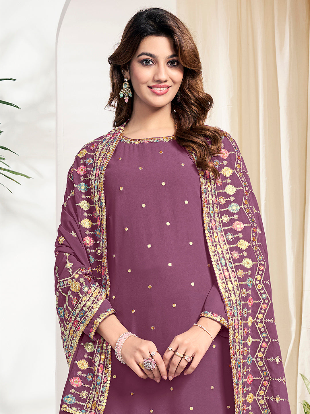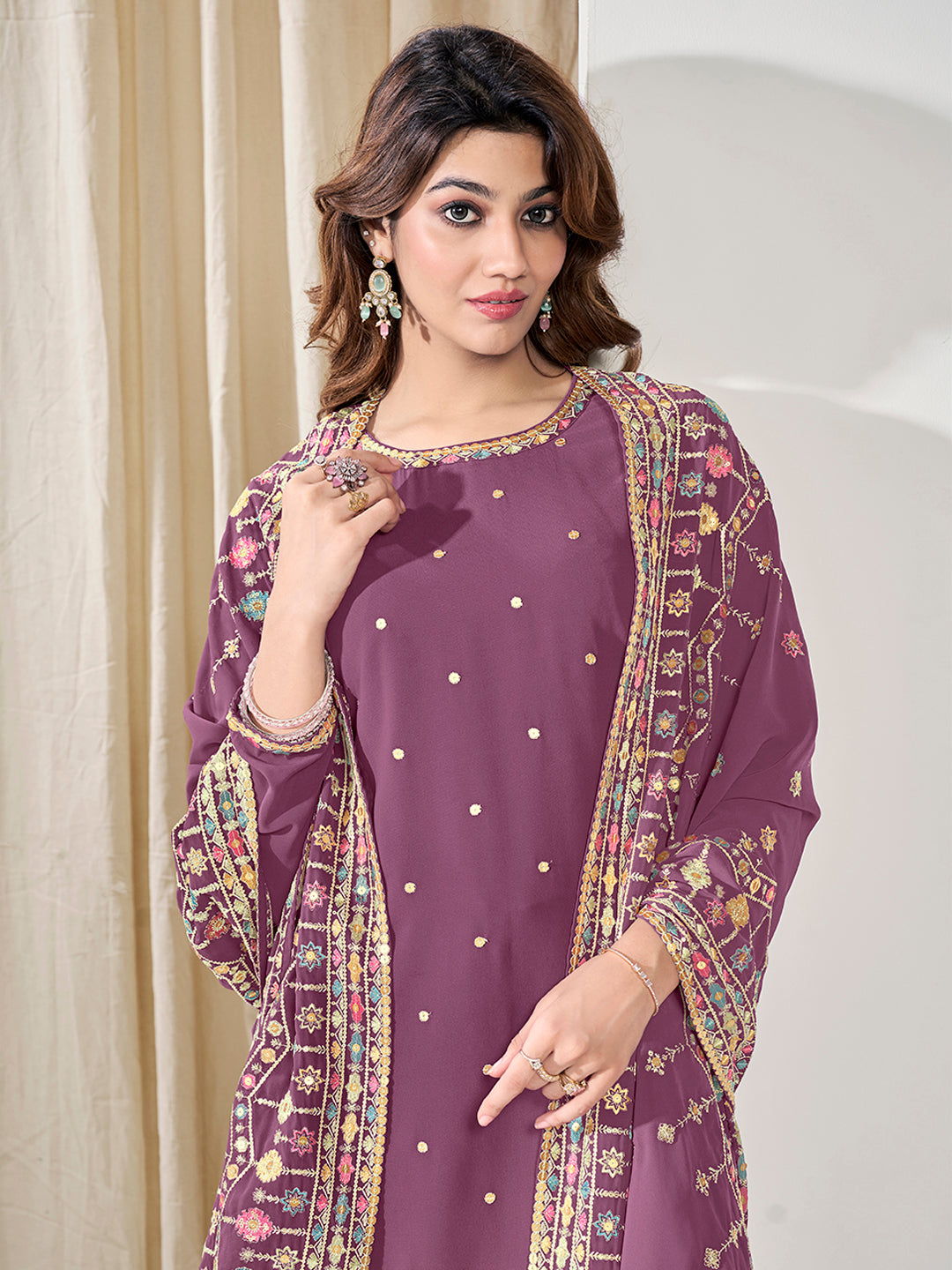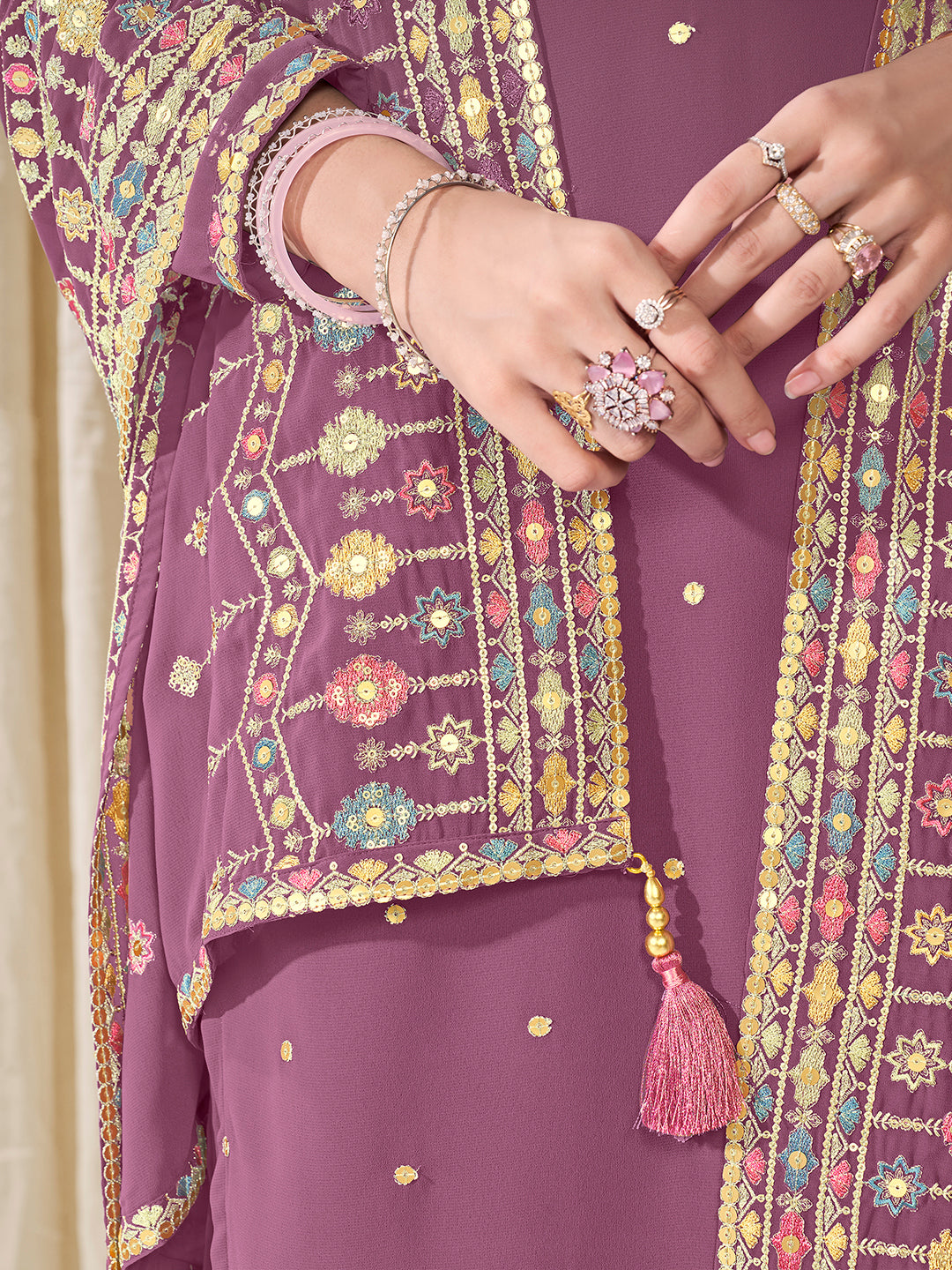 Elevate your style with our Women Ethnic Motifs Embroidered Regular Sequinned Kurta with Trousers & Dupatta. Crafted from georgette, this mauve kurta features ethnic embroidered motifs, a round neck, and long sleeves for a traditional look. The straight shape and calf-length hem offer a flattering fit. The solid trousers come with a partially elasticated waistband for comfort and a sleek slip-on closure. Perfect for any occasion.