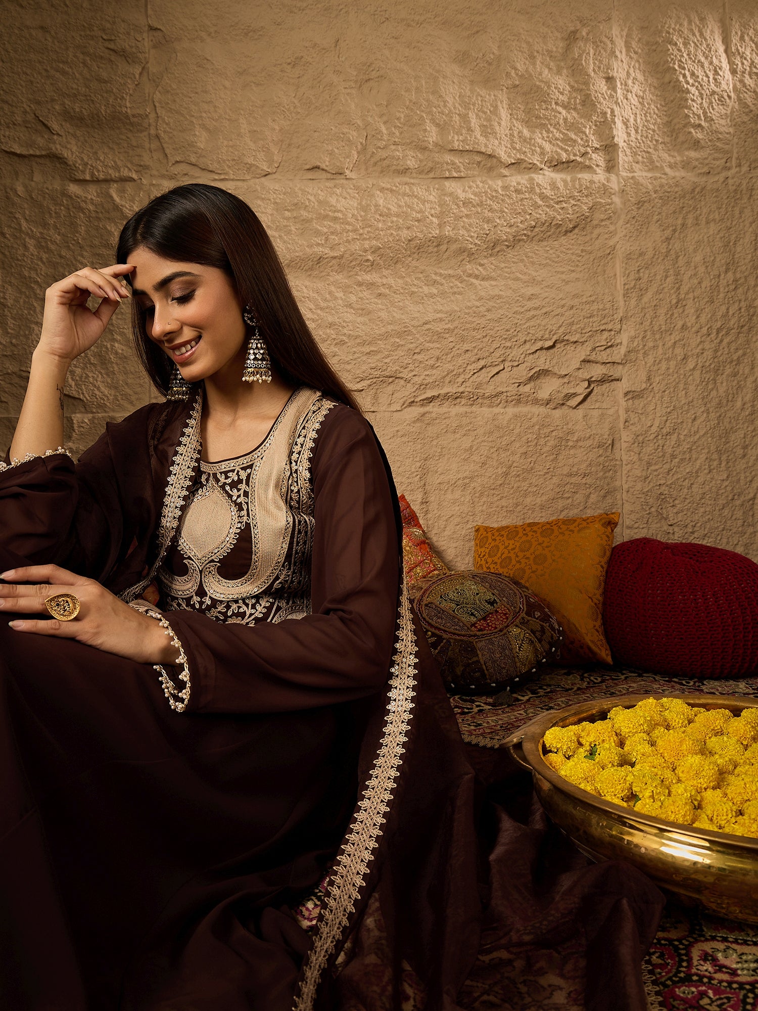 Brown embroidered Kurta with Trousers with dupatta