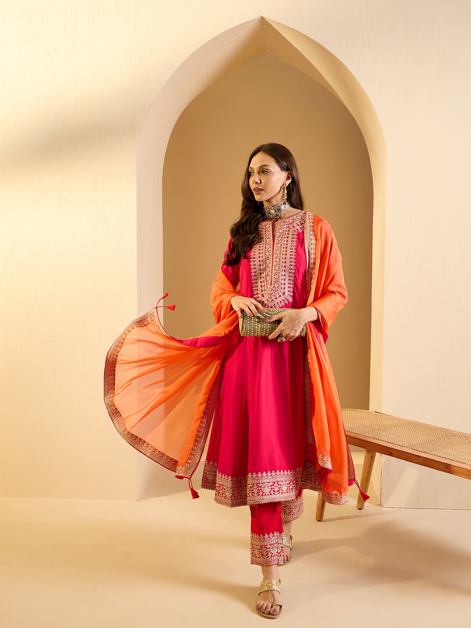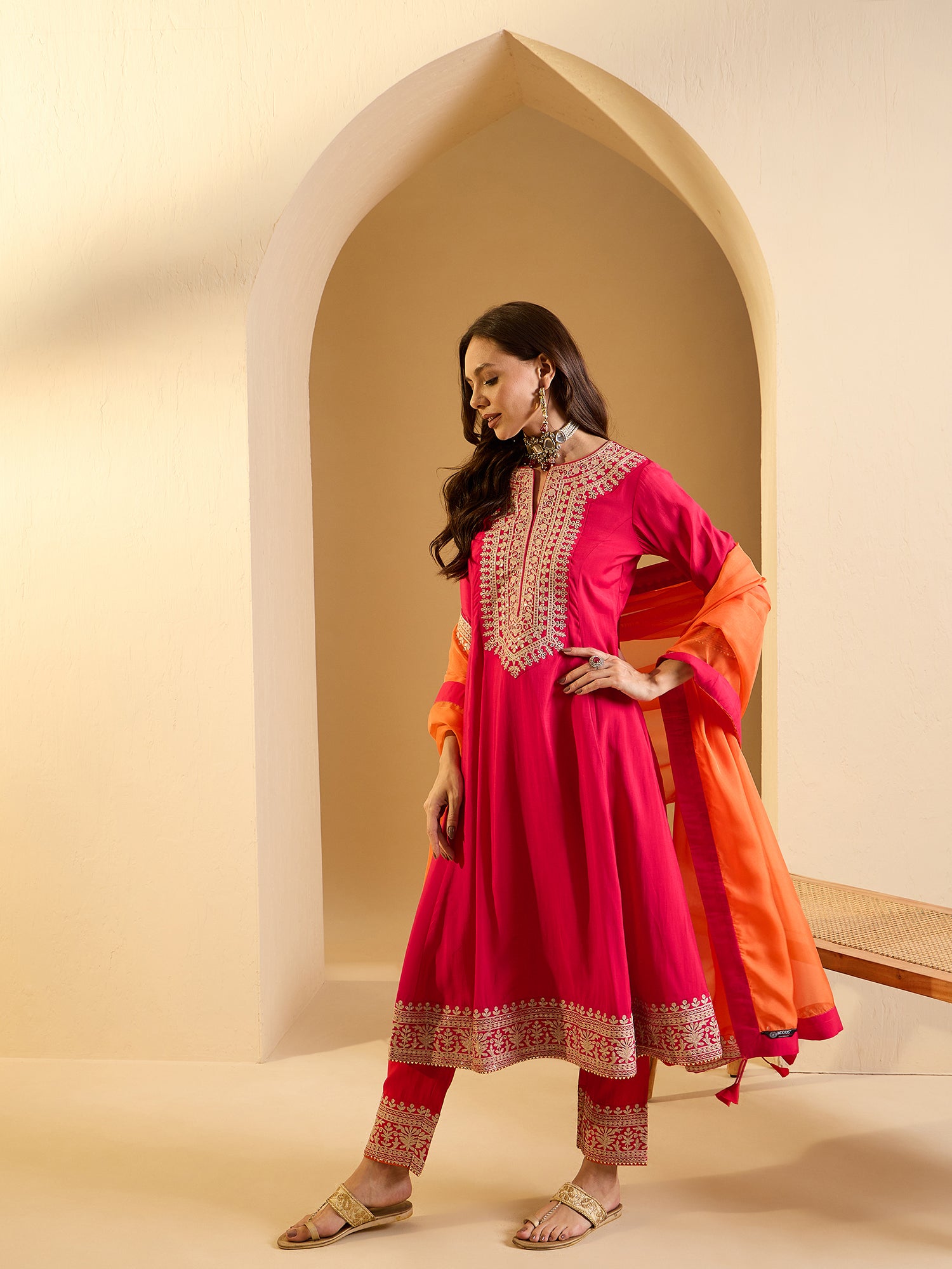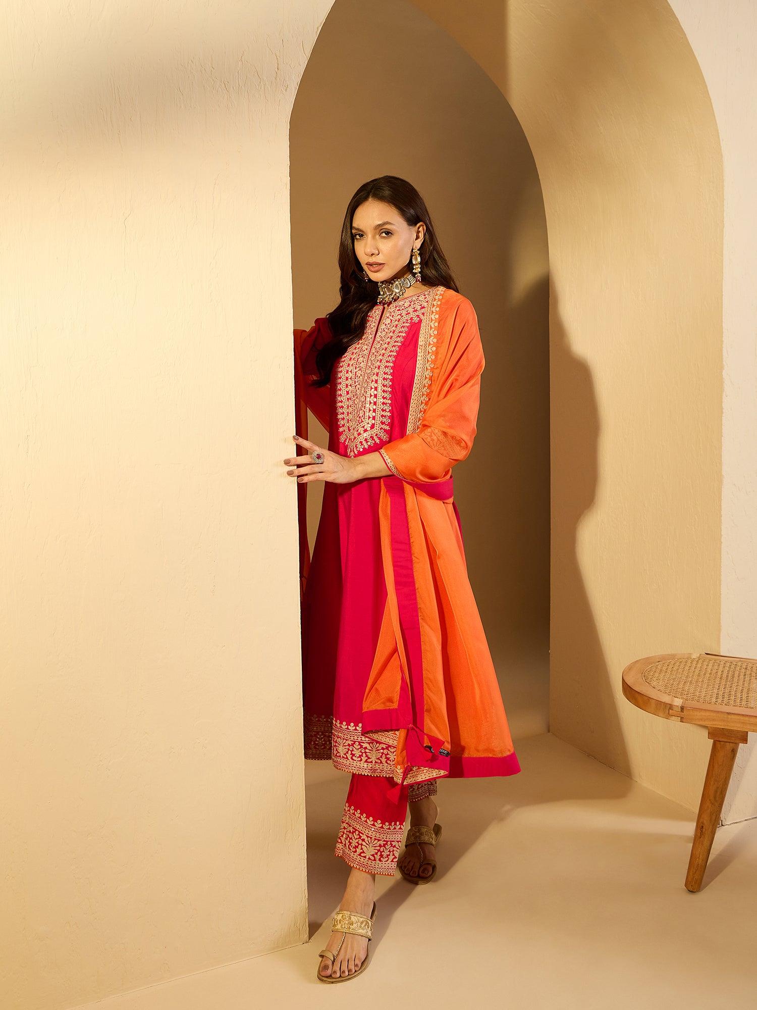 This magenta Kurta with Trousers & Dupatta will elevate your ethnic wardrobe with its embroidered ethnic motifs and thread work details. The A-line shape, mandarin collar, and flared hem add a touch of elegance. Made from a silk blend machine weave fabric, this set offers both style and comfort.