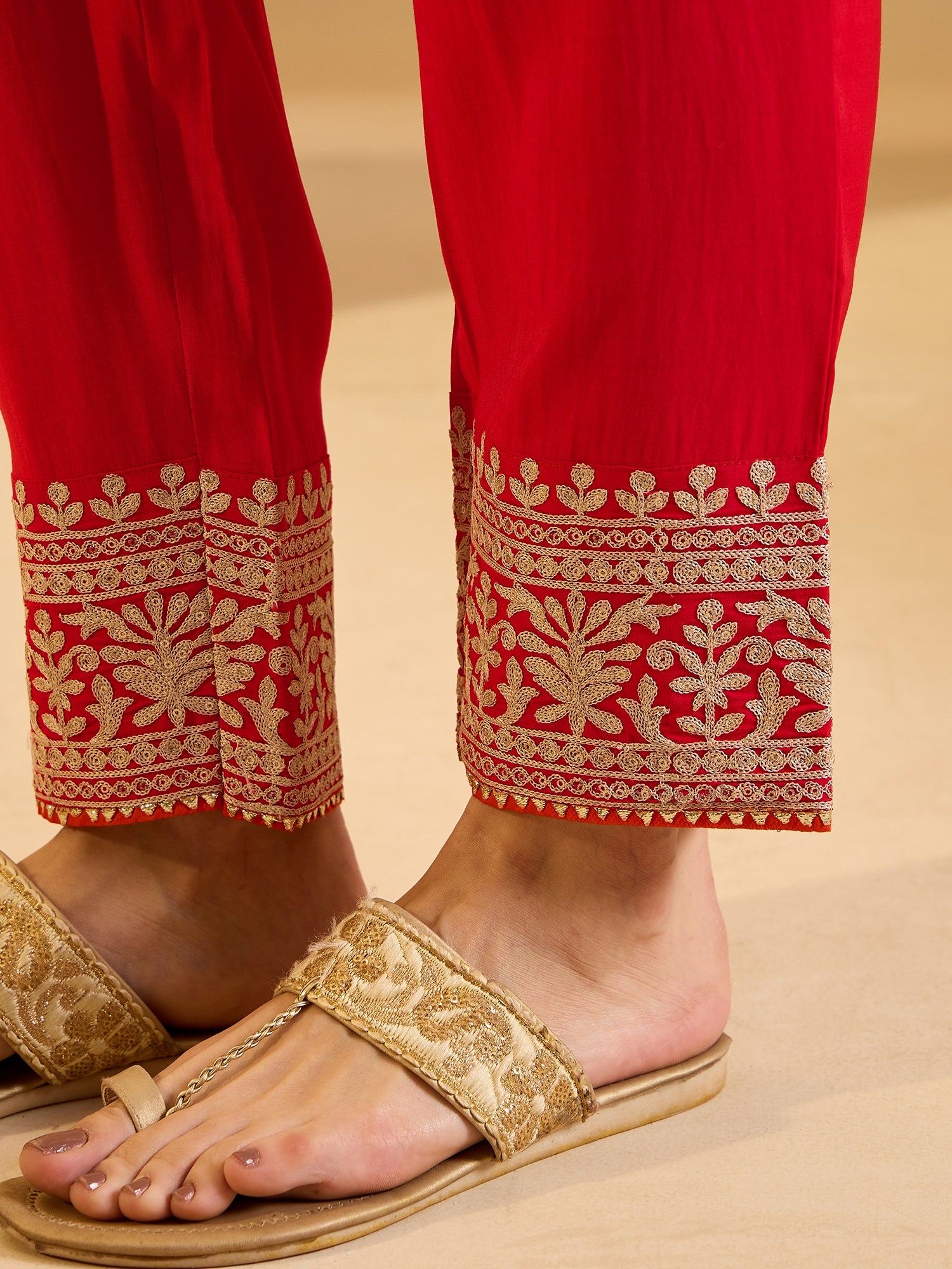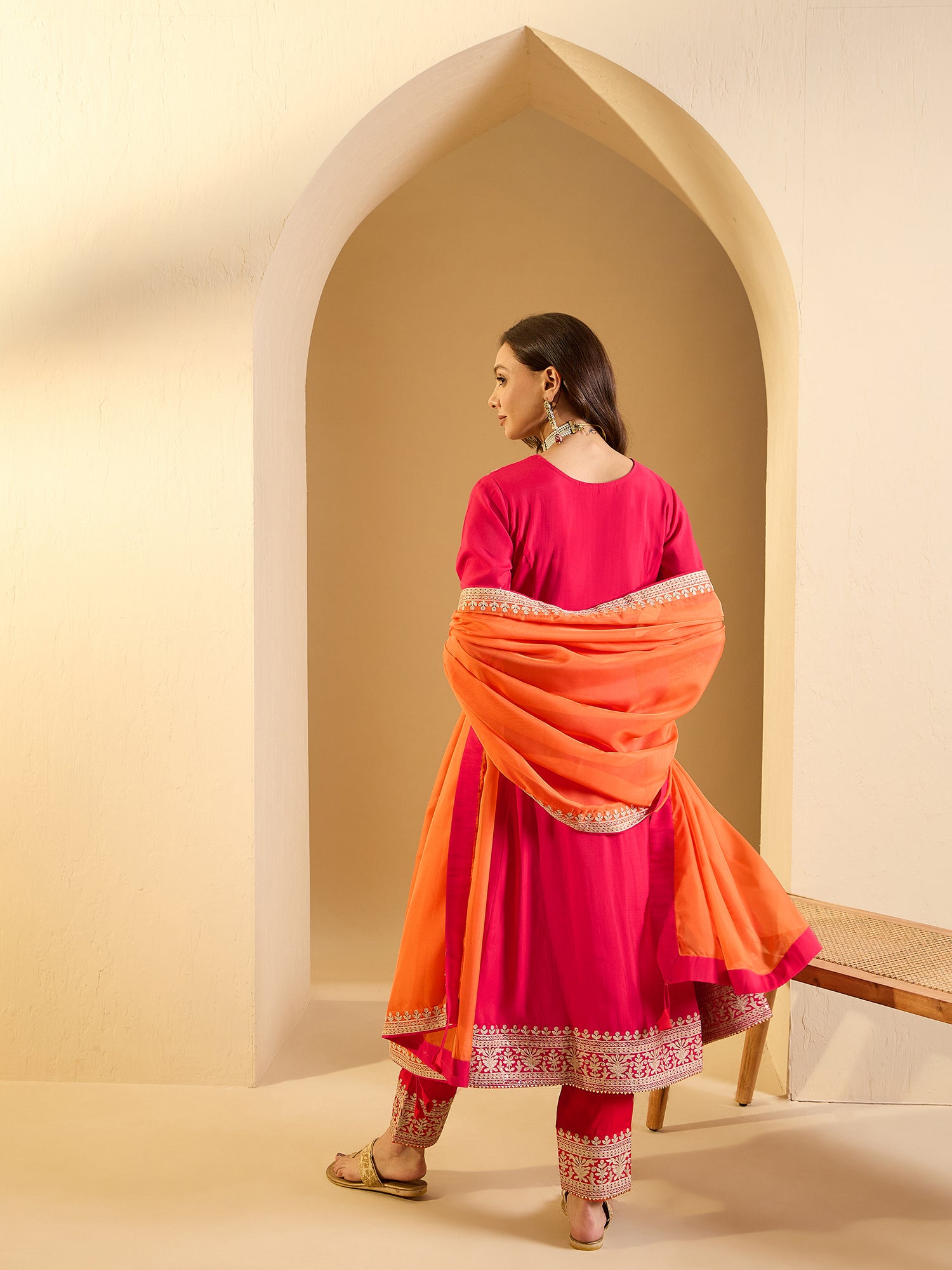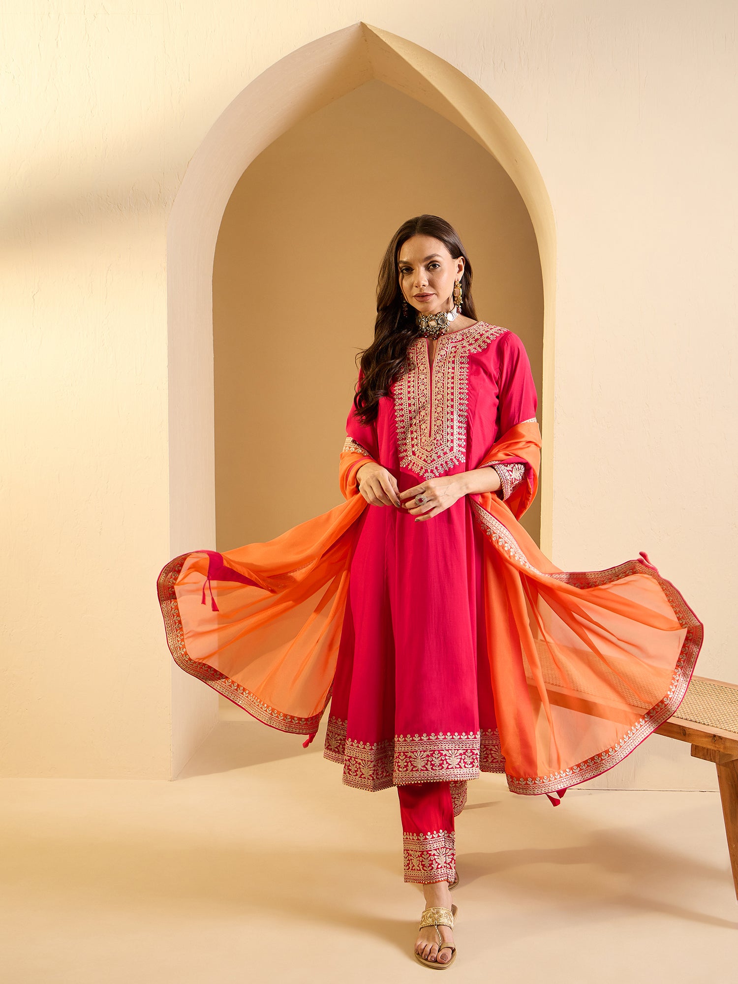 This magenta Kurta with Trousers & Dupatta will elevate your ethnic wardrobe with its embroidered ethnic motifs and thread work details. The A-line shape, mandarin collar, and flared hem add a touch of elegance. Made from a silk blend machine weave fabric, this set offers both style and comfort.