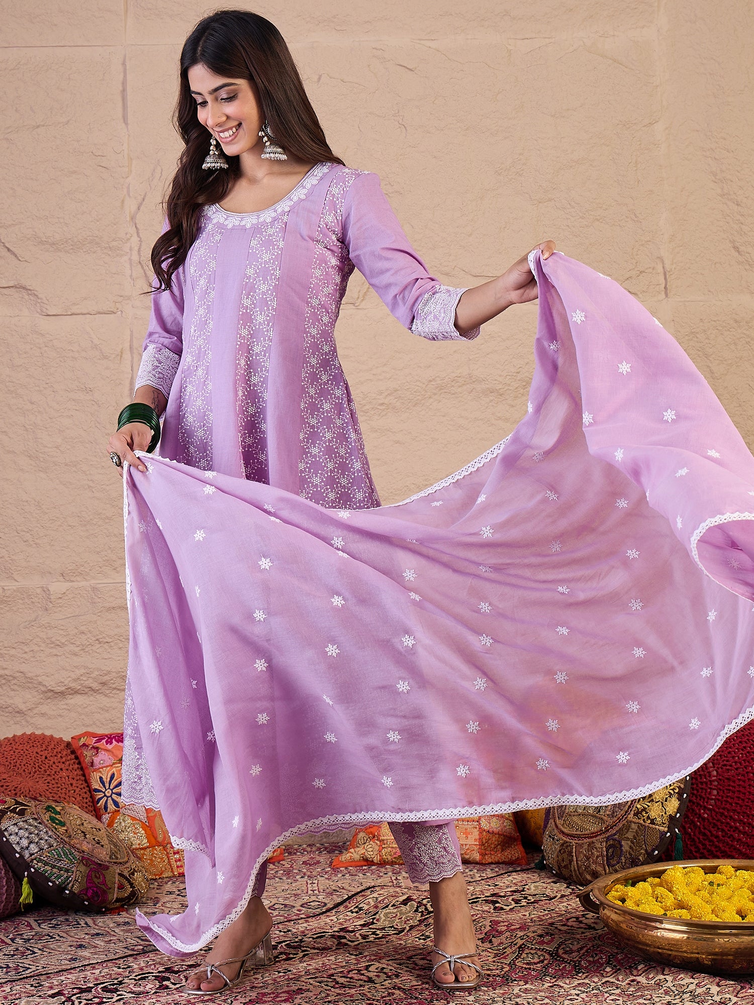 Lavender & White Printed Kurta with Trousers & Dupatta