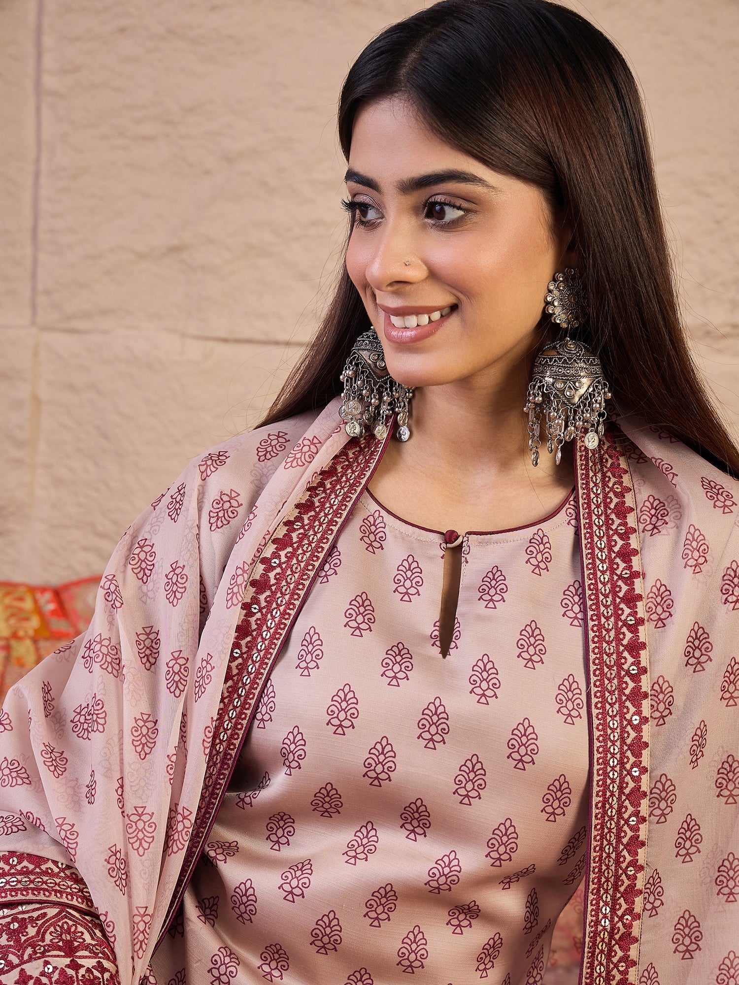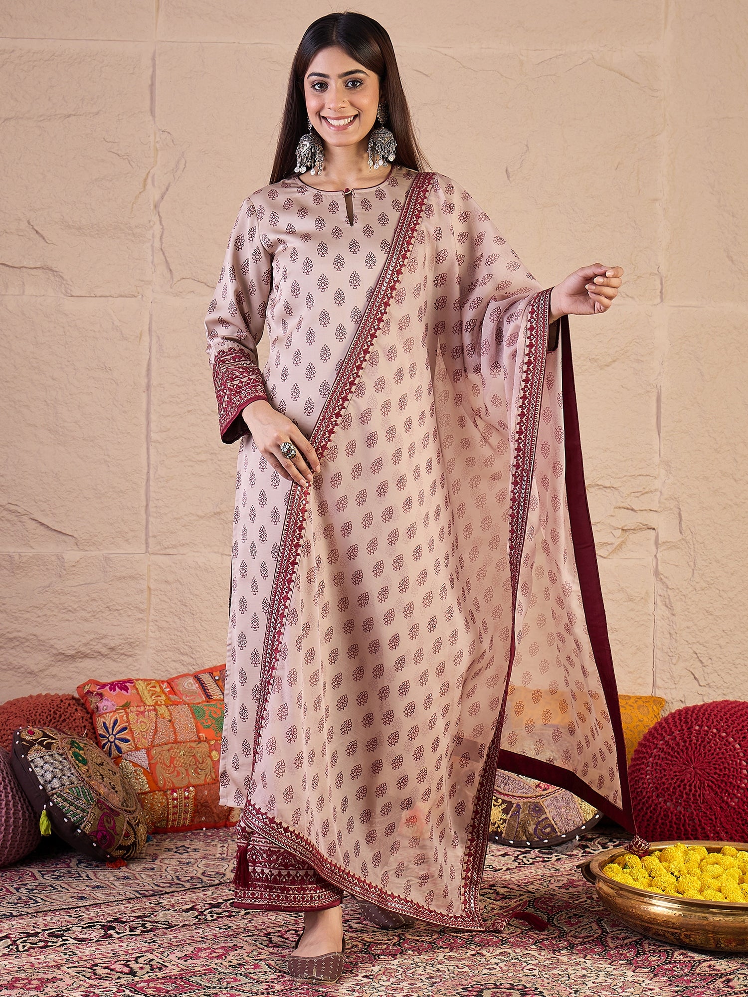 Beige printed Kurta with Palazzos with dupatta