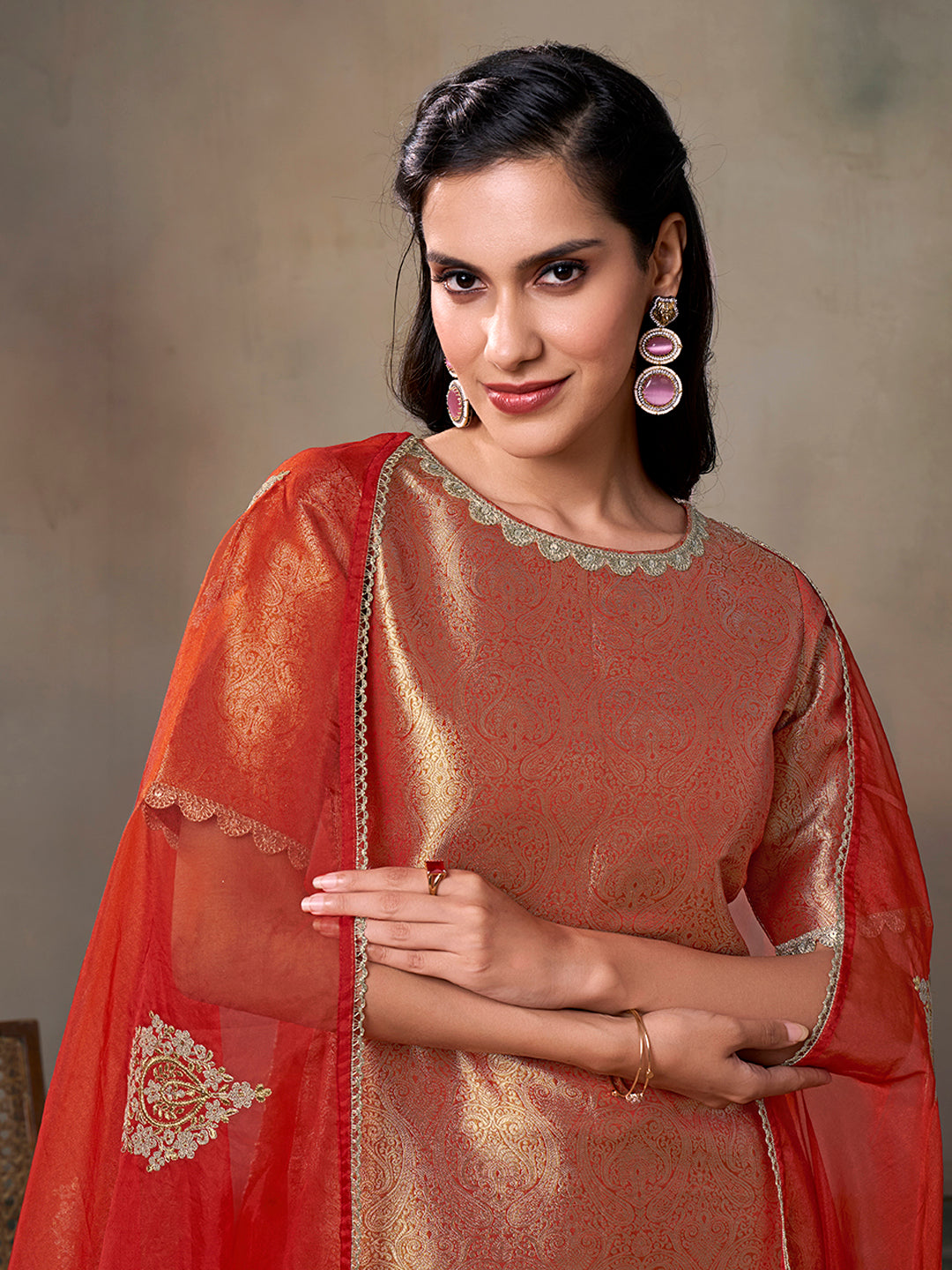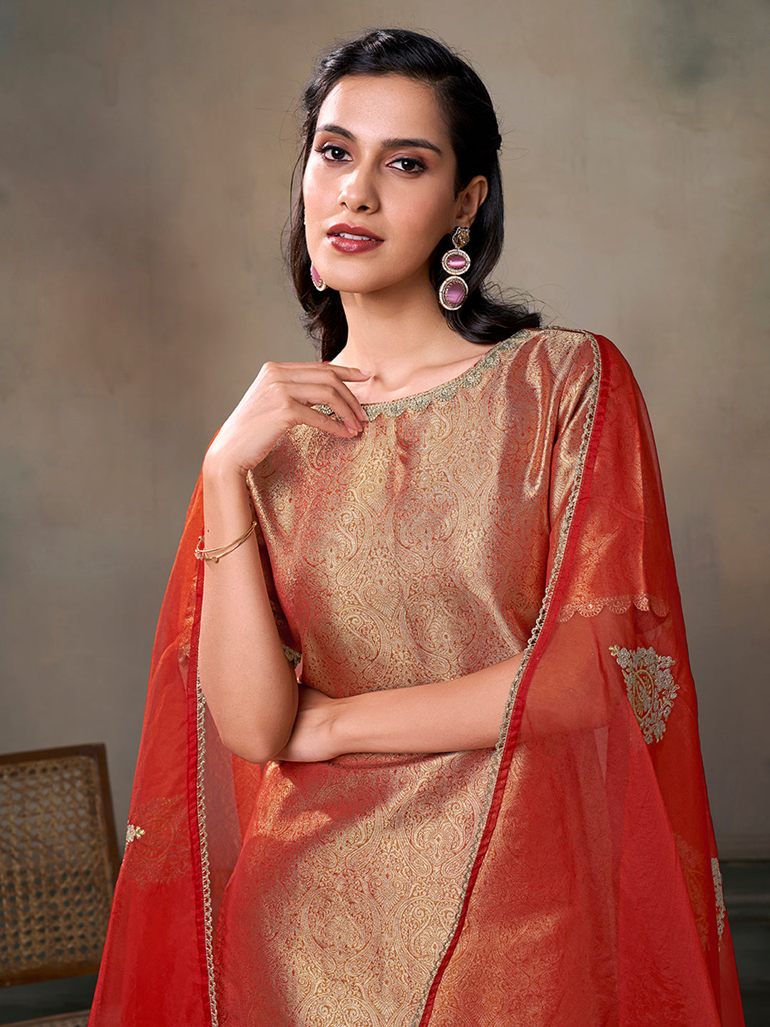 Achieve a bold and elegant look with our Women Ethnic Motifs Regular Kurta. Featuring an orange woven design with ethnic motifs, this kurta comes with matching trousers and a dupatta. The kurta is made from silk blend fabric, offering a comfortable fit with a straight shape and regular style. The trousers have a partially elasticated waistband for a customized fit, making it easy to slip on. Add a touch of sophistication to your wardrobe with this stunning ensemble.