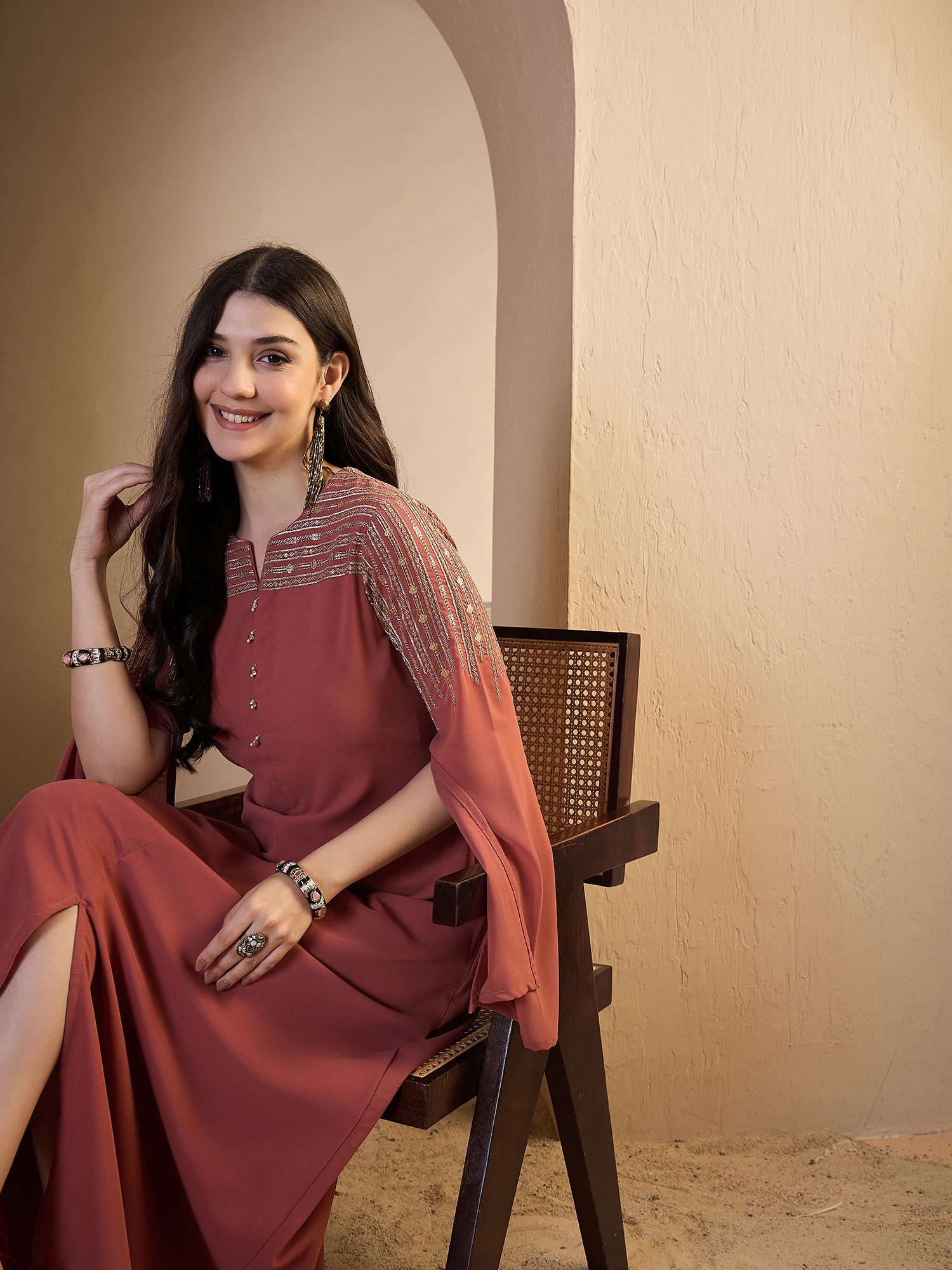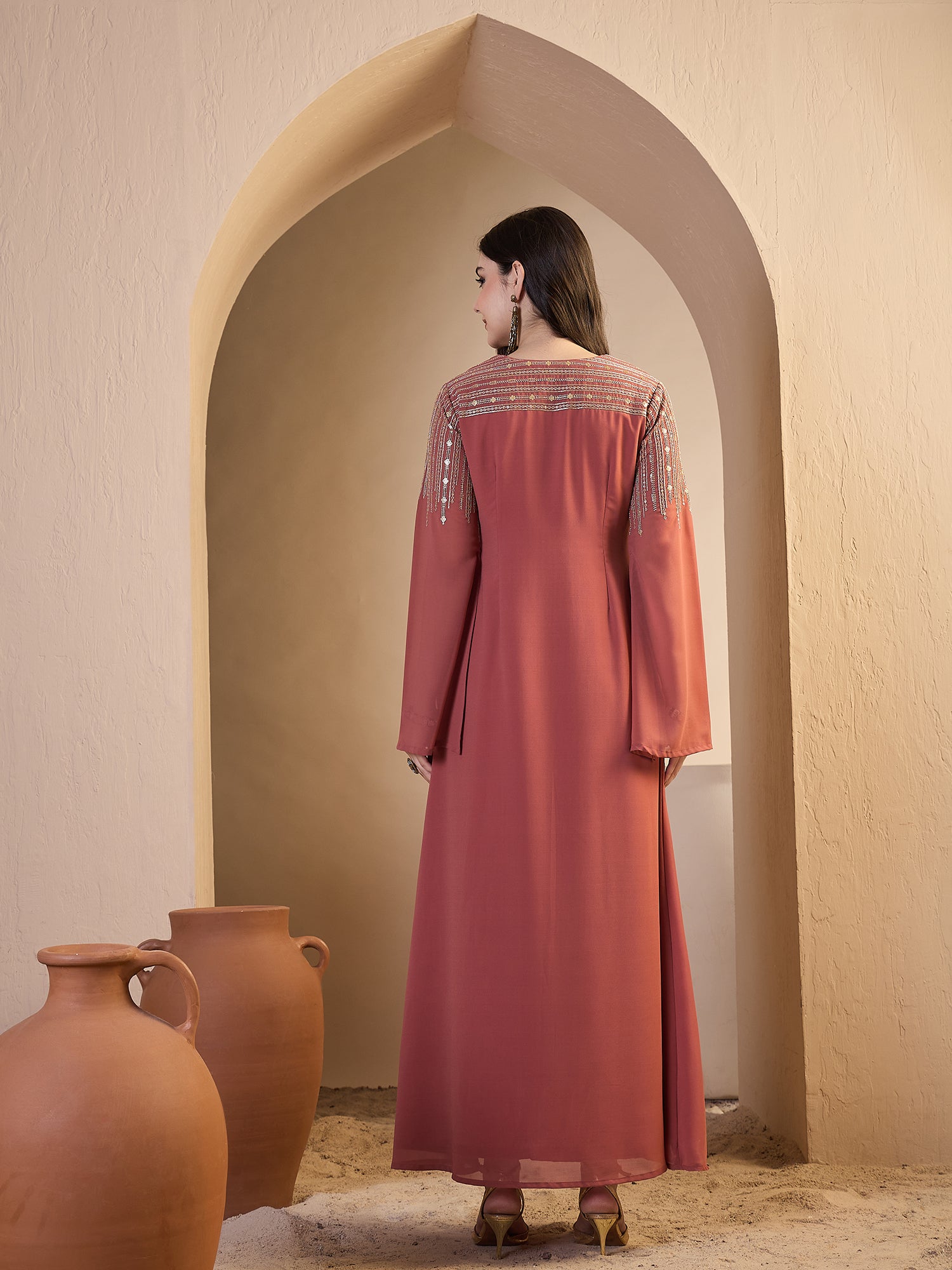 Elevate your ethnic wardrobe with this sophisticated sequinned embroidered dress, designed for the discerning woman. Crafted from premium georgette with a crepe inner lining, this piece combines comfort with refined elegance. The round neckline and long sleeves provide modest coverage, while the maxi length and gracefully flared hem create a flattering silhouette that moves with ease. Intricate ethnic motifs and delicate sequin detailing add visual interest and timeless appeal. Perfect for festive occasions, celebrations, or elevated everyday wear. Dry clean recommended to preserve the embellishments and fabric quality.