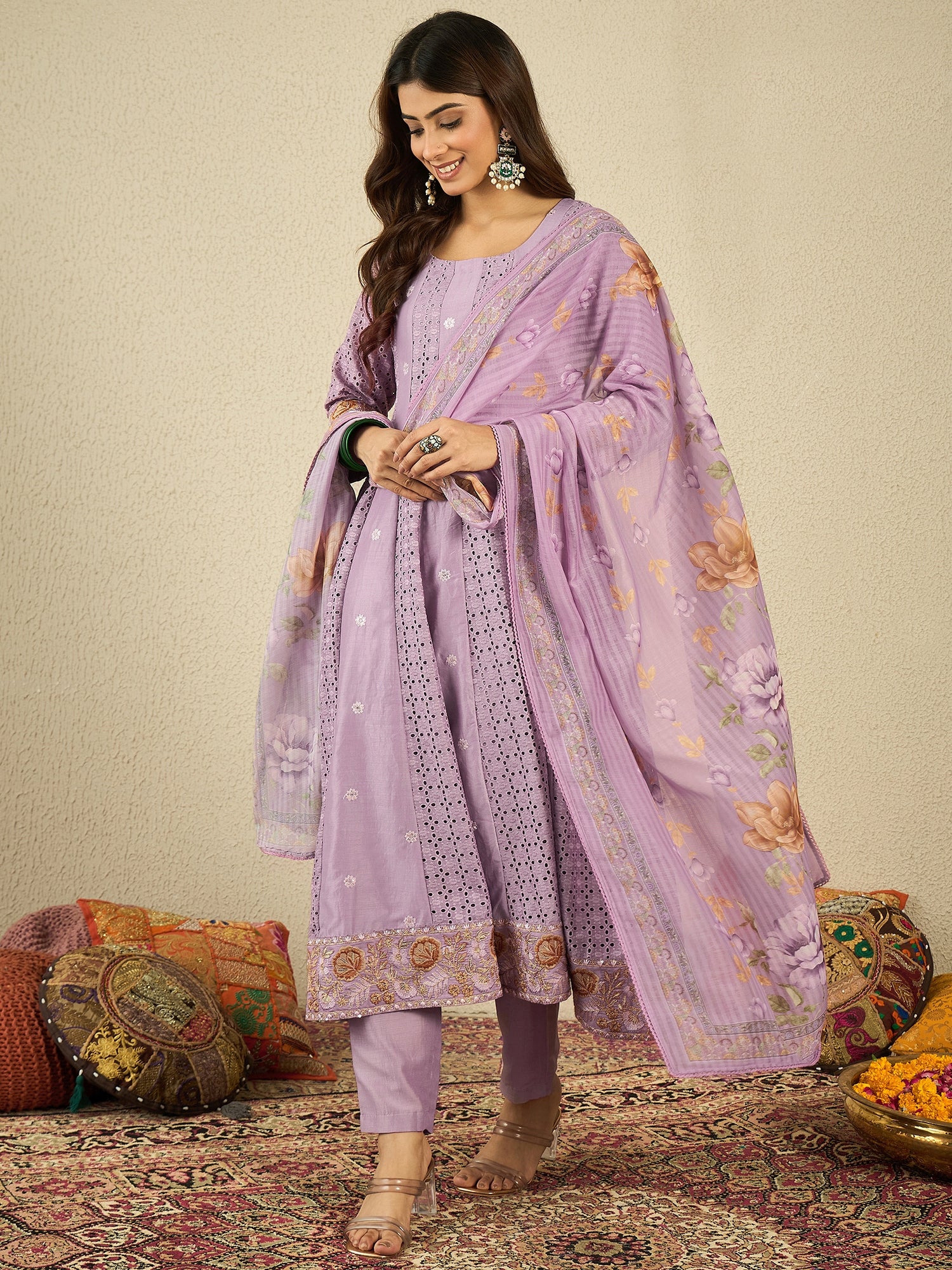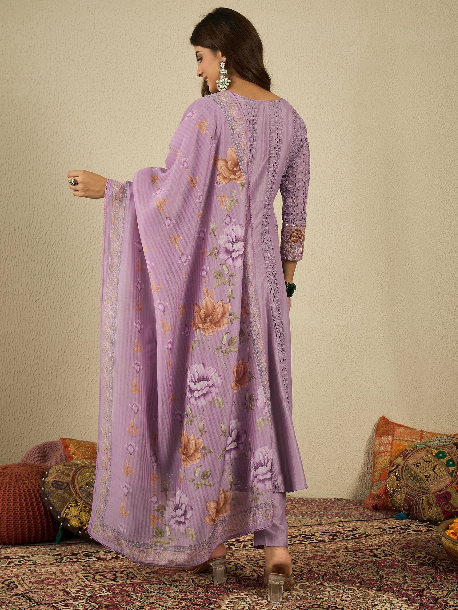 Floral - Embroidered - Lavender Kurta