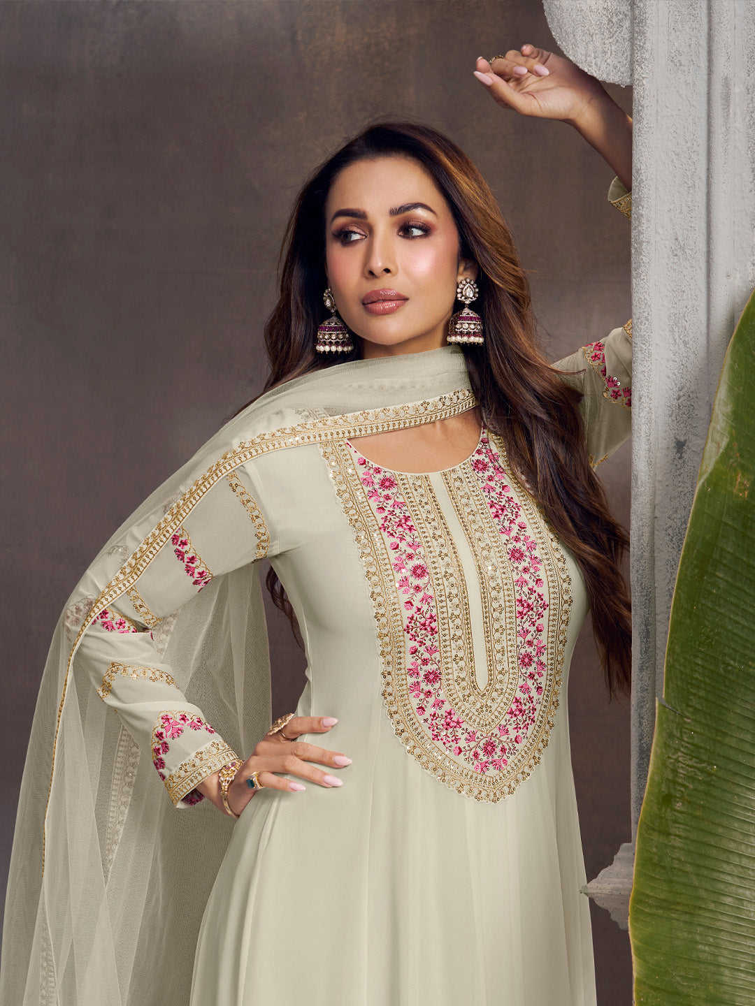 Off White, Pink, Gold Embroidered Kurta with Palazzos & Dupatta