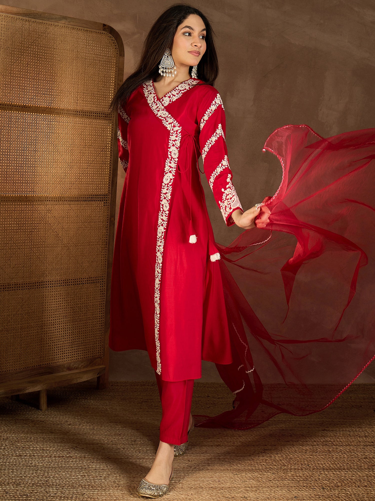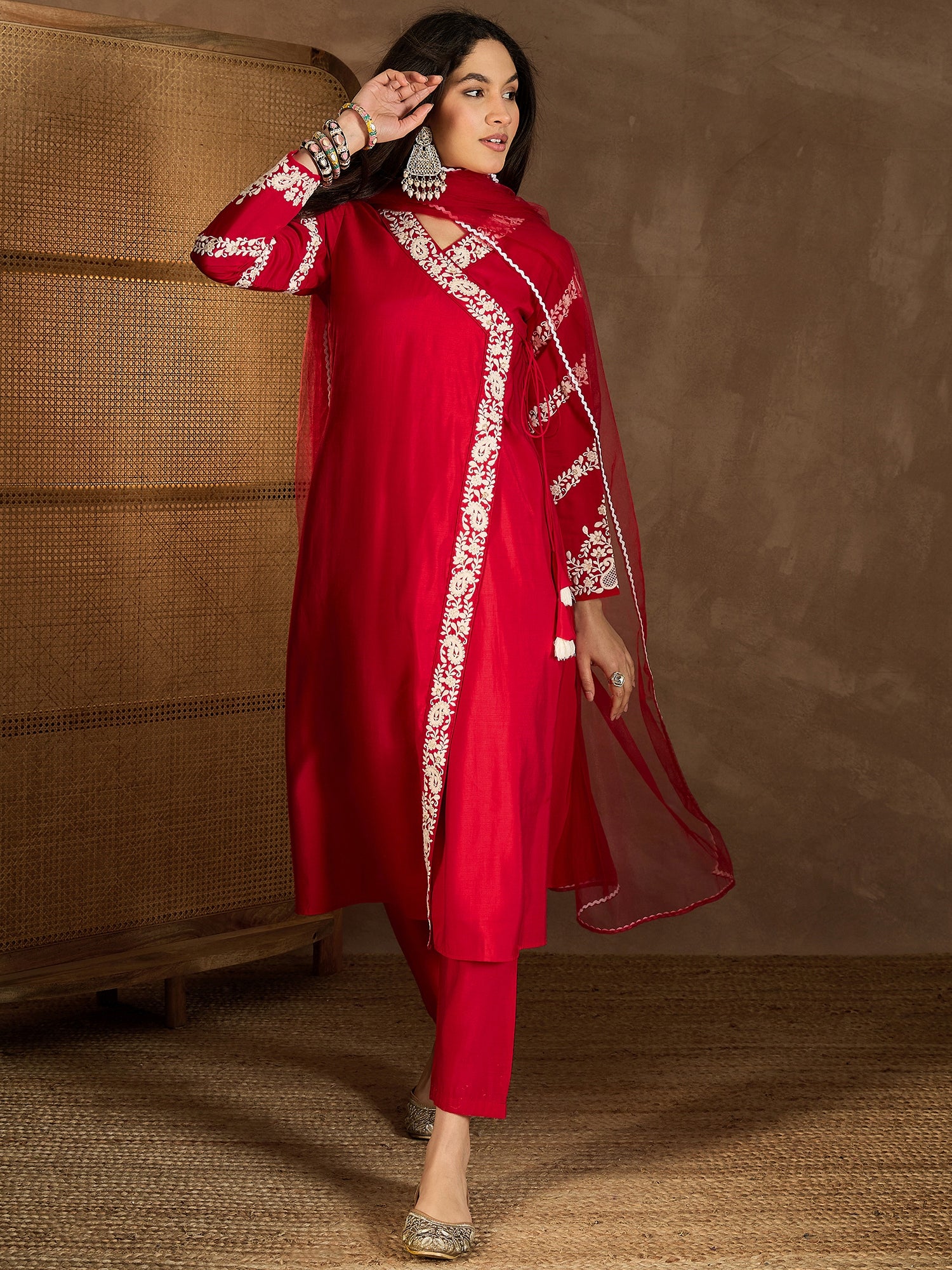 Elevate your wardrobe with our Women's Floral Embroidered Angrakha Kurta set. The red silk blend Kurta and trousers feature intricate floral embroidery, an A-line shape, and an Angrakha style. With a V-neck, long sleeves, and thread work detail, this set exudes elegance and sophistication. The partially elasticated waistband and slip-on closure of the trousers ensure comfortable wear. Complete the look with the matching dupatta. Elevate your style with this must-have set.
