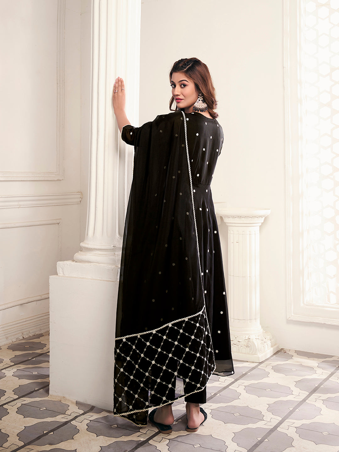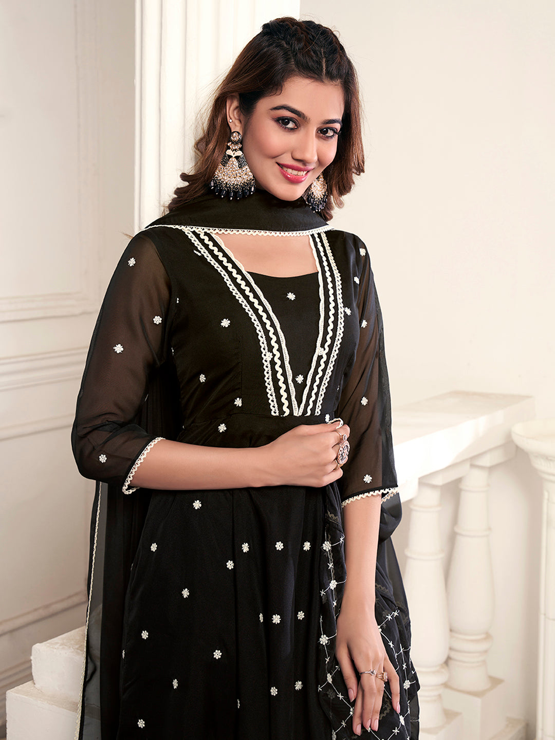 Elevate your traditional wardrobe with this black floral embroidered kurta set. Designed in an Anarkali shape with an empire style, it features a U-neck, three-quarter sleeves, and thread work detailing on the pockets. Made with organza fabric, the calf-length kurta is paired with solid trousers and an organza dupatta. Perfect for any occasion, dry clean only.
