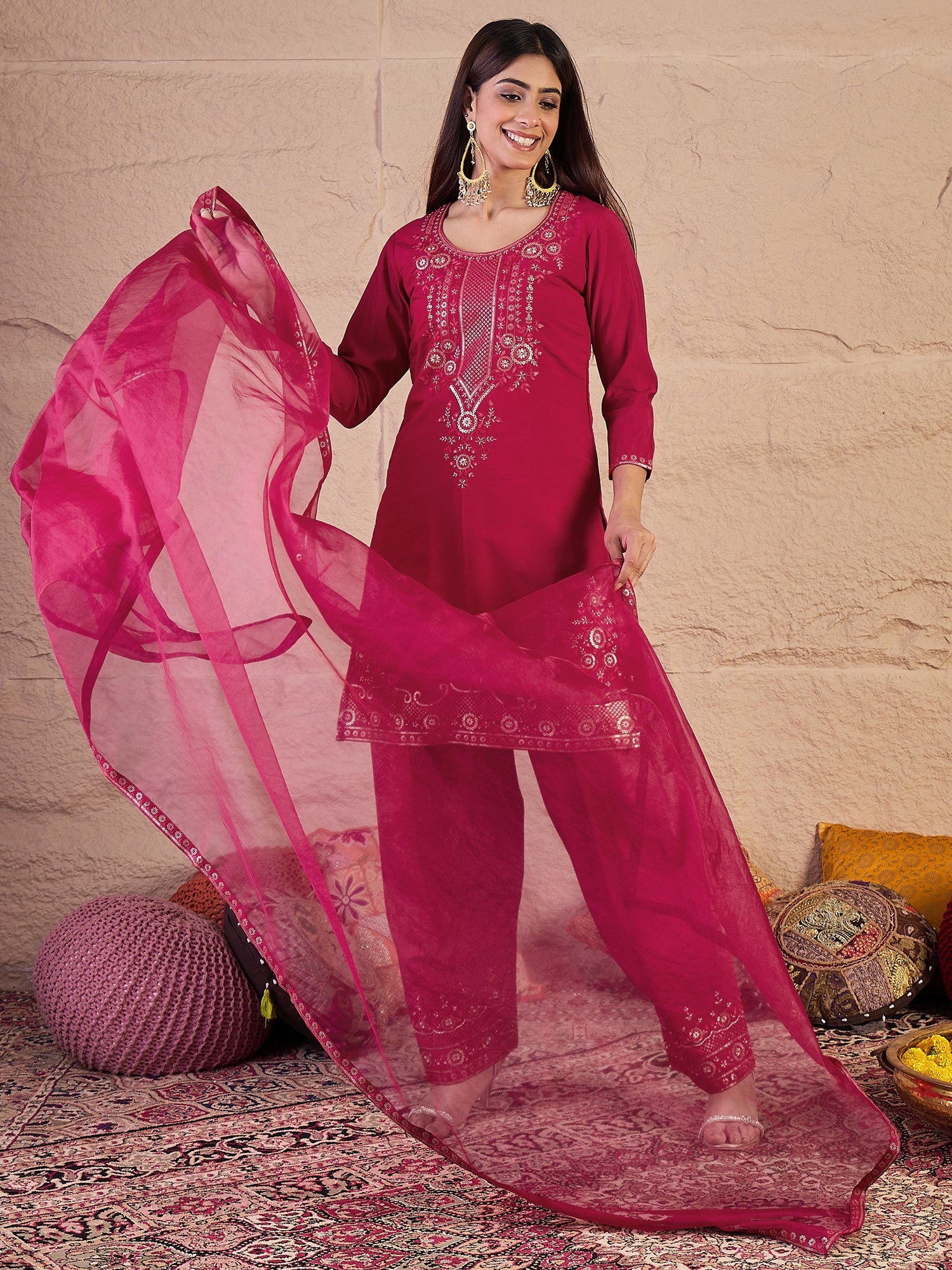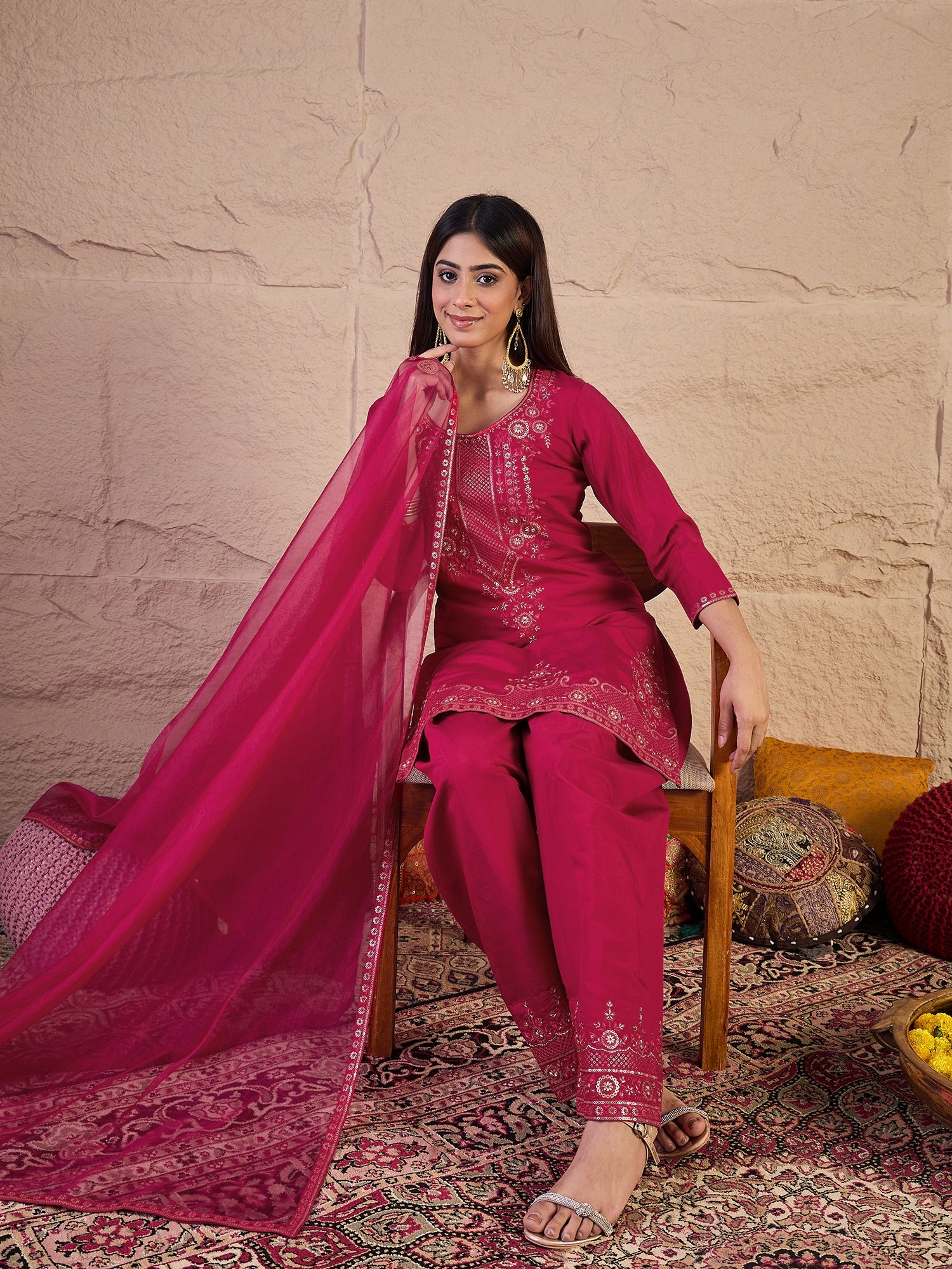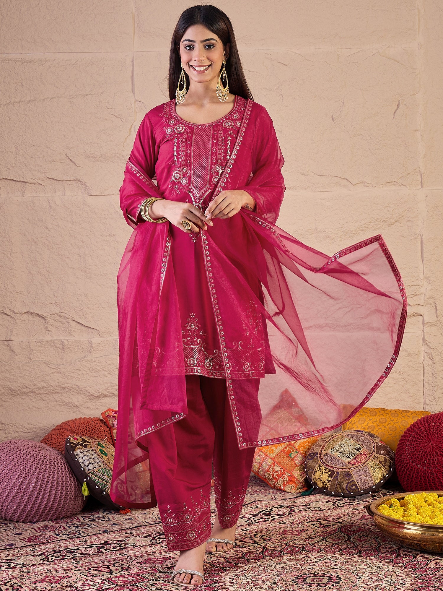 Pink & Gold Embroidered Kurta with Palazzos & Dupatta