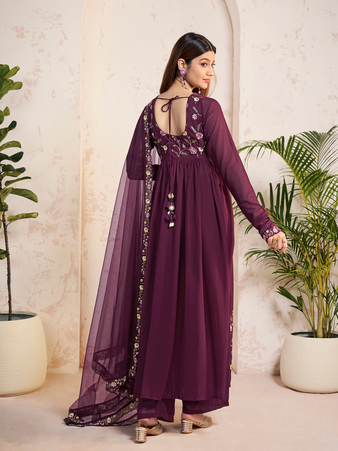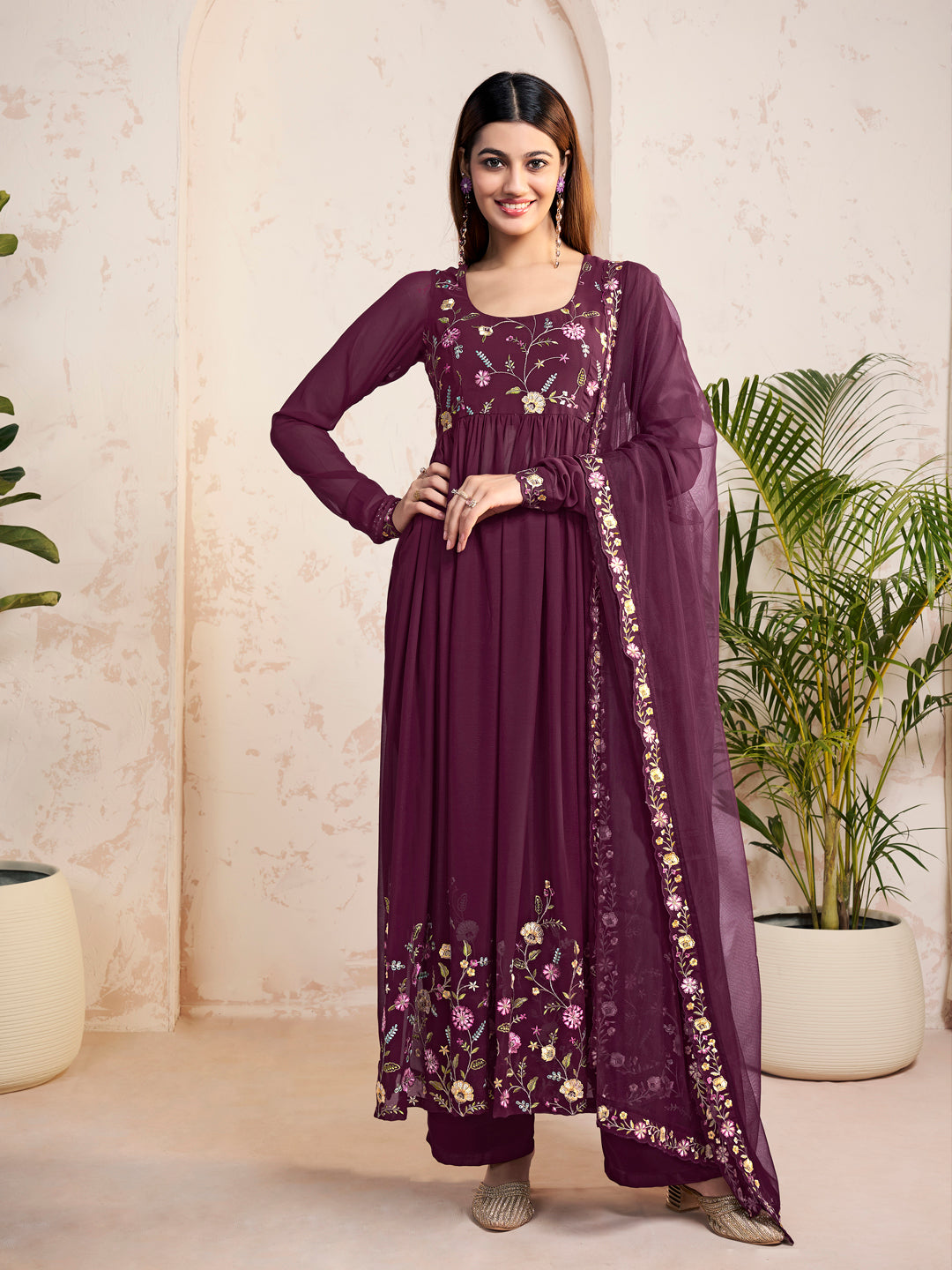 Elevate your style with our Women Floral Embroidered Kurta set. The intricately designed Purple Kurta features stunning floral embroidery, pleated details, and a flattering A-line shape. Made from Georgette fabric, it offers a comfortable fit and sophisticated style. The set includes solid Palazzos with an elasticated waistband for ease of wear. Slip on the Dupatta for an elegant finishing touch to your look.