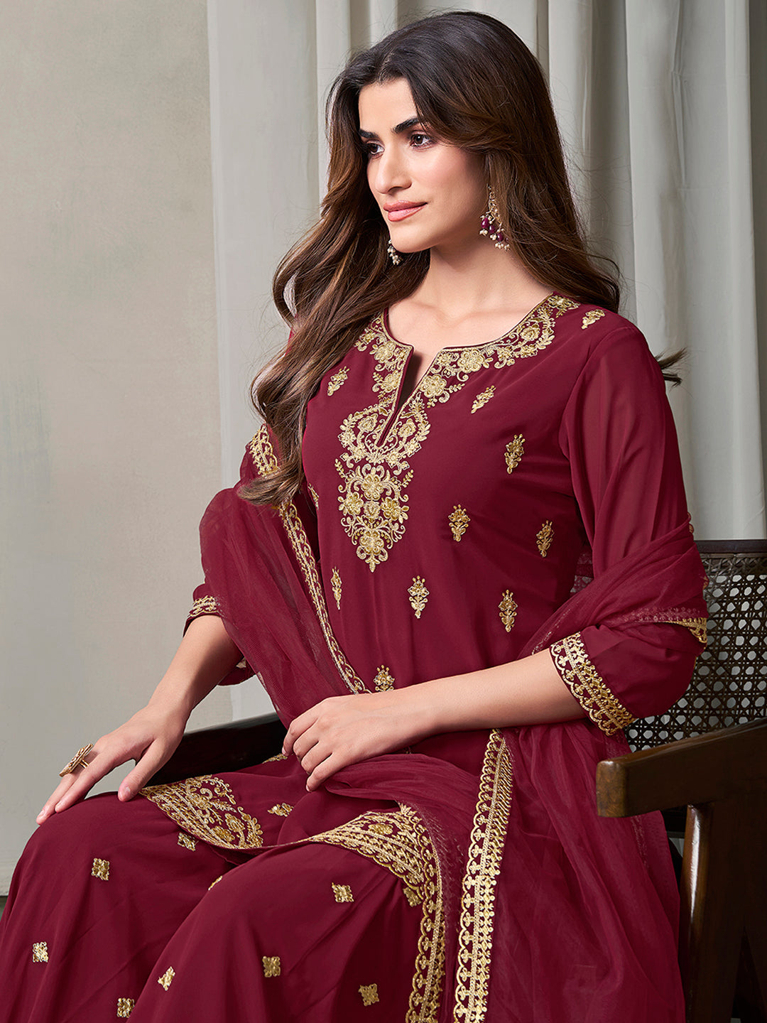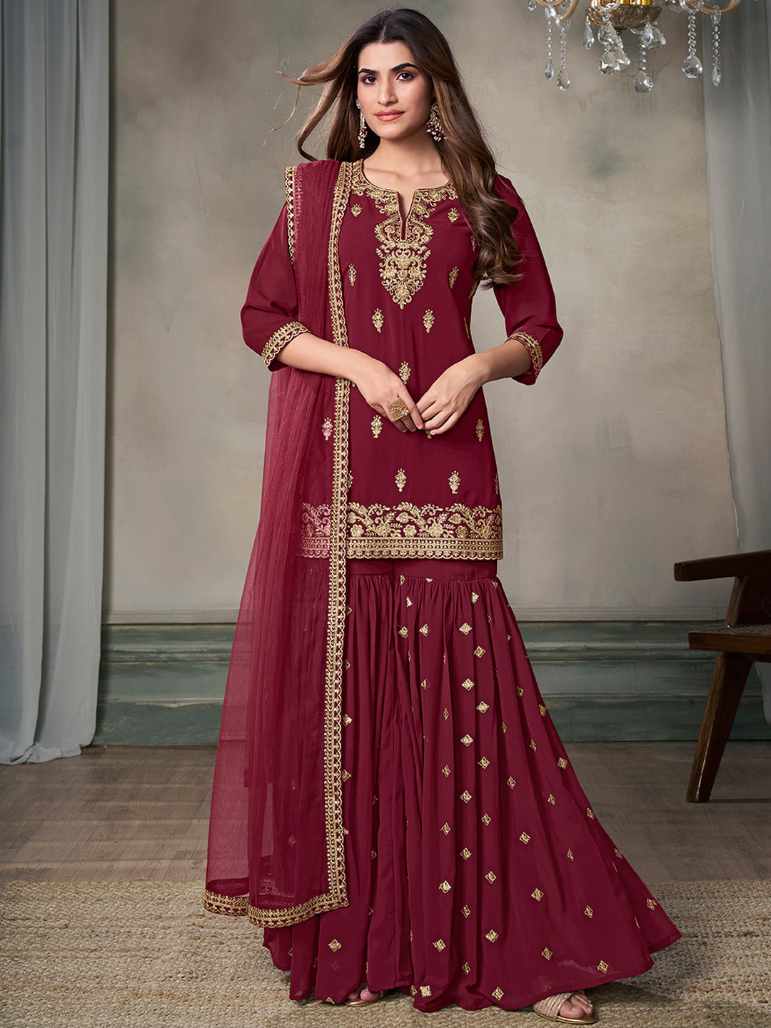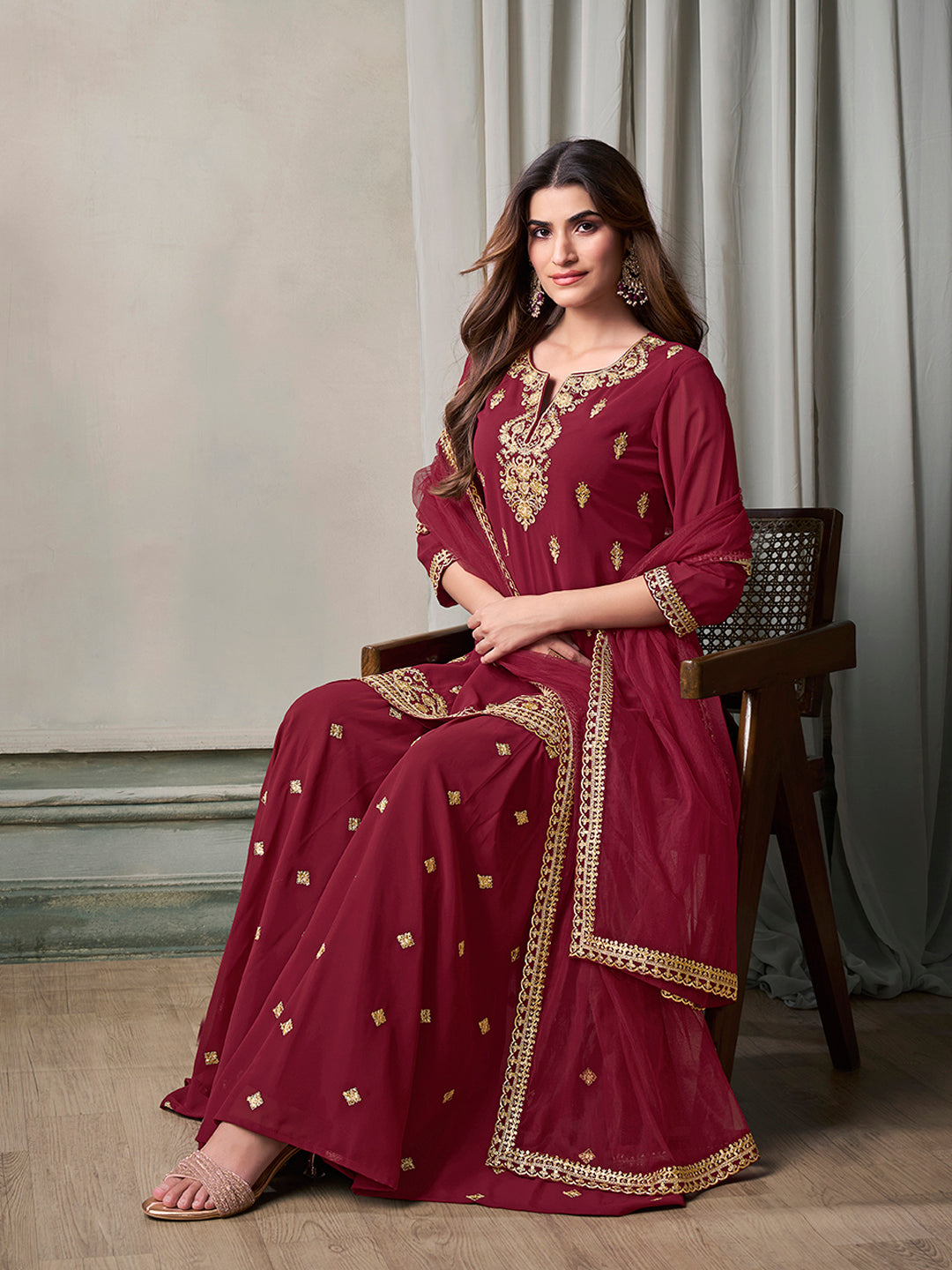 Achieve effortless elegance with our Women Floral Embroidered Kurta, Sharara, and Dupatta set. The maroon kurta features delicate floral embroidery and a round neck, while the sharara boasts an embroidered design with a partially elasticated waistband for comfortable wear. Made with high-quality georgette and net fabrics, this set is perfect for any occasion.