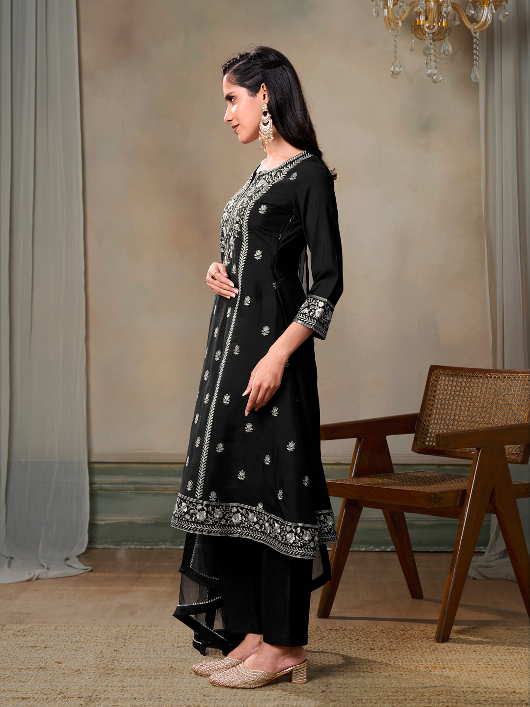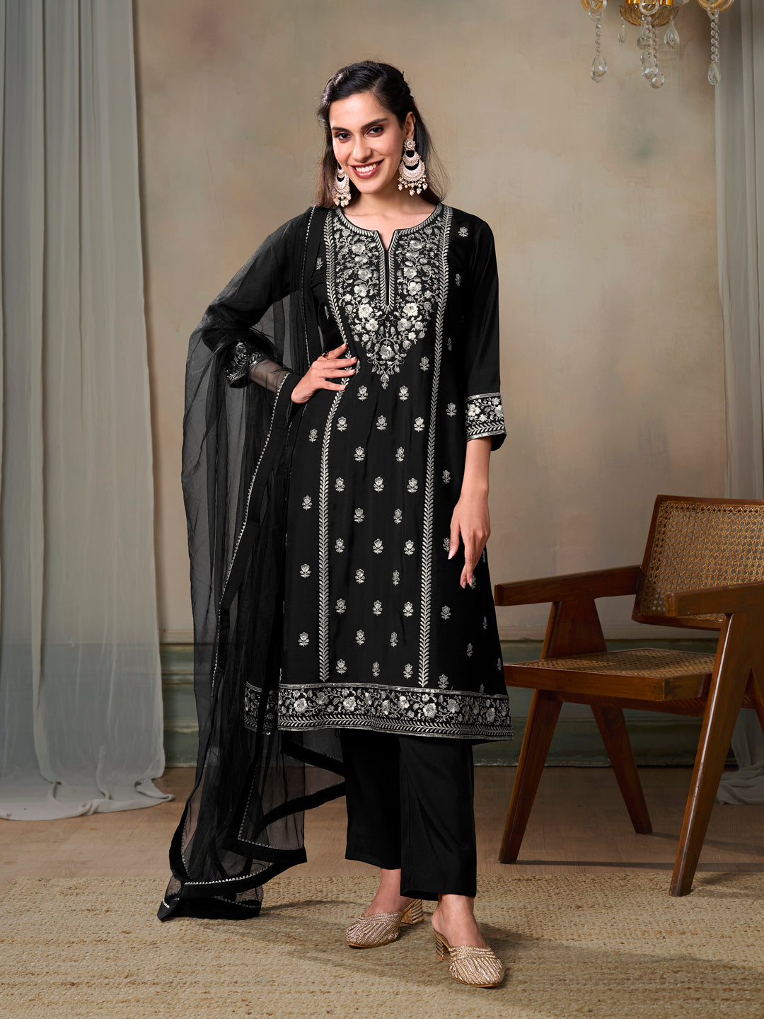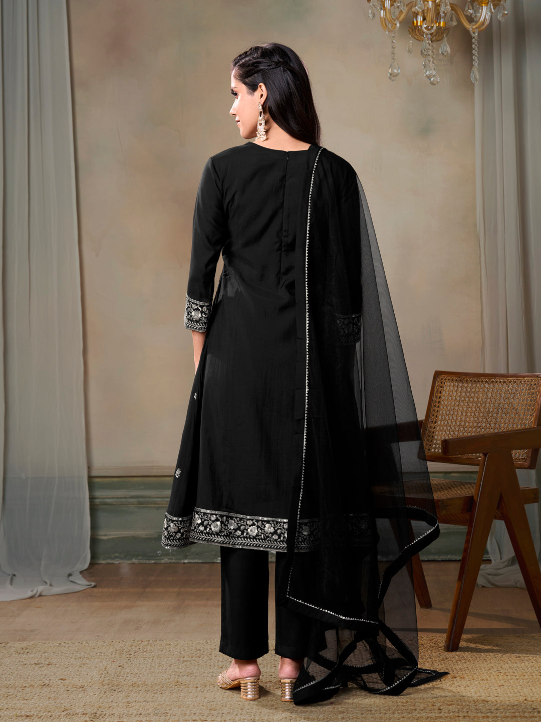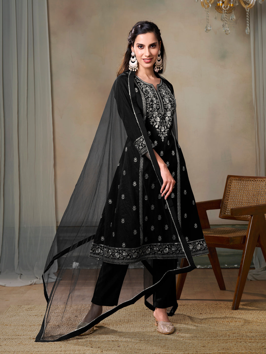 Elevate your wardrobe with our Women Floral Embroidered Kurta set. The Anarkali shape and regular style add sophistication, while the floral embroidery and sequinned details provide an exquisite touch. Crafted from a silk blend fabric, the calf length Kurta features a flared hem and round neck, making it perfect for any occasion. The solid Trousers with an elasticated waistband and slip-on closure provide comfort and style. Complete the look with the included dupatta.