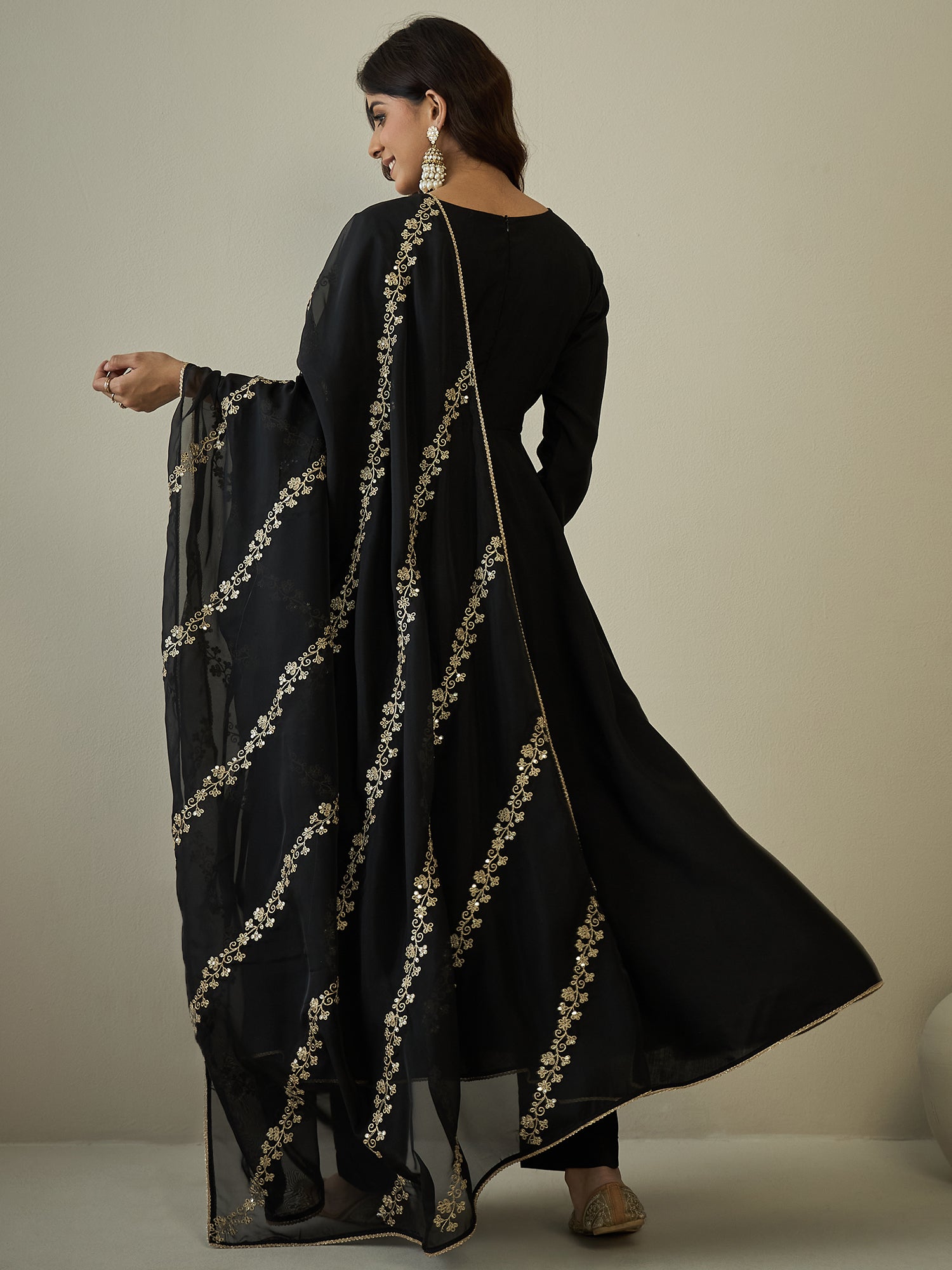 This beautiful black embroidered kurta is designed with a feminine floral pattern and a comfortable A-line shape. The regular style features a scoop neck, three-quarter sleeves, and a sequinned detail on the pockets. Made from a luxurious silk blend fabric, the calf length kurta is paired with solid trousers that have a partially elasticated waistband for a perfect fit. Complete your ethnic look with this elegant ensemble, perfect for any occasion.