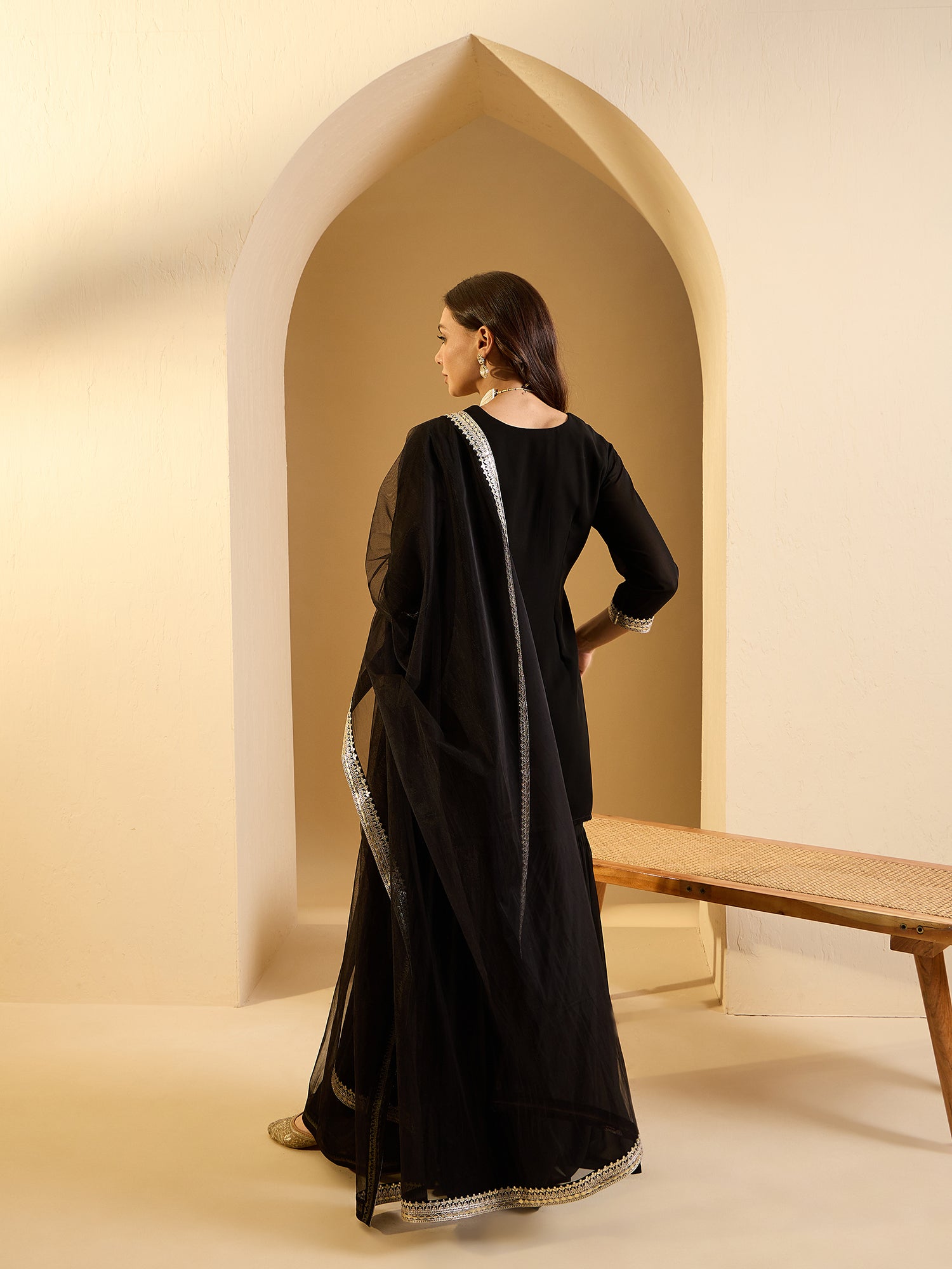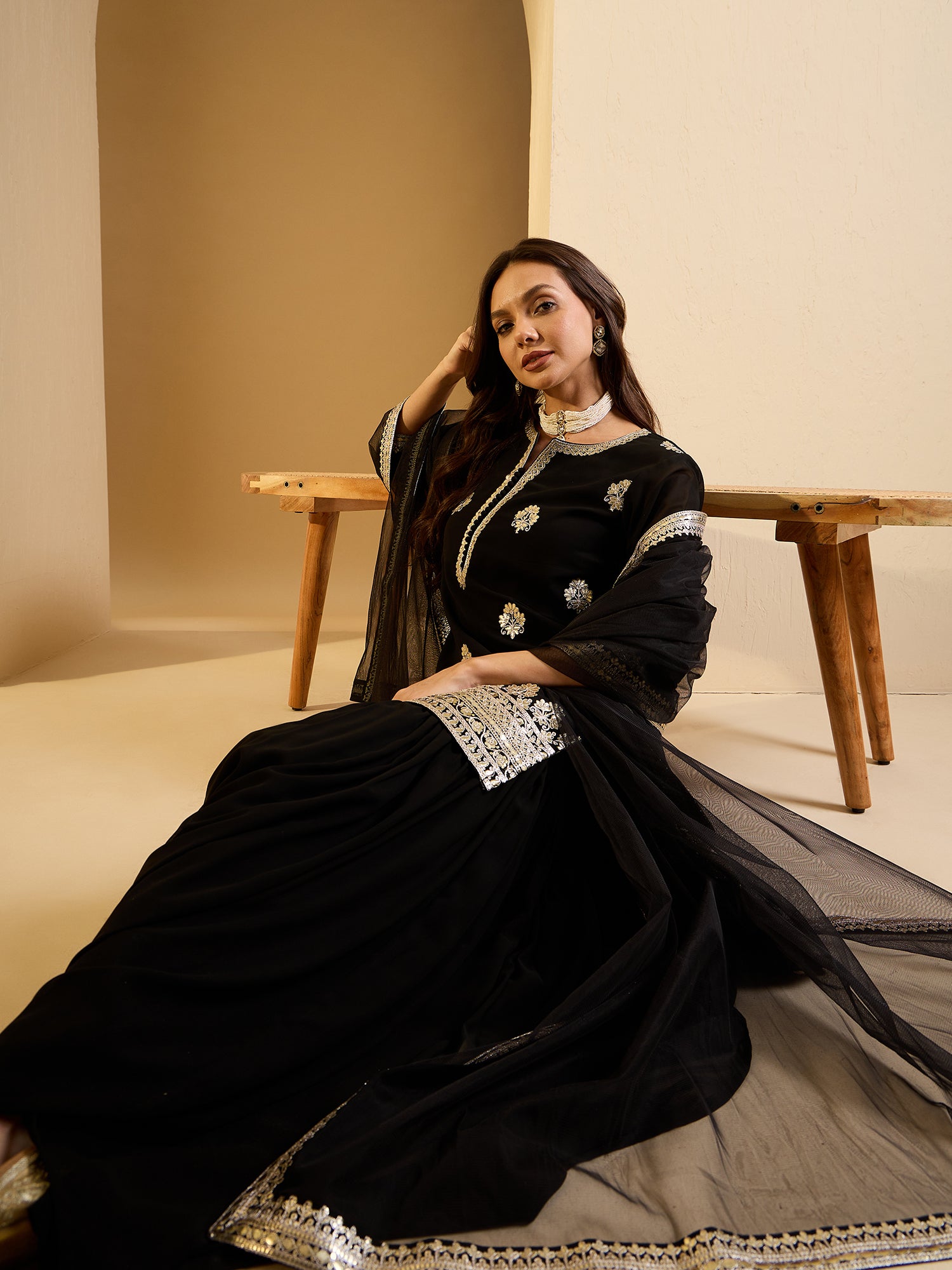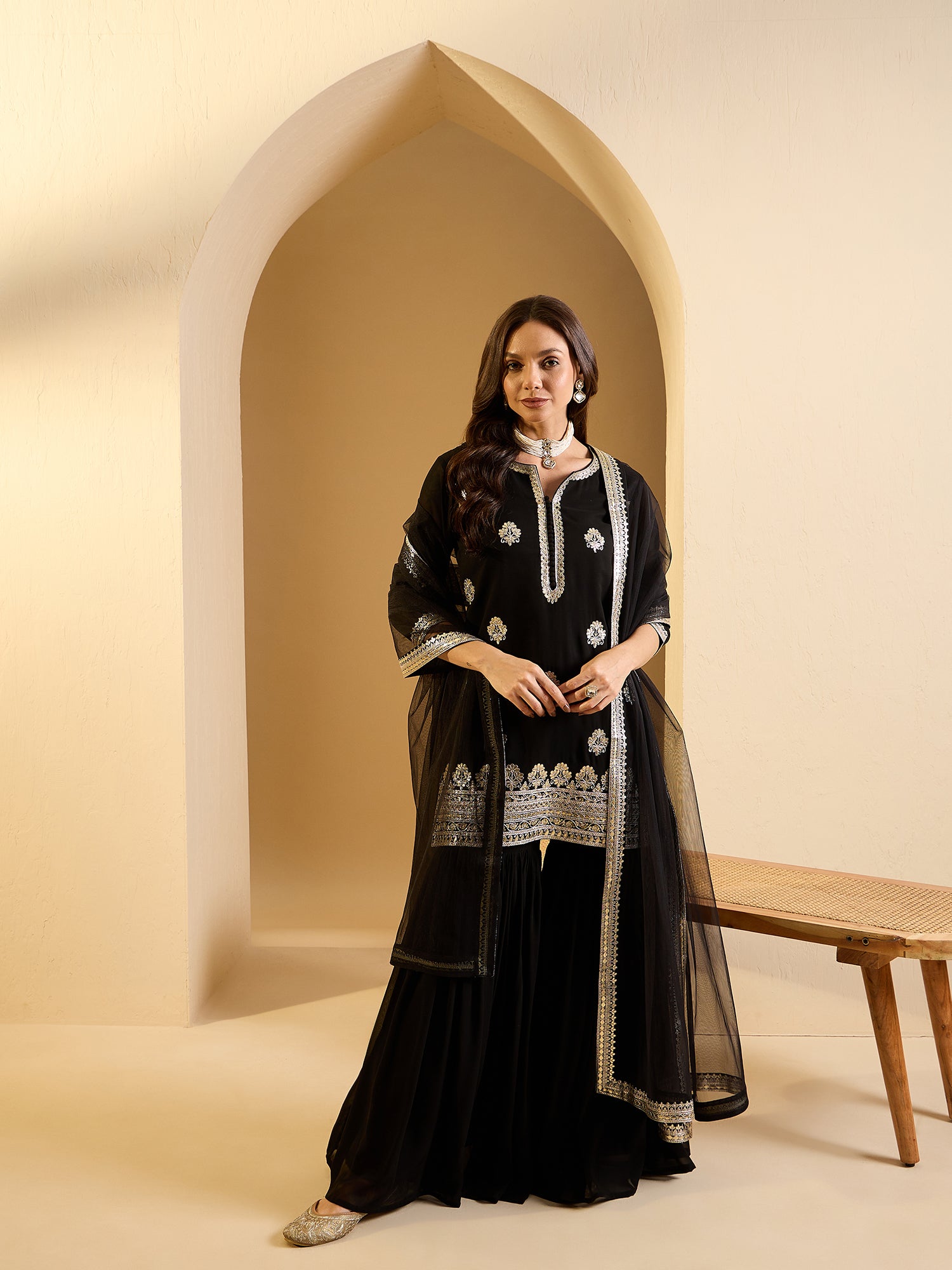 Become a fashionista with our women's black embroidered Kurti, featuring a straight shape and regular style. The floral embroidery and sequinned details add a touch of elegance, while the georgette fabric ensures a comfortable fit. Complete the look with our solid Sharara, featuring a partially elasticated waistband and slip-on closure for convenience.