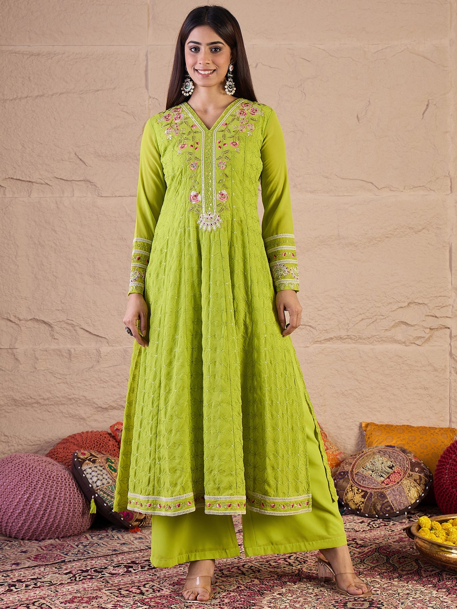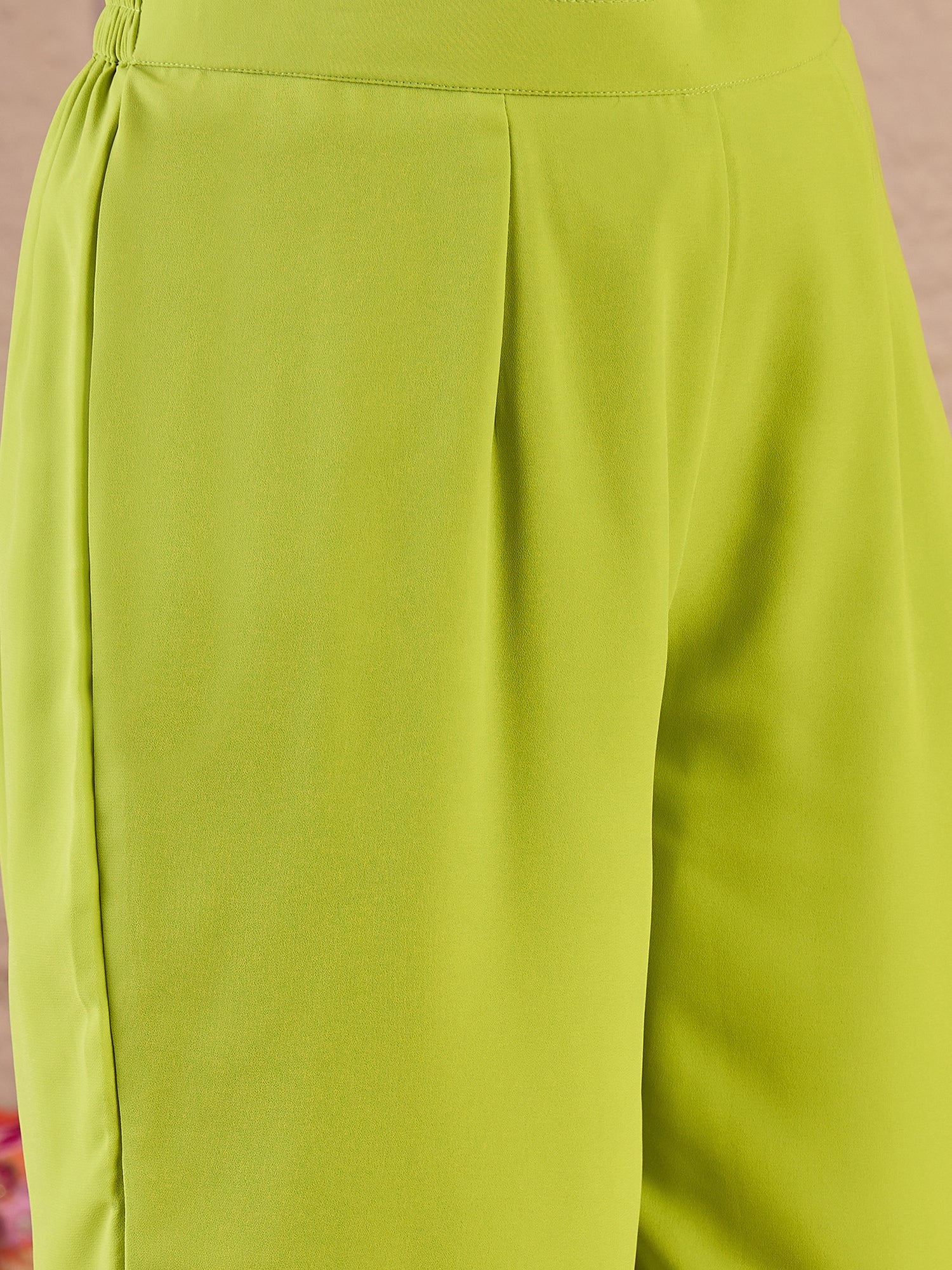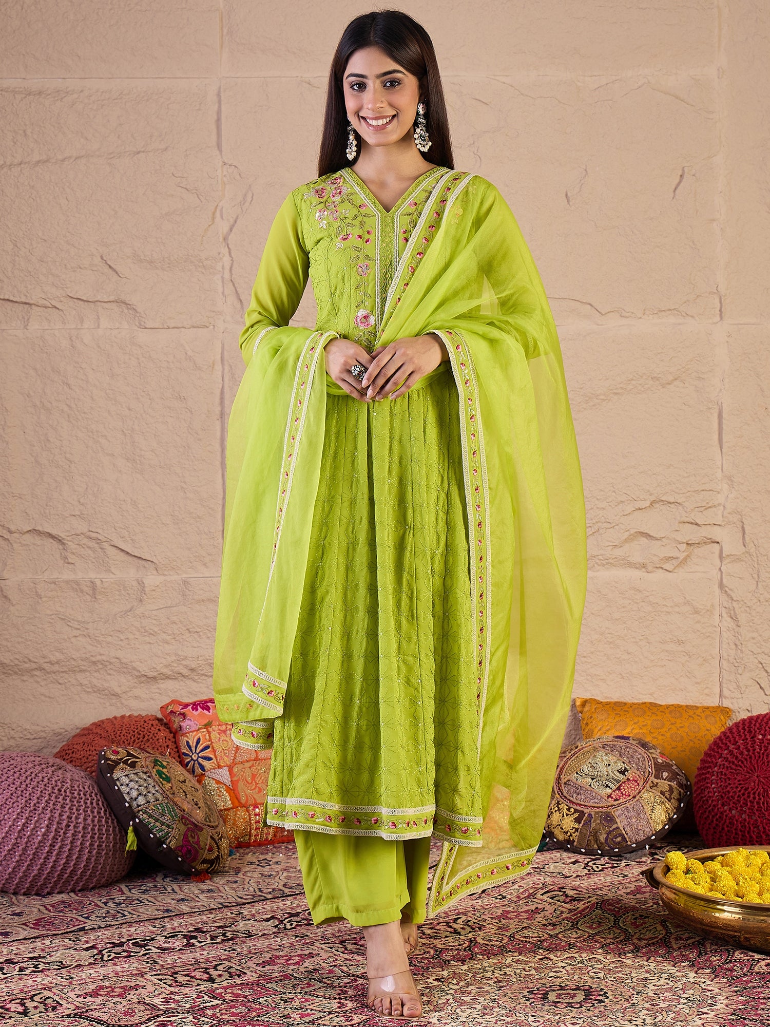 Lime green embroidered Kurta with Trousers with dupatta